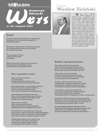 Wers magazyn literacki nr 20, sierpień 2009 Topola 1 Smukłość topoli zakorzeniona jest w mojej pamięci od dziecięcych lat. Jej strzelistość przypomina doskonałość gotyku. 2 Pod ołtarzem zbudowanym z cienia drzew śpi ojciec. Za chwilę obudzi się i zawoła, abym przyniósł garnuszek zimnej wody. Poezja Wiesław Zieliński W tym roku obchodzi 60-lecie urodzin (ur. się 6.05.1949 roku w Rzeszowie) oraz 30-lecie debiutu książkowego. Debiutował literacko wierszem Geometria w 1972 roku. Wydał zbiorki poezji: Zabawa w dorosłych (1979), Bogowie moich czterech ścian” (1981), Niestałość wiatru (1993), Przemijanie (1996), Odmiany miłości (2005), Syndrom Nabokowa (2007), Syndrom uczuć (2008), Żart Pana Boga (2009) oraz bajki dla dzieci wierszem. Dwie książki prozatorskie Ze sztambucha dawnego Rzeszowa (2000) i Magiczne miejsca, magiczne lata (2002), a także książkę krytycznoliteracką o środowisku Australii W krainie polskich kangurów (2004). Od 1990 roku, z przerwą na lata 1996 –1999, był do lutego 2009 r. prezesem rzeszowskiego oddziału Związku Literatów Polskich. Odszedł z tej funkcji, rezygnując uprzednio z przynależności do ZLP. 3 Z przymkniętymi oczyma, rozkoszował się będzie jej smakiem. 4 Jabłoń jest dla mnie symbolem macierzyństwa. Topola przypomina dobrotliwego ojca. Cień drzew skraca się z każdym rokiem. Sny o powtórce życia Wielu z nas odnosi wrażenie, że powtarza życie. Doznaje przyśpieszonego bicia serca na widok osób, które znane były wcześniej? Nie wiadomo tylko, czy w poprzednim wcieleniu, było nam lepiej, jak w obecnej wędrówce… Jeżeli sen jest przedsionkiem śmierci, życie stanowi uwolnienie nieśmiertelnej duszy. Łatwo przychodzi porozumieć się z tymi, którzy życzliwością dopełniają nasze marzenia. Wydaje się, że gładkość skóry bliskiej osoby, była dla nas od zawsze przyjazna. Uczeni mówią o fluidach, które otaczają aureole świętych. Załamane fale elektronicznych przekazów, zakłócają dwustronność telepatycznych myśli. W tej mistyczności rozumienia życia, niebo jest pełne banału, a ziemia na wskroś przesiąknięta podłością. Tymczasem szczęście istnieje tylko w naszej wyobraźni. Dobro tylko w święta i na pokaz, przegrywa ze złem. Radość zaprogramowana Aby naszej radość ktoś nie wypatrzył, starannie zakrywajmy ją przed oczami tych, którzy nie powinni widzieć naszego uśmiechu. Nie jest zbyt mądrze prowokować sukcesami. Należy dbać o właściwe proporcje, a nawet smutku zawsze winno być więcej, bo może nas dotknąć kolejny żart Pana Boga, a wówczas jeden krok do katastrofy! Szczęście i miłość powinny żyć w ukryciu, bo kiedy jedno i drugie nas spotyka, nie umiemy poradzić sobie z nadmiarem bogactwa, gdyż nie zostaliśmy zaprogramowani na zwyczajność. Świat dzieli się na wiecznych optymistów i tych, którzy narzekają nad rozlanym mlekiem. Ale Pan Bóg żartując z braku wyobraźni, wyznaczył podobne cele zadufanym w sobie i neurastenikom. Narcyzów nie obchodzi wewnętrzny skowyt kwiatów, łamanych porywem triumfalnego i bezmyślnego wiatru. Neurastenicy nie dostrzegają zagrożenia, wpatrując się w abstrakcyjną tęczę, łączącą niebo z ziemią. Na znak przegranej usłużnie podnieśmy twarze, dając sobie nałożyć kaganiec zaprogramowanej radości. Uśmiechajmy się ukradkiem, aby nikt nie odgadł tęsknoty za pragnieniem przeżywania zwyczajności. Dopóki jednak żyjemy, nikt nie zabroni nam śnić o niebie na ziemi, lub o zwyczajności w jakże nienaturalnym ludzkim świecie. Sny są próbą marzeń o lepszym trwaniu. I Proza Ryszard Sziler U rodził się 1 września 1950 roku w Jarosławiu. Uczęszczał do Liceum Ogólnokształcącego w Kańczudze. Filologię polską studiował na WSP w Rzeszowie i UJ w Krakowie. Pracował jako nauczyciel, następnie przez wiele lat pełnił funkcję kierownika działu oświatowego Muzeum Kultury Ludowej w Kolbuszowej. Mieszka w Kolbuszowej, pracuje w Wojewódzkim Domu Kultury w Rzeszowie. Zajmuje się grafiką, malarstwem, repuserstwem i literaturą. Od lat pisze zarówno wiersze, jak i prozę. Jest m.in. autorem jednoaktowego dramatu Spotkanie. KSIĘGA WIATRU II Stół – Tragedią jest tylko przeciwstawianie się swojemu losowi. Nic więcej – powiedziała babka. – Nie ! – krzyknął Tadeuszek. Maj był właśnie nabrzmiały zapachami i odcieniami kolorów. I w tym właśnie momencie w niewielkiej gliniance, w kałuży właściwie, utopił się Jaś, szkolny kolega Tadeuszka. Nic nie było w Jasiu aż tak niepowszedniego, by cokolwiek zmieniło się teraz w rytmie dni Tadeuszka, jednak ta śmierć zupełnie go oszołomiła. Po pierwsze rzeczywiście można umrzeć; po drugie , nawet teraz; po trzecie, jest się wtedy nieskończenie i do końca straszliwie umarłym. – Jakże tak? – Tak ma być – stwierdziła babka. – Dlaczego ? – nastawał Tadeuszek. – Bo tak ma być – powtórzyła babka. Tadeuszek pomyślał o tym wszystkim, co może dziać się jeszcze w maju, tak wyczekiwanym po zbyt długiej zimie i o wakacjach, które już teraz na pewno ominą Jasia i znowu krzyknął: – Po co? To nie jest sprawiedliwe! – Babka przystanęła i zamiotła spódnicą, aż posypały się kwiaty piaskowego maku. – Boję się – babka. – Oprócz siebie – dodała z westchnieniem – naprawdę nie ma się czego bać. W Tadeuszku jednak na długo zakorzenił się lęk przed możliwością niebycia Tadeuszkiem. A czym można byłoby być, gdyby się nim nie było? – Boże mój, jak ty mnie dziecko męczysz – stęknęła babka. Po- Poezja Jan Belcik U rodził s i ę w 1960 roku w Dukli. Mieszka w Krośnie. Autor zbiorów wierszy: W cieniu Cergowej (1989 – nagroda Fundacji A. Domagały-Iakuć), Fotografie nie przypadkowe (1995). Incognito (2001). Wiersze publikował także na łamach pism kulturalnych i regionalnych, w radiu i almanachach poezji; laureat wielu ogólnop