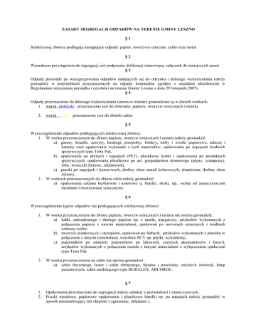 ZASADY SEGREGACJI ODPADÓW NA TERENIE GMINY LESZNO §1 Selektywnej zbiórce podlegają następujące odpady: papier, tworzywa sztuczne, szkło oraz metal. §2 Warunkiem przystąpienia do segregacji jest podpisanie deklaracji stanowiącej załącznik do niniejszych zasad. §3 Odpady pozostałe po wysegregowaniu odpadów nadających się do odzysku i dalszego wykorzystania należy gromadzić w pojemnikach przeznaczonych na odpady komunalne zgodnie z zasadami określonymi w Regulaminie utrzymania porządku i czystości na terenie Gminy Leszno z dnia 29 listopada 2007r. §4 Odpady przeznaczone do dalszego wykorzystania (surowce wtórne) gromadzone są w dwóch workach: 1. worek niebieski przeznaczony jest do zbierania: papieru, tworzyw sztucznych i metalu. 2. worek żółty przeznaczony jest do zbiórki szkła. §5 Wyszczególnienie odpadów podlegających selektywnej zbiórce: 1. W worku przeznaczonym do zbioru papieru, tworzyw sztucznych i metalu należy gromadzić: a) gazety, książki, zeszyty, katalogi, prospekty, foldery, torby i wtorki papierowe, tekturę i kartony oraz opakowania wykonane z tych materiałów, opakowania po napojach środkach spożywczych typu Tetra Pak, b) opakowania po płynach i napojach (PET), plastikowe kubki i opakowania po produktach spożywczych, opakowania plastikowe po art. gospodarstwa domowego (płyny, szampony), folie, woreczki foliowe, reklamówki, c) puszki po napojach i konserwach, drobny złom metali kolorowych, aluminium, drobny złom żelazny. 2. W workach przeznaczonych do zbioru szkła należy gromadzić: a) opakowania szklane bezbarwne i kolorowe tj. butelki, słoiki, itp., wolne od zanieczyszczeń metalami i tworzywami sztucznymi. §6 Wyszczególnienie typów odpadów nie podlegających selektywnej zbiórce: 1. W worku przeznaczonym do zbioru papieru, tworzyw sztucznych i metalu nie można gromadzić: a) kalki, zabrudzonego i tłustego papieru np. z masła, margaryny, artykułów wykonanych z połączenia papieru z innymi materiałami, opakowań po nawozach sztucznych i środkach ochrony roślin; b) tworzyw piankowych i styropianu, opakowań po farbach, artykułów wykonanych z plastiku w połączeniu z innymi materiałami, wyrobów PCV np. płytki, wykładziny; c) pojemników po smarach, pojemników po lakierach, zużytych akumulatorów i baterii, artykułów wykonanych z połączenia metalu z innymi materiałami z wyłączeniem opakowań typu Tetra Pak 2. W worku przeznaczonym na szkło nie można gromadzić: a) szkła tłuczonego, luster i szkła zbrojonego, fajansu i porcelany, zużytych żarówek, lamp jarzeniowych, szkła nietłukącego typu DURALEX, ARCOROC. §7 1. 2. Opakowania przeznaczone do segregacji należy opłukać z pozostałości i zanieczyszczeń . Puszki metalowe, papierowe opakowania i plastikowe butelki np. po napojach należy gromadzić w sposób minimalizujący ich objętość ( zgniatanie, składanie ). §8 Obowiązkiem właściciela nieruchomości biorącego udział w selektywnej zbiórce odpadów jest oznakowanie worka z odpadami w następujący sposób: - pierwsza liczba będzie odpowiadała kodowi ulicy określonemu w tabeli poniżej, - druga liczba będzie odpowiadała numerowi posesji. §9 Odpady segregowane w sposób nie uwzględniający zasad określonych w § 1 – 8 będą traktowane jak odpady zmieszane ( nie poddane segregacji ) i odbierane z terenu posesji wyłącznie odpłatnie. § 10 Worki z odpadami będą odbierane w każdy drugi piątek miesiąca. § 11 Worki z odpadami należy wystawiać przed posesję między godziną 7 a 9 rano. § 12 Worki z odpadami wystawione później niż to określono w § 11 nie będą odbierane. Miejscowość Wólka Wiktorów Feliksów Ulica Al. Brzóz Cicha Jaśminowa Parkowa Topolowa Wiśniowa Kod 145 146 147 148 149 150 Ziołowa 155 Akacjowa Dworkowa Chabrowa Krokusowa Leśna Lipowa Niezapominajek Parkowa Pogodna Przyleśna Rybno Stokrotki Stołeczna Topolowa Wrzosowa Jesionowa 92 93 9 10 28 95 11 96 97 98 8 13 25 99 12 152 Apteczna Graniczna Kujawskiego Południowa Stołeczna Świerkowa 86 87 88 89 90 26 91 Termin odbioru W każdy drugi piątek miesiąca W każdy drugi piątek miesiąca W każdy drugi czwartek miesiąca