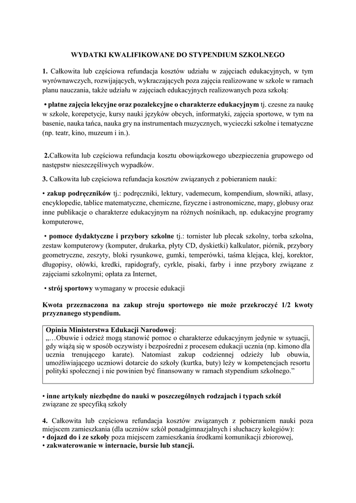 WYDATKI KWALIFIKOWANE DO STYPENDIUM SZKOLNEGO 1. Całkowita lub częściowa refundacja kosztów udziału w zajęciach edukacyjnych, w tym wyrównawczych, rozwijających, wykraczających poza zajęcia realizowane w szkole w ramach planu nauczania, także udziału w zajęciach edukacyjnych realizowanych poza szkołą: • płatne zajęcia lekcyjne oraz pozalekcyjne o charakterze edukacyjnym tj. czesne za naukę w szkole, korepetycje, kursy nauki języków obcych, informatyki, zajęcia sportowe, w tym na basenie, nauka tańca, nauka gry na instrumentach muzycznych, wycieczki szkolne i tematyczne (np. teatr, kino, muzeum i in.). 2.Całkowita lub częściowa refundacja kosztu obowiązkowego ubezpieczenia grupowego od następstw nieszczęśliwych wypadków. 3. Całkowita lub częściowa refundacja kosztów związanych z pobieraniem nauki: • zakup podręczników tj.: podręczniki, lektury, vademecum, kompendium, słowniki, atlasy, encyklopedie, tablice matematyczne, chemiczne, fizyczne i astronomiczne, mapy, globusy oraz inne publikacje o charakterze edukacyjnym na różnych nośnikach, np. edukacyjne programy komputerowe, • pomoce dydaktyczne i przybory szkolne tj.: tornister lub plecak szkolny, torba szkolna, zestaw komputerowy (komputer, drukarka, płyty CD, dyskietki) kalkulator, piórnik, przybory geometryczne, zeszyty, bloki rysunkowe, gumki, temperówki, taśma klejąca, klej, korektor, długopisy, ołówki, kredki, rapidografy, cyrkle, pisaki, farby i inne przybory związane z zajęciami szkolnymi; opłata za Internet, • strój sportowy wymagany w procesie edukacji Kwota przeznaczona na zakup stroju sportowego nie może przekroczyć 1/2 kwoty przyznanego stypendium. Opinia Ministerstwa Edukacji Narodowej: „…Obuwie i odzież mogą stanowić pomoc o charakterze edukacyjnym jedynie w sytuacji, gdy wiążą się w sposób oczywisty i bezpośredni z procesem edukacji ucznia (np. kimono dla ucznia trenującego karate). Natomiast zakup codziennej odzieży lub obuwia, umożliwiającego uczniowi dotarcie do szkoły (kurtka, buty) leży w kompetencjach resortu polityki społecznej i nie powinien być finansowany w ramach stypendium szkolnego.” • inne artykuły niezbędne do nauki w poszczególnych rodzajach i typach szkół związane ze specyfiką szkoły 4. Całkowita lub częściowa refundacja kosztów związanych z pobieraniem nauki poza miejscem zamieszkania (dla uczniów szkół ponadgimnazjalnych i słuchaczy kolegiów): • dojazd do i ze szkoły poza miejscem zamieszkania środkami komunikacji zbiorowej, • zakwaterowanie w internacie, bursie lub stancji.