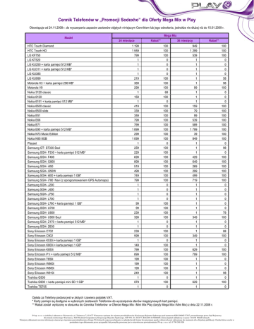 Cennik Telefonów w „Promocji Sodexho” dla Oferty Mega Mix w Play Obowiązuje od 24.11.2008 r. do wyczerpania zapasów zestawów objętych niniejszym Cennikiem lub jego odwołania, jednakże nie dłużej niż do 15.01.2009 r. Model HTC Touch Diamond HTC Touch HD LG KF750 LG KT520 LG KU250 + karta pamięci 512 MB* LG KU311 + karta pamięci 512 MB* LG KU385 LG KU990 Motorola K3 + karta pamięci 256 MB* Motorola V9 Nokia 3120 classic Nokia 6120 Nokia 6151 + karta pamięci 512 MB* Nokia 6500 classic Nokia 6500 slide Nokia E51 Nokia E66 Nokia E71 Nokia E90 + karta pamięci 512 MB* Nokia N73 Music Edition Nokia N95 8GB Playset Samsung GT- S7330 Soul Samsung SGH- F330 + karta pamięci 512 MB* Samsung SGH- F480 Samsung SGH- G800 Samsung SGH- i450 Samsung SGH- i550W Samsung SGH- i600 + karta pamięci 1 GB* Samsung SGH- i780 Navi (z oprogramowaniem GPS Automapa) Samsung SGH- J200 Samsung SGH- J400 Samsung SGH- J750 Samsung SGH- L700 Samsung SGH- L760 + karta pamięci 1 GB* Samsung SGH- U700 Samsung SGH- U800 Samsung SGH- U900 Soul Samsung SGH- Z170 + karta pamięci 512 MB* Samsung SGH- Z630 Sony Ericsson C702 Sony Ericsson C902 Sony Ericsson K530i + karta pamięci 1 GB* Sony Ericsson K800i + karta pamięci 1 GB* Sony Ericsson K850i Sony Ericsson P1i + karta pamięci 512 MB* Sony Ericsson T650i Sony Ericsson W660i Sony Ericsson W880i Sony Ericsson W910i Toshiba G500 Toshiba G900 + karta pamięci mini SD 1 GB* Toshiba TS705 Mega Mix 24 miesiące 1 199 1 559 799 1 1 1 1 219 369 299 1 159 1 419 339 359 799 799 1 899 299 1 099 1 259 229 699 899 519 499 749 799 1 1 1 1 99 99 239 399 1 1 239 599 1 149 799 899 199 199 199 249 1 879 1 Rabat** 36 miesięcy 100 100 100 0 0 0 0 100 100 100 68 100 0 100 100 100 100 100 100 100 100 0 100 100 100 100 100 100 100 100 0 0 0 0 100 100 100 100 0 0 100 100 0 100 100 100 100 100 100 100 0 100 0 Rabat** 949 1 299 539 1 1 1 1 1 1 99 1 1 1 159 79 99 539 589 1 799 39 849 1 1 1 429 649 269 299 499 719 1 1 1 1 1 1 1 349 1 1 1 349 1 1 629 799 1 1 1 1 1 629 1 100 100 100 0 0 0 0 58 98 100 0 0 0 100 100 100 100 100 100 100 100 0 98 0 100 100 100 100 100 100 0 0 0 0 0 0 78 100 0 0 88 100 0 0 100 100 0 0 0 98 0 100 0 Opłata za Telefony podana jest w złotych i zawiera podatek VAT. * Karty pamięci są dostępne w wybranych zestawach Telefonów do wyczerpania stanów magazynowych kart pamięci. ** Rabat został wyliczony w stosunku do Cennika Telefonów w Ofercie Mega Mix i Mini Mix Play (taryfy Mega Mix i Mini Mix) z dnia 22.11.2008 r. P4 sp. z o.o. z siedzibą i adresem w Warszawie, ul. Taśmowa 7, 02-677 Warszawa wpisana do rejestru przedsiębiorców Krajowego Rejestru Sądowego pod numerem KRS 0000217207, prowadzonego przez Sąd Rejonowy dla miasta stołecznego Warszawy, XIII Wydział Gospodarczy Krajowego Rejestru Sądowego, NIP 951-21-20-077, REGON 015808609, której kapitał zakładowy wynosi: 30 658 500,00 złotych. Niniejszy dokument zawiera informacje stanowiące tajemnicę przedsiębiorstwa Grupy P4, których rozpowszechnianie w jakiejkolwiek formie bez pisemnej zgody właściciela jest zabronione do momentu ich oficjalnej publikacji. Osoba która weszła w posiadanie tego dokumentu przez przypadek lub pomyłkę proszona jest o niezwłoczne powiadomienie P4 sp. z o.o. tel. 0 790 500 500 Blokada SIM LOCK: 1. Oferowane w ramach Oferty Mini Mix oraz Mega Mix w PLAY Telefony posiadają blokadę SIM Lock i mogą działać wyłącznie z kartą SIM/USIM sieci PLAY. 2. Abonent może żądać usunięcia blokady SIM Lock w Punktach Sprzedaży P4 po upływie okresu zastrzeżonego. Blokada SIM Lock usuwana jest w ramach istniejących możliwości technicznych. 3. W przypadku usunięcia blokady SIM Lock poza Punktach Sprzedaży P4 w sposób nie uzgodniony z P4 Abonent może stracić prawo do bezpłatnej obsługi serwisowej Telefonu w ramach gwarancji, rękojmi lub uprawnień z tytułu niezgodności z umową, jeżeli wada / niezgodność z umową powstała na skutek usunięcia blokady SIM Lock. Promocyjne ceny Telefonów: 1. Przy zawieraniu Umowy w ramach Oferty, PLAY umożliwi Abonentowi zakup Telefonu na warunkach cenowych określonych w niniejszym Cenniku. 2. P4 zastrzega, iż dostępność poszczególnych modeli Telefonów uzależniona jest od aktualnych stanów magazynowych Punktów Sprzedaży P4. P4 sp. z o.o. z siedzibą i adresem w Warszawie, ul. Taśmowa 7, 02-677 Warszawa wpisana do rejestru przedsiębiorców Krajowego Rejestru Sądowego pod numerem KRS 0000217207, prowadzonego przez Sąd Rejonowy dla miasta stołecznego Warszawy, XIII Wydział Gospodarczy Krajowego Rejestru Sądowego, NIP 951-21-20-077, REGON 015808609, której kapitał zakładowy wynosi: 30 658 500,00 złotych. Niniejszy dokument zawiera informacje stanowiące tajemnicę przedsiębiorstwa Grupy P4, których rozpowszechnianie w jakiejkolwiek formie bez pisemnej zgody właściciela jest zabronione do momentu ich oficjalnej publikacji. Osoba która weszła w posiadanie tego dokumentu przez przypadek lub pomyłkę proszona jest o niezwłoczne powiadomienie P4 sp. z o.o. tel. 0 790 500 500