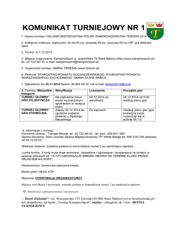 KOMUNIKAT TURNIEJOWY NR 1 1. Nazwa turnieju: HALOWE MISTRZOSTWA POLSKI SAMORZĄDOWCÓW TERESIN 2014 2. Kategoria wiekowa: mężczyźni: do lat 45-ciu, powyżej 45-ciu, powyżej 55-ciu VIP ,gra deblowa open. 3. Termin: 5-7.12.2014 4. Miejsce rozgrywania: KampinoSport ul. Izabelińska 79 Stare Babice (http://www.kampinosport.pl) tel. 22-722-90-32, e-mail: [email protected] 5. Organizator turnieju: GMINA TERESIN (www.teresin.pl) 6. Patronat: STAROSTWO POWIATU SOCHACZEWSKIEGO, STAROSTWO POWIATU WARSZAWSKIEGO ZACHODNIEGO, GMINA STARE BABICE, 7. Zgłoszenia: do 30.11.2014 faxem: 46 864 25 32, lub e-mail: [email protected] 8. Terminy: Wszystkie kategorie TURNIEJ GŁÓWNY GRA POJEDYNCZA TURNIEJ GŁÓWNY GRA PODWÓJNA Weryfikacja Losowanie Początek gier Na piętnaście minut przed wyznaczonym spotkaniem w recepcji klubu. Zapisy 05.12.2014 do (godzina zostanie podana) u Sędziego Naczelnego 04.12.2014 po weryfikacji 05.12.2014 od 9.00 według planu gier Po zapisach Według planu gier (gra podwójna może rozpocząć się w sobotę 06.12) 9. Informacje o turnieju: Kierownik obiektu : Tomasz Musiał, tel. 22 722-90-32 ; tel. kom. 500-001-390 Sędzia Naczelny: Ariel Lisowski Sędzia Międzynarodowy ITF White Badge tel. 606-216-704 (aktywny od 04.12.2014) Wielkość drabinki: zostanie podana w komunikacie numer 2 po zamknięciu zapisów. Liczba kortów: 3 korty kryte (hale tenisowe), oświetlone i ogrzewane ( temperatura na kortach w sezonie zimowym ok. 10-12º) OBOWIĄZUJE ZMIANA OBUWIA NA TERENIE KLUBU PRZED WEJŚCIEM NA KORT! Nawierzchnia: dywanowa (sztuczna trawa) Marka piłek: HEAD ATP Wpisowe: POKRYWAJĄ ORGANIZATORZY. Miejsce weryfikacji i losowania: zostanie podane w komunikacie numer 2 po zamknięciu zapisów 10. Możliwości zakwaterowania i wyżywienia: Hotel Zielonki** (ul. Warszawska 372 Zielonki 05-082 Stare Babice) www.hotelzielonki.pl inf. dodatkowe: na hasło „Turniej KampinoSport” zniżka– odległość ok 3 km –HOTEL TURNIEJOWY Hotel Splendor**** (ul. Warszawska 197E Nowe Babice) www.hotelsplendor.com.pl - inf. dodatkowe: na hasło: „Turniej KampinoSport” zniżka - odległość od Klubu ok 5 km Hotel Kamrat (ul. Ogrodnicza 9 Babice Nowe) www.restauracja.kamrat.oit.pl/hotel.php -inf. dodatkowe: na hasło: „Turniej KampinoSport” zniżka - odległość od Klubu ok 4 km Hotel Stawisko** (ul. Ciećwierza 14, 05 – 080 Klaudyn) www.stawisko.com.pl – inf. dodatkowe: na hasło „Turniej KampinoSport” zniżka – odległość ok. 4 km. Dodatkowe możliwości zakwaterowania: Hotel Rest (Mory, ul. Poznańska 33) www.resthotel.pl - inf. dodatkowe: odległość od Klubu ok 11 km. Hotel Blizne (ul. Kochanowskiego 16, Blizne Jasińskiego) www.hotelzajazd.cba.pl/contact.html - inf. dodatkowe: odległość od Klubu ok 6 km. Hotel Babice (ul. Warszawska 344, Stare Babice) www.hotelbabice.pl - inf. dodatkowe: odległość od Klubu ok 4 km. W hotelu turniejowym będą znajdowały się drabinki turniejowe, plany gier. Każdy uczestnik dokonuje rezerwacji samodzielnie. Wyżywienie: na obiekcie za dodatkową opłat (catering) dwudaniowy obiad, kanapki słodycze, napoje zimne i ciepłe. 11. Inne informacje: Oficjalne otwarcie turnieju w dniu 05.12.2014, godzina zostanie podana 06.12 (sobota) organizatorzy zapraszają wszystkich uczestników turnieju na uroczystą kolację ( ok. godz.19.00) Na terenie Klubu KampinoSport dostępne są szatnie z zapleczem sanitarnym. Do dyspozycji Uczestników Turnieju udostępniona zostanie nieodpłatnie grota solna (wstęp po wcześniejszym kontakcie z recepcją Klubu). 12. Nagrody: Puchary/statuetki, medale, atrakcyjne nagrody rzeczowe, upominki dla wszystkich uczestników turnieju.