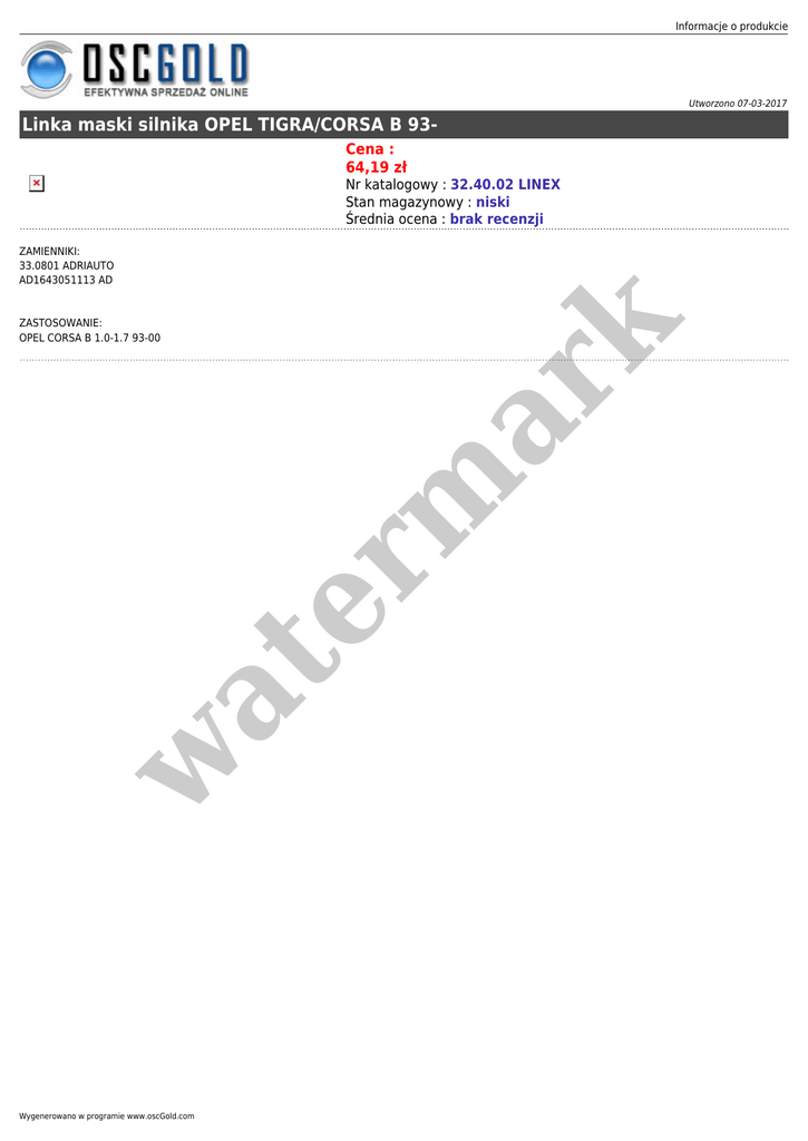 Informacje o produkcie Utworzono 07-03-2017 Linka maski silnika OPEL TIGRA/CORSA B 93Cena : 64,19 zł Nr katalogowy : 32.40.02 LINEX Stan magazynowy : niski Średnia ocena : brak recenzji w at ZASTOSOWANIE: OPEL CORSA B 1.0-1.7 93-00 er m ar k ZAMIENNIKI: 33.0801 ADRIAUTO AD1643051113 AD Wygenerowano w programie www.oscGold.com