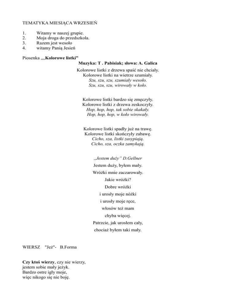 TEMATYKA MIESIĄCA WRZESIEŃ 1. 2. 3. 4. Witamy w naszej grupie. Moja droga do przedszkola. Razem jest wesoło witamy Panią Jesień Piosenka „„Kolorowe listki” Muzyka: T . Pabisiak; słowa: A. Galica Kolorowe listki z drzewa spaść nie chciały. Kolorowe listki na wietrze szumiały. Szu, szu, szu, szumiały wesoło. Szu, szu, szu, wirowały w koło. Kolorowe listki bardzo się zmęczyły. Kolorowe listki z drzewa zeskoczyły. Hop, hop, hop, tak sobie skakały. Hop, hop, hop, w koło wirowały. Kolorowe listki spadły już na trawę. Kolorowe listki skończyły zabawę. Cicho, sza, listki zasypiają. Cicho, sza, oczka zamykają. ,,Jestem duży” D.Gellner Jestem duży, byłem mały. Wróżki mnie zaczarowały. Jakie wróżki? Dobre wróżki i urosły moje nóżki i urosły moje ręce, włosów też mam chyba więcej. Patrzcie, jak urosłem cały, chociaż byłem taki mały. WIERSZ "Jeż"- B.Forma Czy ktoś wierzy, czy nie wierzy, jestem sobie mały jeżyk. Bardzo ostre igły moje, więc nikogo się nie boję. Często w cieniu sobie siedzę, jem szkodniki, spulchniam glebę. Jeżyk bardzo dobrze słyszy, w nocy umie łowić myszy. Gdy nadciąga groźna zima, smacznie w norce spać zaczynam. Pod pierzyną z suchych liści pewnie mi się lato przyśni.