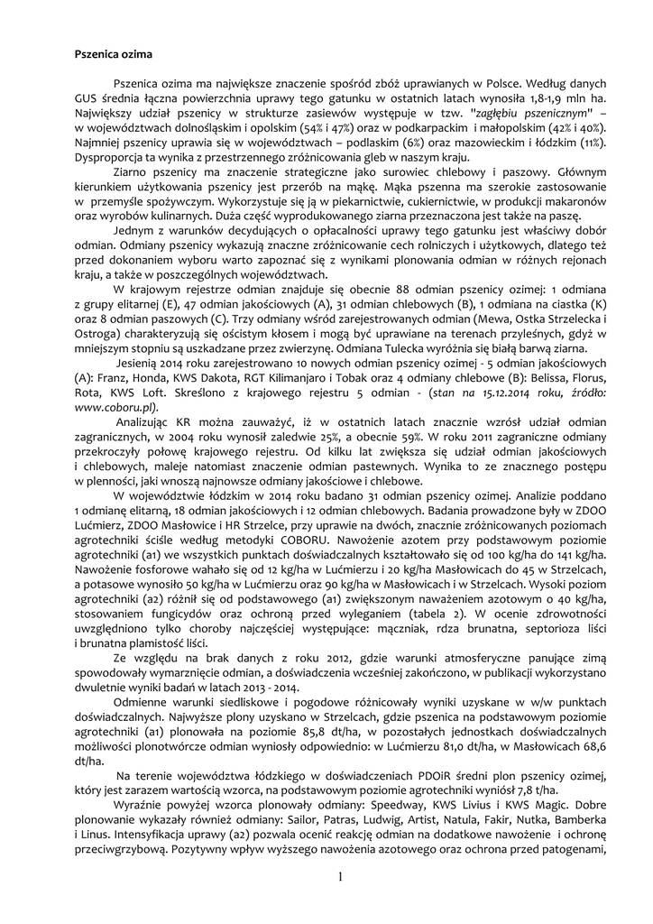 Pszenica ozima Pszenica ozima ma największe znaczenie spośród zbóż uprawianych w Polsce. Według danych GUS średnia łączna powierzchnia uprawy tego gatunku w ostatnich latach wynosiła 1,8-1,9 mln ha. Największy udział pszenicy w strukturze zasiewów występuje w tzw. "zagłębiu pszenicznym" – w województwach dolnośląskim i opolskim (54% i 47%) oraz w podkarpackim i małopolskim (42% i 40%). Najmniej pszenicy uprawia się w województwach – podlaskim (6%) oraz mazowieckim i łódzkim (11%). Dysproporcja ta wynika z przestrzennego zróżnicowania gleb w naszym kraju. Ziarno pszenicy ma znaczenie strategiczne jako surowiec chlebowy i paszowy. Głównym kierunkiem użytkowania pszenicy jest przerób na mąkę. Mąka pszenna ma szerokie zastosowanie w przemyśle spożywczym. Wykorzystuje się ją w piekarnictwie, cukiernictwie, w produkcji makaronów oraz wyrobów kulinarnych. Duża część wyprodukowanego ziarna przeznaczona jest także na paszę. Jednym z warunków decydujących o opłacalności uprawy tego gatunku jest właściwy dobór odmian. Odmiany pszenicy wykazują znaczne zróżnicowanie cech rolniczych i użytkowych, dlatego też przed dokonaniem wyboru warto zapoznać się z wynikami plonowania odmian w różnych rejonach kraju, a także w poszczególnych województwach. W krajowym rejestrze odmian znajduje się obecnie 88 odmian pszenicy ozimej: 1 odmiana z grupy elitarnej (E), 47 odmian jakościowych (A), 31 odmian chlebowych (B), 1 odmiana na ciastka (K) oraz 8 odmian paszowych (C). Trzy odmiany wśród zarejestrowanych odmian (Mewa, Ostka Strzelecka i Ostroga) charakteryzują się ościstym kłosem i mogą być uprawiane na terenach przyleśnych, gdyż w mniejszym stopniu są uszkadzane przez zwierzynę. Odmiana Tulecka wyróżnia się białą barwą ziarna. Jesienią 2014 roku zarejestrowano 10 nowych odmian pszenicy ozimej - 5 odmian jakościowych (A): Franz, Honda, KWS Dakota, RGT Kilimanjaro i Tobak oraz 4 odmiany chlebowe (B): Belissa, Florus, Rota, KWS Loft. Skreślono z krajowego rejestru 5 odmian - (stan na 15.12.2014 roku, źródło: www.coboru.pl). Analizując KR można zauważyć, iż w ostatnich latach znacznie wzrósł udział odmian zagranicznych, w 2004 roku wynosił zaledwie 25%, a obecnie 59%. W roku 2011 zagraniczne odmiany przekroczyły połowę krajowego rejestru. Od kilku lat zwiększa się udział odmian jakościowych i chlebowych, maleje natomiast znaczenie odmian pastewnych. Wynika to ze znacznego postępu w plenności, jaki wnoszą najnowsze odmiany jakościowe i chlebowe. W województwie łódzkim w 2014 roku badano 31 odmian pszenicy ozimej. Analizie poddano 1 odmianę elitarną, 18 odmian jakościowych i 12 odmian chlebowych. Badania prowadzone były w ZDOO Lućmierz, ZDOO Masłowice i HR Strzelce, przy uprawie na dwóch, znacznie zróżnicowanych poziomach agrotechniki ściśle według metodyki COBORU. Nawożenie azotem przy podstawowym poziomie agrotechniki (a1) we wszystkich punktach doświadczalnych kształtowało się od 100 kg/ha do 141 kg/ha. Nawożenie fosforowe wahało się od 12 kg/ha w Lućmierzu i 20 kg/ha Masłowicach do 45 w Strzelcach, a potasowe wynosiło 50 kg/ha w Lućmierzu oraz 90 kg/ha w Masłowicach i w Strzelcach. Wysoki poziom agrotechniki (a2) różnił się od podstawowego (a1) zwiększonym naważeniem azotowym o 40 kg/ha, stosowaniem fungicydów oraz ochroną przed wyleganiem (tabela 2). W ocenie zdrowotności uwzględniono tylko choroby najczęściej występujące: mączniak, rdza brunatna, septorioza liści i brunatna plamistość liści. Ze względu na brak danych z roku 2012, gdzie warunki atmosferyczne panujące zimą spowodowały wymarznięcie odmian, a doświadczenia wcześniej zakończono, w publikacji wykorzystano dwuletnie wyniki badań w latach 2013 - 2014. Odmienne warunki siedliskowe i pogodowe różnicowały wyniki uzyskane w w/w punktach doświadczalnych. Najwyższe plony uzyskano w Strzelcach, gdzie pszenica na podstawowym poziomie agrotechniki (a1) plonowała na poziomie 85,8 dt/ha, w pozostałych jednostkach doświadczalnych możliwości plonotwórcze odmian wyniosły odpowiednio: w Lućmierzu 81,0 dt/ha, w Masłowicach 68,6 dt/ha. Na terenie województwa łódzkiego w doświadczeniach PDOiR średni plon pszenicy ozimej, który jest zarazem wartością wzorca, na podstawowym poziomie agrotechniki wyniósł 7,8 t/ha. Wyraźnie powyżej wzorca plonowały odmiany: Speedway, KWS Livius i KWS Magic. Dobre plonowanie wykazały również odmiany: Sailor, Patras, Ludwig, Artist, Natula, Fakir, Nutka, Bamberka i Linus. Intensyfikacja uprawy (a2) pozwala ocenić reakcję odmian na dodatkowe nawożenie i ochronę przeciwgrzybową. Pozytywny wpływ wyższego nawożenia azotowego oraz ochrona przed patogenami, 1 zastosowanie retardantów przyczyniły się do wzrostu plonotwórczego pszenicy ozimej średnio aż o 9,3 dt/ha. Najbardziej wdzięcznymi za taką uprawę były odmiany: Speedway, KWS Magic, Patras, Fakir, Ludwig, Artist i KWS Livius. Obfite opady deszczu, od maja do sierpnia, przyczyniły się do znacznego wylegania odmian i rozwoju chorób grzybowych. Stopień porażenia chorobami był zróżnicowany (tabela 6). Należy podkreślić, że odmiany: Arkadia, Lavantus, Astoria i Tonacja cechowały się mniejszą odpornością na mączniaka, natomiast: Speedway, Skagen, Muszelka, KWS Ozon i Artist wykazały większą odporność na tę chorobę. Odmiany immunne na patogen rdzy brunatnej to: Linus, Praktik, Nutka, Muszelka, KWS Ozon, KWS Magic, Platin, Speedway, Artist i Pengar. Mniejszą odpornością wykazały się odmiany: Arkadia, Figura i KWS Livius. Septoriozą liści najbardziej porażały się odmiany: Natula, Forum, Skagen, Smuga i Artist, a brunatną plamistością liści Natula i Arkadia. W fazie dojrzałości mlecznej i przed zbiorem na poziomie agrotechnicznym z zastosowanym regulatorem wzrostu wyleganie odmian odnotowano jedynie w Strzelcach. Przed zbiorem, na podstawowym poziomie
