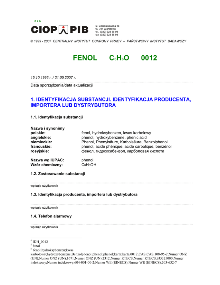 # $ K ul. Czerniakowska 16 00-701 Warszawa tel. (022) 623 36 98 fax (022) 623 36 93 © 1999 - 2007 CENTRALNY INSTYTUT OCHRONY PRACY – PAŃSTWOWY INSTYTUT BADAWCZY FENOL C6H6O 0012 15.10.1993 r. / 31.05.2007 r. ..................................................................................................................................................................................... Data sporządzenia/data aktualizacji 1. IDENTYFIKACJA SUBSTANCJI. IDENTYFIKACJA PRODUCENTA, IMPORTERA LUB DYSTRYBUTORA 1.1. Identyfikacja substancji Nazwa i synonimy polskie: angielskie: niemieckie: francuskie: rosyjskie: fenol, hydroksybenzen, kwas karbolowy phenol, hydroxybenzene, phenic acid Phenol, Phenylsäure, Karbolsäure, Benzolphenol phénol, acide phénique, acide carbolique, benzénol фенол, гидроксибензол, карболовая кислота Nazwa wg IUPAC: Wzór chemiczny: phenol C6H5OH 1.2. Zastosowanie substancji ..................................................................................................................................................................................... wpisuje użytkownik 1.3. Identyfikacja producenta, importera lub dystrybutora ..................................................................................................................................................................................... wpisuje użytkownik 1.4. Telefon alarmowy ..................................................................................................................................................................................... wpisuje użytkownik # IDH_0012 fenol K fenol;hydroksybenzen;kwas karbolowy;hydroxybenzene;Benzolphenol;phénol;phenol;karta;karta,0012;CAS;CAS,108-95-2;Numer ONZ (UN);Numer ONZ (UN),1671;Numer ONZ (UN),2312;Numer RTECS;Numer RTECS,SJ3325000;Numer indeksowy;Numer indeksowy,604-001-00-2;Numer WE (EINECS);Numer WE (EINECS),203-632-7 $ 2. SKŁAD I INFORMACJA O SKŁADNIKACH Fenol – substancja podstawowa Klasyfikacja substancji: Muta. Kat. 3; R68 T; R23/24/25 Xn; R48/20/21/22 C; R34 Numer CAS: Numer UN (ONZ): Numer RTECS: Numer indeksowy: Numer WE (EINECS): 108-95-2 1671 – stały, 2312 – stopiony SJ3325000 604-001-00-2 203-632-7 3. IDENTYFIKACJA ZAGROŻEŃ Substancja mutagenna (kat. 3), toksyczna, szkodliwa i żrąca. Możliwe ryzyko powstania nieodwracalnych zmian w stanie zdrowia. Działa toksycznie przez drogi oddechowe, w kontakcie ze skórą i po połknięciu. Działa szkodliwie przez drogi oddechowe, w kontakcie ze skórą i po połknięciu; stwarza poważne zagrożenie zdrowia w następstwie długotrwałego narażenia. Powoduje oparzenia. 4. PIERWSZA POMOC Niezbędne leki: tlen, hydrokortyzon. Odtrutki: nie są znane. Leczenie: postępowanie objawowe. ZATRUCIE INHALACYJNE Przytomny Pierwsza pomoc przedlekarska Wyprowadzić zatrutego z miejsca narażenia, zapewnić spokój w dowolnej pozycji. Podawać tlen do oddychania, najlepiej przez maskę. Wezwać lekarza. Pomoc lekarska Kontynuować podawanie tlenu; w razie spadku ciśnienia tętniczego krwi można podać hydrokortyzon dożylnie. Transport karetką reanimacyjną PR do szpitala bez przerywania leczenia, pod nadzorem lekarza. Nieprzytomny Pierwsza pomoc przedlekarska Wynieść zatrutego z miejsca narażenia. Ułożyć w pozycji bocznej ustalonej. Usunąć z jamy ustnej protezy i inne ruchome ciała obce. Odessać przez cewnik strzykawką wydzielinę z nosa i jamy ustnej. Jeżeli zatruty oddycha, podać tlen przez maskę. Jeżeli nie oddycha, zastosować sztuczne oddychanie metodą usta-usta albo aparatem typu AMBU. Założyć stałą drogę dożylną (pielęgniarka). Natychmiast wezwać lekarza. Pomoc lekarska W razie zaburzeń oddychania zaintubować, zastosować sztuczne oddychanie aparatem typu AMBU. Kontrolować pracę serca (EKG) i ciśnienie tętnicze krwi. Transport do szpitala karetką reanimacyjną PR. SKAŻENIE SKÓRY roztworem Pierwsza pomoc przedlekarska Uwaga: osoba udzielająca pomocy musi nosić rękawice i odzież ochronną. Zdjąć skażoną odzież. Bardzo wskazane jest staranne umycie skóry jadalnym olejem roślinnym (miejsca oparzone zmyć tamponami z waty umoczonymi w oleju). Na pęcherze założyć jałowy opatrunek. Jeżeli nie ma oleju, zmyć skórę dużą ilością letniej wody z mydłem (uwaga – woda ułatwia wchłanianie fenolu przez skórę). Konieczna natychmiastowa pomoc lekarska ze względu na duże ryzyko objawów ogólnych jak w zatruciu inhalacyjnym. Pomoc lekarska Postępowanie jak w zatruciu inhalacyjnym. Transport do szpitala karetką PR lub reanimacyjną bez przerywania leczenia, pod nadzorem lekarza. SKAŻENIE OCZU Pierwsza pomoc przedlekarska Płukać oczy przez 10-15 minut dużą ilością chłodnej wody, najlepiej bieżącej, lub roztworem soli fizjologicznej. Unikać silnego strumienia wody ze względu na ryzyko uszkodzenia rogówki. Uwaga: osoby narażone na skażenie oczu powinny być pouczone o konieczności i sposobie ich natychmiastowego płukania. Pomoc lekarska W każdym przypadku skażenia oczu konieczna pilna konsultacja okulistyczna (ryzyko utraty wzroku). ZATRUCIE DROGĄ POKARMOWĄ Pierwsza pomoc przedlekarska Nie prowokować wymiotów. Podać do wypicia białko jaj kurzych. Poza tym nie podawać niczego doustnie. Ze względu na ryzyko ogólnych objawów – postępowanie jak w zatruciu inhalacyjnym. Pomoc lekarska Postępowanie objawowe jak w zatruciu inhalacyjnym. Transport do szpitala karetką reanimacyjną PR z zapewnieniem pomocy chirurgicznej. 5. POSTĘPOWANIE W PRZYPADKU POŻARU Klasa temperaturowa: T1 Grupa wybuchowości: IIA Kod HAZCHEM: 2X Szczególne zagrożenia Toksyczne i żrące, palne ciało stałe. Pary tworzą mieszaniny wybuchowe z powietrzem. Są cięższe od powietrza, gromadzą się przy powierzchni ziemi oraz w dolnych częściach pomieszczeń. Zalecenia ogólne Zawiadomić otoczenie o awarii. Usunąć z obszaru zagrożenia wszystkie osoby niebiorące udziału w likwi