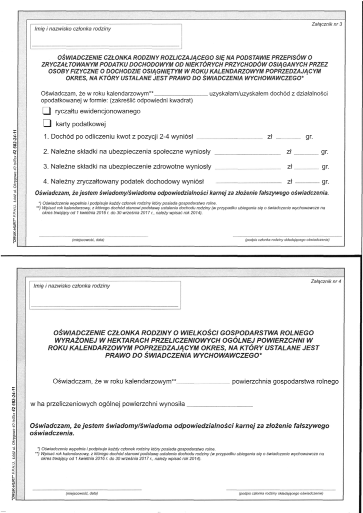 Załącznik nr 3 Imię i nazwisko członka rodziny OŚWIADCZENIE CZŁONKA RODZINY ROZLICZAJĄCEGO SIĘ NA PODSTAWIE PRZEPISOWO ZRYCZAŁTOWANYM PODATKU DOCHODOWYM OD NIEKTÓRYCH PRZYCHODÓW OSIĄGANYCH PRZEZ OSOBY FIZYCZNE O DOCHODZIE OSIĄGNIĘTYM W ROKU KALENDARZOWYM POPRZEDZAJĄCYM OKRES, NA KTÓRY USTALANE JEST PRAWO DO ŚWIADCZENIA WYCHOWAWCZEGO* Oświadczam, że w roku kalendarzowym** opodatkowanej w formie: (zakreślić odpowiedni kwadrat) uzyskałam/uzyskałem dochód z działalności i l ryczałtu ewidencjonowanego Q karty podatkowej 1. Dochód po odliczeniu kwot z pozycji 2-4 wyniósł zł gr. 2. Należne składki na ubezpieczenia społeczne wyniosły zł gr. 3. Należne składki na ubezpieczenie zdrowotne wyniosły zł gr. 4. Należny zryczałtowany podatek dochodowy wyniósł zł gr. Oświadczam, że jestem świadomy/świadoma odpowiedzialności karnej za złożenie fałszywego oświadczenia. ") Oświadczenie wypełnia i podpisuje każdy członek rodziny który posiada gospodarstwo rolne. ") Wpisać rok kalendarzowy, z którego dochód stanowi podstawę ustalenia dochodu rodziny (w przypadku ubiegania się o świadczenie wychowawcze na okres trwający od 1 kwietnia 2016 r. do 30 września 2017 r., należy wpisać rok 2014). (miejscowość, data) Imię i nazwisko członka rodziny (podpis członka rodziny składającego oświadczenie) Załącznik nr 4 OŚWIADCZENIE CZŁONKA RODZINY O WIELKOŚCI GOSPODARSTWA ROLNEGO WYRAŻONEJ W HEKTARACH PRZELICZENIOWYCH OGÓLNEJ POWIERZCHNI W ROKU KALENDARZOWYM POPRZEDZAJĄCYM OKRES, NA KTÓRY USTALANE JEST PRAWO DO ŚWIADCZENIA WYCHOWAWCZEGO* Oświadczam, że w roku kalendarzowym** powierzchnia gospodarstwa rolnego w ha przeliczeniowych ogólnej powierzchni wynosiła Oświadczam, że jestem świadomy/świadoma odpowiedzialności karnej za złożenie fałszywego oświadczenia. *) Oświadczenie wypełnia i podpisuje każdy członek rodziny który posiada gospodarstwo rolne. ) Wpisać rok kalendarzowy, z którego dochód stanowi podstawę ustalenia dochodu rodziny (w przypadku ubiegania się o świadczenie wychowawcze na okres trwający od 1 kwietnia 2016 r. do 30 września 2017 r., należy wpisać rok 2014). (miejscowość, data) (podpis członka rodziny składającego oświadczenie)