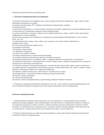 Wyłączenie odpowiedzialności ubezpieczyciela 1. Ochrona ubezpieczeniowa nie obejmuje: 1) wyrobów alkoholowych (za wyjątkiem piwa i wina), wyrobów tytoniowych (papierosów, cygar, tabaki, tytoniu fajkowego) przewożonych na lądzie, 2) sprzętu komputerowego, RTV, telefonów komórkowych przewożonych na lądzie, 3) zwierząt żywych, 4) dzieł sztuki, przedmiotów o znacznej wartości naukowej, kulturalnej, artystycznej oraz zbiorów filatelistycznych, numizmatycznych, przedmiotów mających wartość kolekcjonerską, 5) wartości pieniężnych: krajowych i zagranicznych środków płatniczych, czeków, weksli i innych dokumentów zastępujących w obrocie gotówkę, 6) rzeczy łatwo psujących się, określonych w załączniku do rozporządzenia Rady Ministrów z dnia 13 marca 2001r. poz. 227 7) metali szlachetnych, platyny, złota, srebra, oraz wyrobów z tych metali, kamieni szlachetnych i półszlachetnych, pereł, 8) mienia przewożonego jako bagaż ręczny, 9) przesyłek pocztowych, 10) cementu, mączki rybnej, 11) materiałów nuklearnych, 12) zwłok lub szczątków ludzkich, 13) mienia przewożonego w ramach handlu obwoźnego, 14) środków transportu przewożonych odkrytymi środkami transportu, 15) ładunków przewożonych na pokładzie statku, z wyjątkiem ładunków przewożonych w kontenerach, 16) substancji chemicznych, mikroorganizmów, wirusów, bakterii, toksyn, mających zastosowanie do rozwoju lub produkcji broni chemicznej lub biologicznej, 17) ładunków masowych nieskonteneryzowanych, rozumianych jako ładunki stałe, sypkie i płynne przewożone bez opakowania lub w opakowaniach jednorodnych jako tzw. drobnica jednorodna (np. cukier w workach, kawa w workach) w ładowniach statków lub w wagonach kolejowych, 18) satelitów, statków kosmicznych, rakiet nośnych i lub głównych ich części, 19) płyt gipsowych w transporcie morskim przewożonych poza kontenerem, 20) wzorów, modeli, prototypów, 21) mienia przesiedleńczego, 22) drewna w stanie nieprzetworzonym, przewożonego odkrytymi środkami transportu. 2. Przyjęcie do ubezpieczenia ładunków określonych w ww. pkt. 1 jest możliwe za zgodą Ubezpieczyciela, przy czym dla takich przypadków Ubezpieczyciel może ustalić indywidualne warunki ubezpieczenia. Ochrona ubezpieczeniowa 1. Odpowiedzialność Ubezpieczyciela rozpoczyna się nie wcześniej niż z chwilą przyjęcia towaru w gestię spedycyjną Ubezpieczającego. Jeżeli Ubezpieczający otrzymał zlecenie na ubezpieczenie ładunku w imporcie i nie organizuje transportu na odcinku morskim, a jedynie wykonuje czynności spedycyjne na dalszym odcinku transportu, to odpowiedzialność Ubezpieczyciela, na pisemny wniosek Ubezpieczającego, może rozpocząć się nie wcześniej niż z chwilą przekroczenia przez ładunek burty statku w porcie załadunku. 2. Ochrona ubezpieczeniowa nie obejmuje szkód powstałych w czasie, gdy przewóz ładunku jest dokonywany transportem własnym Ubezpieczonego.