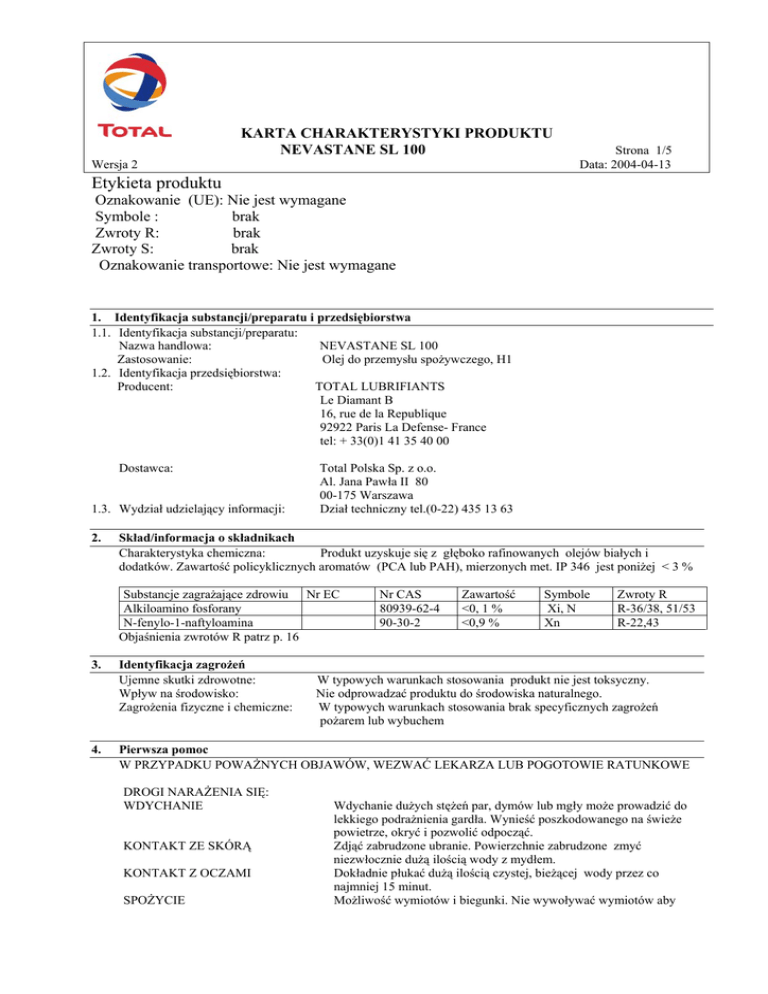 KARTA CHARAKTERYSTYKI PRODUKTU NEVASTANE SL 100 Wersja 2 Strona 1/5 Data: 2004-04-13 Etykieta produktu Oznakowanie (UE): Nie jest wymagane Symbole : brak Zwroty R: brak Zwroty S: brak Oznakowanie transportowe: Nie jest wymagane 1. Identyfikacja substancji/preparatu i przedsiębiorstwa 1.1. Identyfikacja substancji/preparatu: Nazwa handlowa: NEVASTANE SL 100 Zastosowanie: Olej do przemysłu spożywczego, H1 1.2. Identyfikacja przedsiębiorstwa: Producent: TOTAL LUBRIFIANTS Le Diamant B 16, rue de la Republique 92922 Paris La Defense- France tel: + 33(0)1 41 35 40 00 Dostawca: 1.3. Wydział udzielający informacji: 2. Total Polska Sp. z o.o. Al. Jana Pawła II 80 00-175 Warszawa Dział techniczny tel.(0-22) 435 13 63 Skład/informacja o składnikach Charakterystyka chemiczna: Produkt uzyskuje się z głęboko rafinowanych olejów białych i dodatków. Zawartość policyklicznych aromatów (PCA lub PAH), mierzonych met. IP 346 jest poniżej < 3 % Substancje zagrażające zdrowiu Nr EC Alkiloamino fosforany N-fenylo-1-naftyloamina Objaśnienia zwrotów R patrz p. 16 3. 4. Identyfikacja zagrożeń Ujemne skutki zdrowotne: Wpływ na środowisko: Zagrożenia fizyczne i chemiczne: Nr CAS 80939-62-4 90-30-2 Zawartość <0, 1 % <0,9 % Symbole Xi, N Xn Zwroty R R-36/38, 51/53 R-22,43 W typowych warunkach stosowania produkt nie jest toksyczny. Nie odprowadzać produktu do środowiska naturalnego. W typowych warunkach stosowania brak specyficznych zagrożeń pożarem lub wybuchem Pierwsza pomoc W PRZYPADKU POWAŻNYCH OBJAWÓW, WEZWAĆ LEKARZA LUB POGOTOWIE RATUNKOWE DROGI NARAŻENIA SIĘ: WDYCHANIE KONTAKT ZE SKÓRĄ KONTAKT Z OCZAMI SPOŻYCIE Wdychanie dużych stężeń par, dymów lub mgły może prowadzić do lekkiego podrażnienia gardła. Wynieść poszkodowanego na świeże powietrze, okryć i pozwolić odpocząć. Zdjąć zabrudzone ubranie. Powierzchnie zabrudzone zmyć niezwłocznie dużą ilością wody z mydłem. Dokładnie płukać dużą ilością czystej, bieżącej wody przez co najmniej 15 minut. Możliwość wymiotów i biegunki. Nie wywoływać wymiotów aby KARTA CHARAKTERYSTYKI PRODUKTU NEVASTANE SL 100 Wersja 2 ZACHŁYŚNIĘCIE SIĘ 5. Strona 2/5 Data: 2004-04-13 uniknąć ryzyka przedostania się do dróg oddechowych. Nie podawać nic do picia. Jeśli zachodzi podejrzenie przedostania się produktu do płuc (np. przy wymiotach), natychmiast zawieźć poszkodowanego do szpitala. Postępowanie w przypadku pożaru TEMPERATURA ZAPŁONU ODPOWIEDNIE ŚRODKI GAŚNICZE NIEODPOWIEDNIE ŚRODKI SZCZEGÓLNE ZAGROŻENIA: SPECJALNE WYPOSAŻENIE OCHRONNE DLA STRAŻAKÓW: Patrz p.9 Ditlenek węgla, piana, proszek gaśniczy Nie używać strumieni wody, mogą sprzyjać rozprzestrzenianiu się pożaru W przypadku niekompletnego spalania i termolizy mogą powstać toksyczne gazy takie jak CO, CO2, różne węglowodory, aldehydy i sadza. Są one bardzo niebezpieczne przy wdychaniu. W zamkniętych pomieszczeniach o dużym stężeniu dymów i gazów nosić aparat izolujący drogi oddechowe 6. Postępowanie w przypadku uwolnienia Patrz również p.8 i 13 POSTĘPOWANIE PRZY Powierzchnie z rozlanym produktem mogą być śliskie. Nie ROZLANIU/PRZECIEKU dopuszczać do przedostania się go gruntu, cieków wodnych i -DO GLEBY oczyszczalni. Odzyskiwać metodami fizycznymi. Przy większym rozlaniu, jeśli sytuacji nie można szybko opanować, powiadomić odpowiednie władze. - DO WODY Do mechanicznego zbierania stosować pływające materiały absorpcyjne. Jeśli środki te przedostaną się do strumieni lub ścieków, poinformować władze o możliwości obecności pływających materiałów. 7. Obchodzenie się z substancją i magazynowanie POSTĘPOWANIE Zabezpieczenie techniczne/środki ostrożności Zalecenia z zakresu bezpieczeństwa MAGAZYNOWANIE Zabezpieczenie techniczne/warunki magazynowania Unikać lub ograniczyć do minimum narażenie na kontakt z produktem używanym lub odpadowym.. Przy powstawaniu par/aerozoli/produktów rozkładu zapewnić odpowiednią wentylację. Przechowywać z dala od materiałów palnych oraz żywności i napojów. Puste opakowania mogą zawierać palne lub wybuchowe opary. Istnieje zagrożenie pożarowe ze strony szmat, papieru lub innych środków stosowanych do usuwania rozlania, które są nasączone produktem. Unikać gromadzenia ich i bezpiecznie utylizować. Zapobiegać gromadzeniu się elektryczności statycznej przez stosowanie uziemień. Maszyny lub urządzenia należy ustawiać tak aby unikać ryzyka rozlania produktu lub ochlapania gorących części lub połączeń elektrycznych. Unikać kontaktu z mocnymi utleniaczami. Stosować tylko odporne na węglowodory opakowania, węże, rury. Stosować wszystkie dostępne środki zapobiegające zanieczyszczeniu wody i gruntu. Opakowania należy przechowywać szczelnie zamknięte w temperaturze pokojowej, zabezpieczone przed wodą i KARTA CHARAKTERYSTYKI PRODUKTU NEVASTANE SL 100 Strona 3/5 Data: 2004-04-13 wilgocią z dala od wszelkich źródeł zapłonu. Unikać kontaktu z utleniaczami. Zalecenia dodatkowe Stosować tylko odporne na węglowodory opakowania, rury, złączki. Przechowywać jeśli to tylko możliwe w oryginalnych opakowaniach. w innych przypadkach wszystkie zalecenia przenieść na etykietę nowego opakowania. Kontrola narażenia/środki ochrony indywidualnej Wersja 2 8. Wskazówki dodatkowe odnośnie wymogów stawianych urządzeniom technicznym: Graniczne dawki w miejscu pracy: Ochrona rąk: Ochrona oczu: Ochrona ciała: Higiena przemysłowa: 9. Stosować produkt w dobrze wentylowanych pomieszczeniach. Przy pracy w przestrzeniach zamkniętych (zbiorniki) upewnić się, że środowisko nie jest duszące i/lub nosić zalecane wyposażenie. Mgła olejowa: 10 mg/m3 przez 15 min Mgła olejowa: 5mg/m3 przez 8 godzin Jeśli zachodzi potrzeba stosować rękawice ochronne, odporne na węglowodory, zalecane: nitrylowe, neoprenowe Okulary o szczelnej obudowie lub osłona na twarz Gdy zachodzi potrzeba nosić maskę 