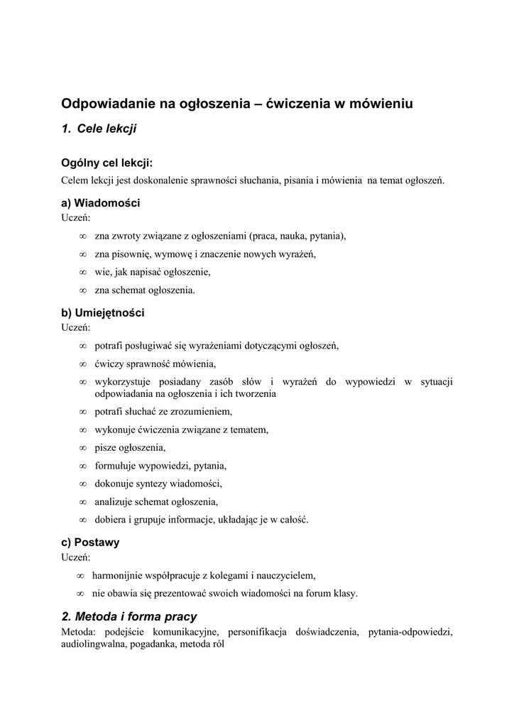 Odpowiadanie na ogłoszenia – ćwiczenia w mówieniu 1. Cele lekcji Ogólny cel lekcji: Celem lekcji jest doskonalenie sprawności słuchania, pisania i mówienia na temat ogłoszeń. a) Wiadomości Uczeń: • zna zwroty związane z ogłoszeniami (praca, nauka, pytania), • zna pisownię, wymowę i znaczenie nowych wyrażeń, • wie, jak napisać ogłoszenie, • zna schemat ogłoszenia. b) Umiejętności Uczeń: • potrafi posługiwać się wyrażeniami dotyczącymi ogłoszeń, • ćwiczy sprawność mówienia, • wykorzystuje posiadany zasób słów i wyrażeń do wypowiedzi w sytuacji odpowiadania na ogłoszenia i ich tworzenia • potrafi słuchać ze zrozumieniem, • wykonuje ćwiczenia związane z tematem, • pisze ogłoszenia, • formułuje wypowiedzi, pytania, • dokonuje syntezy wiadomości, • analizuje schemat ogłoszenia, • dobiera i grupuje informacje, układając je w całość. c) Postawy Uczeń: • harmonijnie współpracuje z kolegami i nauczycielem, • nie obawia się prezentować swoich wiadomości na forum klasy. 2. Metoda i forma pracy Metoda: podejście komunikacyjne, personifikacja doświadczenia, pytania-odpowiedzi, audiolingwalna, pogadanka, metoda ról Forma: praca w parach, zespole i indywidualna 3. Środki dydaktyczne Przykładowe ogłoszenia, podręcznik uzupełniający, słowniki 4. Przebieg lekcji a) Faza przygotowawcza Nauczyciel podaje temat i ogólny cel lekcji: „Omówicie schemat ogłoszenia, a potem będziecie na niego odpowiadać oraz pisać swoje przykłady anonsów”. Sprawdza, czy uczniowie przygotowali pracę domową i ocenia ją plusami lub minusami. b) Faza realizacyjna 1. Nauczyciel pyta uczniów, jak wygląda ogłoszenie np. o pracy, nauce, sprzedaży. Zapisuje jego schemat na tablicy oraz objaśnia go. Zdaje uczniom pytania, na które odpowiadają ustnie. Pyta uczniów, co konkretnie należy uwzględnić w treści ogłoszenia. Podaje przykłady związane ze specjalizacją lub rzeczywistą sytuacją uczniów. Wszystkie informacje uczniowie zapisują w zeszytach. 2. Nauczyciel rozdaje przykładowe ogłoszenia i omawia z uczniami ich treść. 3. W parach uczniowie piszą lub przygotowują ustnie dialogi – odpowiedzi na ogłoszenia. Nauczyciel monitoruje ich pracę, pomagając w razie trudności (układanie pytań). 4. Uczniowie w parach odgrywają role nadającego ogłoszenie i zainteresowanego, które odpowiada na anons telefonicznie. 5. Uczniowie piszą indywidualnie własne ogłoszenia o dowolnej tematyce, a nauczyciel monitoruje ich pracę, podchodząc do każdego i pomagając w razie problemów. Uczniowie mogą korzystać ze słowników. 6. Uczniowie wymieniają się ogłoszeniami i odpowiadają na nie w rozmowie z kolegą (praca w parach). c) Faza podsumowująca Nauczyciel ocenia aktywność wszystkich uczniów plusami i minusami. Zadaje też pracę domową. Przypomina o konieczności nauczenia się poznanych dziś wiadomości. 5. Bibliografia 1. Brough S., Abegg B., Bedford M., Jak pisać po angielsku?, Langenscheidt, Warszawa 2004. 2. Komorowska H., Metodyka nauczania języków obcych, Fraszka Edukacyjna, Warszawa 2002. 6. Załączniki Zadanie domowe 1. Naucz się poznanych dzisiaj wiadomości. 2. Znajdź ciekawe ogłoszenie i odpowiedz na nie (przygotuj rozmowę z nadawcą ogłoszenia). 7. Czas trwania lekcji 45 minut 8. Uwagi do scenariusza Należy jak najwięcej informacji wydobyć od uczniów, zadając im konkretne pytania. Trzeba też dopilnować, żeby rozmowy były rzeczywiście odpowiedzią na podane ogłoszenia. Dobrze jest znaleźć przykłady ogłoszeń związanych z przyszłym zawodem uczniów tak, aby mogli je oni wykorzystać w przyszłości. Trzeba też wcześniej przygotować ogłoszenia i przynieść je na lekcję. Po lekcji uczeń powinien znać zwroty związane z ogłoszeniami np. advert, job, contact, price, sell, buy, English, company, phone number oraz wiedzieć, jakie informacje powinno zawierać poprawnie napisane ogłoszenie (co się sprzedaje, kupuje, oferuje, cena, kontakt).