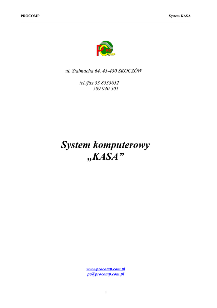 PROCOMP System KASA _____________________________________________________________________________________________ ul. Stalmacha 64, 43-430 SKOCZÓW tel./fax 33 8533652 509 940 501 System komputerowy „KASA” www.procomp.com.pl [email protected] 1 PROCOMP System KASA _____________________________________________________________________________________________ Spis treści I OGÓLNE INFORMACJE O SYSTEMIE...............................................................................................................3 II OPIS FUNKCJI SYSTEMU....................................................................................................................................5 1. RAPORTY KASOWE..............................................................................................................................................5 2. STAN KASY W POSZCZEGÓLNYCH DNIACH...............................................................................................8 3. ADRESY SYSTEMÓW WSPÓŁPRACUJĄCYCH.............................................................................................8 4. LIKWIDACJA ZAPISÓW ..................................................................................................................................8 5. POLSKIE ZNAKI NA DRUKARCE......................................................................................................................8 6. TRYB PRACY DRUKARKI...................................................................................................................................9 7. INDEKSOWANIE BAZ DANYCH........................................................................................................................9 8. HASŁO KONTROLNE - GŁÓWNE....................................................................................................................10 9. HASŁO DO LIKWIDACJI DANYCH................................................................................................................10 10. DANE DO WYDRUKU DOWODÓW KASOWYCH......................................................................................10 11. USTALENIE/ZMIANA FORMATU DATY......................................................................................................10 12. PRZYWRACANIE DANYCH Z KOPII............................................................................................................10 13. ZEGAR W PRAWEJ GÓRNEJ CZĘŚCI EKRANU........................................................................................11 14. LOKALIZACJA KOPII NA DYSKACH...........................................................................................................11 15. KONIEC PRACY.................................................................................................................................................11 16. PRZERWANIA PRACY SYSTEMU ................................................................................................................12 17. PRZEBIEG PROCESU INDEKSOWANIA......................................................................................................12 18. DANE O KOPIACH AUTOMATYCZNYCH...................................................................................................12 19. DOSTĘP DO INTERNETU.................................................................................................................................13 20. AKTUALIZACJA OPROGRAMOWANIA .....................................................................................................13 21. AKTUALIZACJA LISTY OPERATORÓW ....................................................................................................13 22. ZMIANY HASEŁ OPERATORÓW...................................................................................................................13 2 PROCOMP System KASA _____________________________________________________________________________________________ I OGÓLNE INFORMACJE O SYSTEMIE System KASA pozwala sprawnie obsługiwać kasę w firmie, zakładzie produkcyjnym itp.. Pozwala drukować raporty kasowe, polecenia Kasa Przyjmie i Kasa Wypłaci. System pracuje wyłącznie w środowisku Windows zarówno w wersji 32-u i 64-bitowej (Windows 7, Windows 8, Windows 8.1, Windows 10 oraz XP). Współpracuje z systemem FK, SPRZEDAŻ oraz FAKTURY autorstwa firmy PROCOMP. Warunkiem prawidłowej eksploatacji Systemu jest: zdefiniowanie zmiennej środowiskowej systemowej o nazwie STACJA i wartości NAZWA, gdzie NAZWA jest unikalną nazwa stacji roboczej. Program może być wyświetlany na dwa sposoby: jako okno graficzne lub jako okno konsolowe. Układ graficzny w systemie przygotowano tak, aby mógł być wyświetlany na starszych komputerach z systemem XP oraz na najnowszych z systemem Win 7, 8 i 10 (bez dodatkowych konfiguracji). Rozwiązanie graficzne wygląda identycznie jak konsolowe, czyli całkowicie bez zmian dla użytkownika, ale jest „okienkowe”. Domyślnie program startuje jako wersja graficzna. Okno można skalować/rozszerzać myszką rozciągając w pionie i poziomie, działa rozszerzenie do pełnego ekranu po naciśnięciu myszką na przycisk Maksymalizuj. Można dodać parametr do skrótu uruchamiającego program, aby zawsze uruchamiał się w ustalony sposób. Użytkownicy, którzy używają program w trybie pełnoekranowym (tekstowym na Win XP) lub oknie konsolowym, powinni uruchomić program z parametrem //GTWIN, np. KASA.EXE //GTWIN lub dodać zmienną środowiskową o nazwie HB_GT i wartości GTWIN, wówczas programy globalnie na danym komputerze będą startowały jako wersje konsolowe. System rozpoznaje w jakim trybie został uruchomiony. Wyświetla informację o nazwie i wersji programu na pasku tytułowym zarówno dla konsoli jak i dla wersji graficznej. Automatycznie pamięta ostatnie parametry i uruchomiony na nowo przywraca wielkość okna z ostatniego uruchomienia. Każde stanowisko pamięta swoje rozmiary okna i można program uruch