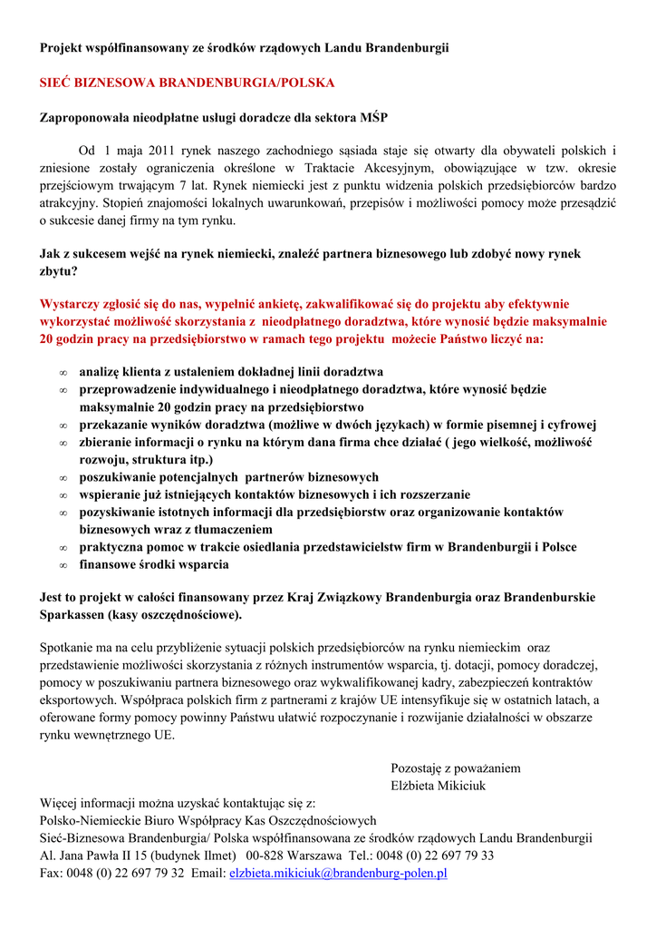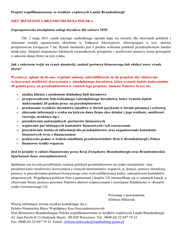 Projekt współfinansowany ze środków rządowych Landu Brandenburgii SIEĆ BIZNESOWA BRANDENBURGIA/POLSKA Zaproponowała nieodpłatne usługi doradcze dla sektora MŚP Od 1 maja 2011 rynek naszego zachodniego sąsiada staje się otwarty dla obywateli polskich i zniesione zostały ograniczenia określone w Traktacie Akcesyjnym, obowiązujące w tzw. okresie przejściowym trwającym 7 lat. Rynek niemiecki jest z punktu widzenia polskich przedsiębiorców bardzo atrakcyjny. Stopień znajomości lokalnych uwarunkowań, przepisów i możliwości pomocy może przesądzić o sukcesie danej firmy na tym rynku. Jak z sukcesem wejść na rynek niemiecki, znaleźć partnera biznesowego lub zdobyć nowy rynek zbytu? Wystarczy zgłosić się do nas, wypełnić ankietę, zakwalifikować się do projektu aby efektywnie wykorzystać możliwość skorzystania z nieodpłatnego doradztwa, które wynosić będzie maksymalnie 20 godzin pracy na przedsiębiorstwo w ramach tego projektu możecie Państwo liczyć na: • • • • • • • • • analizę klienta z ustaleniem dokładnej linii doradztwa przeprowadzenie indywidualnego i nieodpłatnego doradztwa, które wynosić będzie maksymalnie 20 godzin pracy na przedsiębiorstwo przekazanie wyników doradztwa (możliwe w dwóch językach) w formie pisemnej i cyfrowej zbieranie informacji o rynku na którym dana firma chce działać ( jego wielkość, możliwość rozwoju, struktura itp.) poszukiwanie potencjalnych partnerów biznesowych wspieranie już istniejących kontaktów biznesowych i ich rozszerzanie pozyskiwanie istotnych informacji dla przedsiębiorstw oraz organizowanie kontaktów biznesowych wraz z tłumaczeniem praktyczna pomoc w trakcie osiedlania przedstawicielstw firm w Brandenburgii i Polsce finansowe środki wsparcia Jest to projekt w całości finansowany przez Kraj Związkowy Brandenburgia oraz Brandenburskie Sparkassen (kasy oszczędnościowe). Spotkanie ma na celu przybliżenie sytuacji polskich przedsiębiorców na rynku niemieckim oraz przedstawienie możliwości skorzystania z różnych instrumentów wsparcia, tj. dotacji, pomocy doradczej, pomocy w poszukiwaniu partnera biznesowego oraz wykwalifikowanej kadry, zabezpieczeń kontraktów eksportowych. Współpraca polskich firm z partnerami z krajów UE intensyfikuje się w ostatnich latach, a oferowane formy pomocy powinny Państwu ułatwić rozpoczynanie i rozwijanie działalności w obszarze rynku wewnętrznego UE. Pozostaję z poważaniem Elżbieta Mikiciuk Więcej informacji można uzyskać kontaktując się z: Polsko-Niemieckie Biuro Współpracy Kas Oszczędnościowych Sieć-Biznesowa Brandenburgia/ Polska współfinansowana ze środków rządowych Landu Brandenburgii Al. Jana Pawła II 15 (budynek Ilmet) 00-828 Warszawa Tel.: 0048 (0) 22 697 79 33 Fax: 0048 (0) 22 697 79 32 Email: [email protected]
