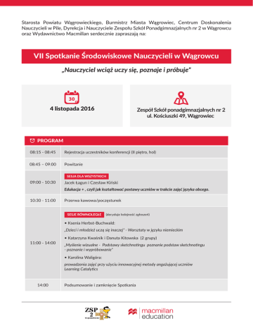 Starosta Powiatu Wągrowieckiego, Burmistrz Miasta Wągrowiec, Centrum Doskonalenia Nauczycieli w Pile, Dyrekcja i Nauczyciele Zespołu Szkół Ponadgimnazjalnych nr 2 w Wągrowcu oraz Wydawnictwo Macmillan serdecznie zapraszają na: VII Spotkanie Środowiskowe Nauczycieli w Wągrowcu „Nauczyciel wciąż uczy się, poznaje i próbuje” 4 listopada 2016 Zespół Szkół ponadgimnazjalnych nr 2 ul. Kościuszki 49, Wągrowiec PROGRAM 08:15 - 08:45 Rejestracja uczestników konferencji (II piętro, hol) 08:45 – 09:00 Powitanie 09:00 - 10:30 Jacek Łagun i Czesław Kiński Edukacja + , czyli jak kształtować postawy uczniów w trakcie zajęć języka obcego. 10:30 - 11:00 Przerwa kawowa/poczęstunek (decyduje kolejność zgłoszeń) • Ksenia Herbst-Buchwald: „Dzieci i młodzież uczą się inaczej” - Warsztaty w języku niemieckim 11:00 - 14:00 • Katarzyna Kwaśnik i Danuta Kitowska (2 grupy) „Myślenie wizualne - Podstawy sketchnotingu poznanie podstaw sketchnotingu - poznanie i wypróbowanie” • Karolina Waligóra: prowadzenia zajęć przy użyciu innowacyjnej metody angażującej uczniów Learning Catalytics 14:00 Podsumowanie i zamknięcie Spotkania Czesław Kiński i dr Jacek Łagun – absolwenci Uniwersytetu Gdańskiego. Obecnie pracują jako nauczyciele akademiccy na Uniwersytecie Warmińsko-Mazurskim, lektorzy w olsztyńskiej szkole językowej English Perfect oraz autorzy i trenerzy wydawnictwa Macmillan. Edukacja+ czyli jak kształtować postawy uczniów w trakcie zajęć języka obcego. Każdy nauczyciel ma swoje ulubione ćwiczenia na wprowadzanie, utrwalanie i powtarzanie gramatyki i leksyki. W naszej pracy zdarza się, że wprowadzenie w ustalonym planie zajęć małej zmiany, czy też postawienie dodatkowego pytania mogą dodać lekcji nowego wymiaru. W naszej sesji chcielibyśmy zaprezentować, jak przy okazji utrwalania i powtarzania struktur gramatycznych oraz słownictwa wskazać naszym uczniom sposób, w jaki mogą stać się lepszymi przyjaciółmi, uczniami czy (niezależnie od tego, jak górnolotnie to brzmi) ludźmi. Wierzymy, że jedyne, czego potrzeba to właściwe nastawienie i zauważanie w nowoczesnych materiałach do nauki języka obcego odpowiednich do tego okazji. Dodatkową korzyścią wynikającą z takiego podejścia do nauczania jest personalizacja i kontekstualizacja języka, dające możliwość głębokiego przetwarzania materiału. Ksenia Herbst-Buchwald - mgr lingwistyki stosowanej, od 11 lat nauczyciel języka niemieckiego w Zespole Szkół z Oddziałami Integracyjnymi nr 2 w Poznaniu. Doradca metodyczny nauczycieli języka niemieckiego szkół podstawowych oraz gimnazjów w Ośrodku Doskonalenia Nauczycieli w Poznaniu. Od trzech lat ekspert programu DELFORT w regionie Wielkopolski – Ogólnopolskiego Projektu Doskonalenia Nauczycieli Języka Niemieckiego z ramienia ORE oraz Goethe Instiut. Członek zarządu poznańskiego Oddziału Polskiego Stowarzyszenia Nauczycieli Języka Niemieckiego. „Dzieci i młodzież uczą się inaczej” - „Kinder und Jugednliche lernen anders – Sprachanimationen Und Spiele im Deutschunterricht ”; według programu Goethe Institut w Pradze Fokus Grundschule Warsztaty w języku niemieckim Liczba uczestników: do 25 Czas trwania: 3h (4 x 45’) Katarzyna Kwaśnik Nauczyciel konsultant w Centrum Doskonalenia Nauczycieli w Pile. Ukończyła studia we wszechnicy Wyższa Szkoła Pedagogiczna im. KEN w Krakowie (tak brzmiało dawniej), dzisiaj to Uniwersytet Pedagogiczny im. KEN w Krakowie. Brzmi dumniej. Nauczyciel geografii. Prócz geografii z początkiem kariery nauczycielskiej uczyła plastyki. Jakiż piękny, rozwijający i niestresujący przedmiot. Co robi teraz...? Stara się COŚ ważnego i nowego przekazywać nauczycielom. Dlaczego...? Niechaj pracuje im się łatwiej, niech nie popełniają moich błędów. Nowa pasja to powrót do rysowania, tym razem wiedzy, tzw. myślenie wizualne - sketchnoting. Bo… Każdy potrafi rysować, a jeżeli ma o pomóc uczniowi w uczeniu to należy spróbować. Karolina Waligóra Chciałabym zaprosić Państwa do udziału w aktywnej prezentacji na temat prowadzenia zajęć przy użyciu innowacyjnej metody angażującej uczniów Learning Catalytics. Podczas naszego spotkania: • poznamy podstawowe zasady funkcjonowania Learning Catalytics • zobaczymy, jak monitorować poziom wiedzy przekazywanej na zajęciach • sprawdzimy, jak efektywnie wykorzystać metodę peer-to-peer learning • połączymy warsztaty w klasie z zajęciami poza murami uczelni • i przetestujemy na własnej skórze, jak prowadzić zajęcia, podczas których uczniowie zamiast logować się na Facebooka mogą wykorzystać przenośne urządzenia do pracy na zajęciach. Każdy uczestnik proszony jest o zabranie ze sobą telefonu komórkowego/tabletu/laptopa zdostępem do internetu. Rejestrację uczestników konferencji prowadzi Zespół Szkół Ponadgimnazjalnych w Wągrowcu, ul. Kościuszki 49. Należy się zarejestrować poprzez formularz zgłoszeniowy na stronie internetowej szkoły - www.zsp2wagrowiec.pl oraz wybrać grupę warsztatową. W trakcie konferencji będzie możliwość zapoznania się materiałami dydaktycznymi proponowanymi przez wydawnictwa językowe. Uczestnicy konferencji otrzymają w materiałach konferencyjnych m.in. certyfikat uczestnictwa.