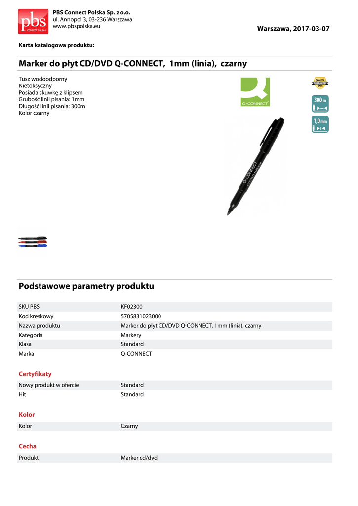 PBS Connect Polska Sp. z o.o. ul. Annopol 3, 03-236 Warszawa www.pbspolska.eu Warszawa, 2017-03-07 Karta katalogowa produktu: Marker do płyt CD/DVD Q-CONNECT, 1mm (linia), czarny Tusz wodoodporny Nietoksyczny Posiada skuwkę z klipsem Grubość linii pisania: 1mm Długość linii pisania: 300m Kolor czarny Podstawowe parametry produktu SKU PBS KF02300 Kod kreskowy 5705831023000 Nazwa produktu Marker do płyt CD/DVD Q-CONNECT, 1mm (linia), czarny Kategoria Markery Klasa Standard Marka Q-CONNECT Certyfikaty Nowy produkt w ofercie Standard Hit Standard Kolor Kolor Czarny Cecha Produkt Marker cd/dvd PBS Connect Polska Sp. z o.o. ul. Annopol 3, 03-236 Warszawa www.pbspolska.eu Karta katalogowa produktu cd. Marker do płyt CD/DVD Q-CONNECT, 1mm (linia), czarny Podstawowe parametry produktu Typ Okrągły Rodzaj Klasyczny W ofercie od 2013-01 Wymiary Dł. linii (m) 300 Grubość linii (mm) 1 Końcówka (mm) 1 Wspólny słownik zamówień CPV 30192125-3 Pisaki Jednostki logistyczne Opakowanie 1 10 szt Opakowanie 2 100 szt Opakowanie 3 500 szt Warszawa, 2017-03-07