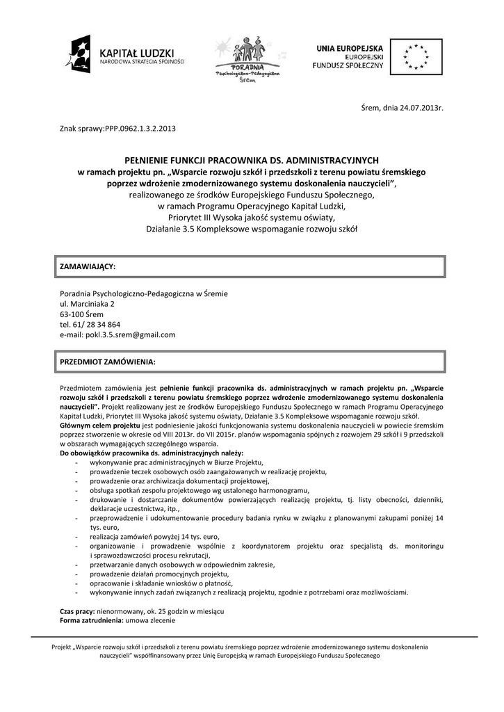 Śrem, dnia 24.07.2013r. Znak sprawy:PPP.0962.1.3.2.2013 PEŁNIENIE FUNKCJI PRACOWNIKA DS. ADMINISTRACYJNYCH w ramach projektu pn. „Wsparcie rozwoju szkół i przedszkoli z terenu powiatu śremskiego poprzez wdrożenie zmodernizowanego systemu doskonalenia nauczycieli”, realizowanego ze środków Europejskiego Funduszu Społecznego, w ramach Programu Operacyjnego Kapitał Ludzki, Priorytet III Wysoka jakość systemu oświaty, Działanie 3.5 Kompleksowe wspomaganie rozwoju szkół ZAMAWIAJĄCY: Poradnia Psychologiczno-Pedagogiczna w Śremie ul. Marciniaka 2 63-100 Śrem tel. 61/ 28 34 864 e-mail: [email protected] PRZEDMIOT ZAMÓWIENIA: Przedmiotem zamówienia jest pełnienie funkcji pracownika ds. administracyjnych w ramach projektu pn. „Wsparcie rozwoju szkół i przedszkoli z terenu powiatu śremskiego poprzez wdrożenie zmodernizowanego systemu doskonalenia nauczycieli”. Projekt realizowany jest ze środków Europejskiego Funduszu Społecznego w ramach Programu Operacyjnego Kapitał Ludzki, Priorytet III Wysoka jakość systemu oświaty, Działanie 3.5 Kompleksowe wspomaganie rozwoju szkół. Głównym celem projektu jest podniesienie jakości funkcjonowania systemu doskonalenia nauczycieli w powiecie śremskim poprzez stworzenie w okresie od VIII 2013r. do VII 2015r. planów wspomagania spójnych z rozwojem 29 szkół i 9 przedszkoli w obszarach wymagających szczególnego wsparcia. Do obowiązków pracownika ds. administracyjnych należy: wykonywanie prac administracyjnych w Biurze Projektu, prowadzenie teczek osobowych osób zaangażowanych w realizację projektu, prowadzenie oraz archiwizacja dokumentacji projektowej, obsługa spotkań zespołu projektowego wg ustalonego harmonogramu, drukowanie i dostarczanie dokumentów powierzających realizację projektu, tj. listy obecności, dzienniki, deklaracje uczestnictwa, itp., przeprowadzenie i udokumentowanie procedury badania rynku w związku z planowanymi zakupami poniżej 14 tys. euro, realizacja zamówień powyżej 14 tys. euro, organizowanie i prowadzenie wspólnie z koordynatorem projektu oraz specjalistą ds. monitoringu i sprawozdawczości procesu rekrutacji, przetwarzanie danych osobowych w odpowiednim zakresie, prowadzenie działań promocyjnych projektu, opracowanie i składanie wniosków o płatność, wykonywanie innych zadań związanych z realizacją projektu, zgodnie z potrzebami oraz możliwościami. Czas pracy: nienormowany, ok. 25 godzin w miesiącu Forma zatrudnienia: umowa zlecenie Projekt „Wsparcie rozwoju szkół i przedszkoli z terenu powiatu śremskiego poprzez wdrożenie zmodernizowanego systemu doskonalenia nauczycieli” współfinansowany przez Unię Europejską w ramach Europejskiego Funduszu Społecznego WARUNKI UDZIAŁU W POSTĘPOWANIU: Oferenci muszą spełniać następujące warunki: wykształcenie wyższe magisterskie doświadczenie w dziedzinie zamówień publicznych umiejętność obsługi komputera (w tym Generatora Wniosków Aplikacyjnych i Płatniczych), zaangażowanie i dyspozycyjność. Mile widziane doświadczenie w zakresie przygotowania i realizacji projektów unijnych, w tym projektów współfinansowanych ze środków Europejskiego Funduszu Społecznego. TERMIN REALIZACJI ZAMÓWIENIA: Od daty podpisania umowy do dnia 31.07.2015r. SPOSÓB OBLICZANIA WYNAGRODZENIA: 1. 2. 3. 4. 5. 6. 7. 8. Podana w ofercie kwota wynagrodzenia musi uwzględniać wszystkie wymagania Zamawiającego określone w niniejszym zapytaniu oraz obejmować wszelkie koszty (m.in. koszty połączeń teleinformatycznych: telefon, Internet; koszty delegacji, ipt.), jakie poniesie Wykonawca z tytułu należnej oraz zgodnej z obowiązującymi przepisami realizacji usługi. Oferta winna uwzględniać cenę brutto jednej godziny pracy oraz ostateczne miesięczne wynagrodzenie brutto. Kwota zawarta w ofercie musi być określona jednoznacznie i jest kwotą ostateczną i stałą. W sytuacji gdy Wykonawcą ubiegającym się o wykonanie usługi będzie osoba fizyczna, wobec której Zamawiający będzie miał obowiązek ubezpieczenia społecznego (składki społeczne i składki na Fundusz Pracy), wynagrodzenie należne Wykonawcy zostanie określone poprzez pomniejszenie kwoty wskazanej w formularzu oferty o kwotę składek finansowanych i opłacanych przez płatnika składek. W sytuacji gdy Wykonawcą ubiegającym się o wykonanie usługi będzie osoba fizyczna wobec której Zamawiający nie będzie miał obowiązku ubezpieczenia społecznego (składki społeczne i składki na Fundusz Pracy) wynagrodzenie należne Wykonawcy nie będzie ulegało pomniejszeniu o kwotę składek finansowych i opłacanych przez płatnika składek. Osoby wymienione w punkcie 4 i 5 zobowiązane będą przed podpisaniem umowy do złożenia stosownego oświadczenia. W przypadku osób wymienionych w punkcie 4 i 5 Zamawiający naliczy i odprowadzi zaliczkę na podatek dochodowy od wypłacanego wynagrodzenia. W przypadku gdy Wykonawcą ubiegającym się o wykonanie usługi będzie osoba fizyczna prowadząca działalność gospodarczą cena musi uwzględniać stawkę podatku VAT i zostanie potraktowana jako cena brutto. SPOSÓB OBLICZANIA WYNAGRODZENIA: 100% cena brutto za wykonanie zlecenia (cena = kwota wynagrodzenia za wykonaną usługę miesięcznie) Sposób wyliczenia kwoty wynagrodzenia: Wynagrodzenie porównywanej oferty/ Wynagrodzenie oferty która ma najniższą oferowaną kwotę *100% = Liczba punktów. W przypadku złożenia ofert z takim samym najniższym wynagrodzeniem, oferenci którzy złożyli tożsame, najniższe oferty zostaną wezwani do złożenia ofert dodatkowych opartych na innych parametrach np. doświadczenie. Jeżeli najniższa złożona oferta przekracza cenę zakontraktowaną w budżecie, Zamawiający przeprowadzi ze wszystkimi oferentami pisemne negocjacje. Projekt „Wsparcie rozwoju szkół i przedszkoli z terenu powiatu śremskiego poprzez wdrożenie zmodernizowanego systemu doskonalenia nauczycieli” współfinansowa