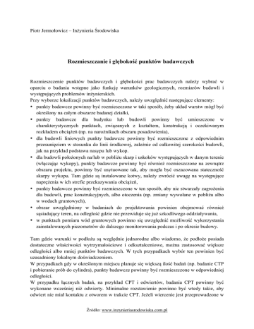 Piotr Jermołowicz – Inżynieria Środowiska Rozmieszczanie i głębokość punktów badawczych Rozmieszczenie punktów badawczych i głębokości prac badawczych należy wybrać w oparciu o badania wstępne jako funkcję warunków geologicznych, rozmiarów budowli i występujących problemów inżynierskich. Przy wyborze lokalizacji punktów badawczych, należy uwzględnić następujące elementy: • punkty badawcze powinny być rozmieszczone w taki sposób, żeby układ warstw mógł być określony na całym obszarze badanej działki, • punkty badawcze dla budynku lub budowli powinny być umieszczone w charakterystycznych punktach, związanych z kształtem, konstrukcją i oczekiwanym rozkładem obciążeń (np. na narożnikach obszaru posadowienia), • dla budowli liniowych punkty badawcze powinny być rozmieszczone z odpowiednim przesunięciem w stosunku do linii środkowej, zależnie od całkowitej szerokości budowli, jak na przykład podstawa nasypu lub wykop. • dla budowli położonych na/lub w pobliżu skarp i uskoków występujących w danym terenie (włączając wykopy), punkty badawcze powinny być również rozmieszczone na zewnątrz obszaru projektu, powinny być usytuowane tak, aby mogła być oszacowana stateczność skarpy wykopu. Tam gdzie są instalowane kotwy, należy zwrócić uwagę na występujące naprężenia w ich strefie przekazywania obciążeń, • punkty badawcze powinny być rozmieszczone w ten sposób, aby nie stwarzały zagrożenia dla budowli, prac konstrukcyjnych, albo otoczenia (np. zmiany wywołane w pobliżu albo w wodach gruntowych), • obszar uwzględniony w badaniach do projektowania powinien obejmować również sąsiadujący teren, na odległość gdzie nie przewiduje się już szkodliwego oddziaływania, • w punktach pomiaru wód gruntowych powinno się uwzględnić możliwość wykorzystania zainstalowanych piezometrów do dalszego monitorowania podczas i po okresie budowy. Tam gdzie warunki w podłożu są względnie jednorodne albo wiadomo, że podłoże posiada dostateczne właściwości wytrzymałościowe i odkształceniowe, można zastosować większe odległości albo mniej punktów badawczych. W tych przypadkach wybór ten powinien być uzasadniony lokalnym doświadczeniem. W przypadkach gdy w określonym miejscu planuje się większą ilość badań (np. badanie CTP i pobieranie prób do cylindra), punkty badawcze powinny być rozmieszczone w odpowiedniej odległości. W przypadku łącznych badań, na przykład CPT i odwiertów, badania CPT powinny być wykonane wcześniej niż odwierty. Minimalne rozstawienie powinno być wtedy takie, aby odwiert nie miał kontaktu z otworem w trakcie CPT. Jeżeli wiercenie jest przeprowadzone w Źródło: www.inzynieriasrodowiska.com.pl pierwszej kolejności, badanie CPT powinno być wykonywane w odległości poziomej przynajmniej 2 m. Głębokość badań powinna obejmować wszystkie warstwy, których dotyczy dokumentacja, albo te, na które budowla oddziaływuje, a wszystkie warstwy gruntów określane mianem „słabe” muszą być przewiercone z konsekwencją niejednokrotnie dużego zwiększenia zaplanowanego wstępnie metrażu odwiertów. W przypadku zapór, jazów i wykopów poniżej poziomu wód gruntowych i tam gdzie prowadzone są prace odwadniające, głębokość badań powinna uwzględniać warunki hydrogeologiczne. Skarpy i uskoki w terenie powinny być przebadane do głębokości poniżej potencjalnej powierzchni poślizgu. Rozmieszczenie punktów badawczych i głębokości prac badawczych należy wybrać w oparciu o badania wstępne, jako funkcję warunków geologicznych, rozmiarów budowli i występujących problemów inżynierskich. • Przykłady zaleceń odnośnie rozstawu i głębokości rozpoznania. Zaleca się następujące rozstawy punktów badawczych: − dla budowli wysokich i przemysłowych, w formie siatki z punktami w odległościach 15 m do 40 m, − dla budowli o dużej powierzchni, w kształcie siatki z punktami w odległościach nie większych niż 60 m, − dla budowli liniowych (np. mosty, drogi kolejowe, kanały, rurociągi, wały, tunele, ściany oporowe) rozstaw 20 m do 200 m, − dla budowli specjalnych (np. mosty, kominy, fundamenty pod maszyny) dwa do sześciu punktów badawczych na fundament, − dla zapór i jazów, odległości 25m do 75 m wzdłuż odpowiednich przekrojów. Zaleca się następujące głębokości rozpoznania za (poziomem odniesienia dla za jest najniższy punkt fundamentu budowli albo elementu konstrukcyjnego lub dno wykopu). Tam gdzie istnieją różne możliwości ustalenia za zaleca się przyjmowanie wartości największej. Tam gdzie spodziewane są niekorzystne warunki geologiczne, zaleca się zawsze przyjmować większe głębokości rozpoznania, na przykład warstwy słabe lub słabe lub ściśliwe poniżej warstwy o większej nośności. Tam gdzie budowle są posadowione na nośnej warstwie głębokość rozpoznania może być zredukowana do za = 2,0 m, chyba, że budowa geologiczna jest nieznana; w tym przypadku przynajmniej jeden otwór wiertniczy powinien sięgać minimum do głębokości za = 5 m. Jeżeli napotka się podłoże skalne na proponowanym poziomie posadowienia budowli, to ten poziom zaleca się przyjąć jako poziom odniesienia za. W innym przypadku za odnosi się do powierzchni podłoża skalnego. W przypadku budowli innych konstrukcji inżynierskich o dużych wysokościach zaleca się zastosowanie większej wartości następujących warunków (Rys. 1 a): - za ≥ 6m, - za ≥ 3,0 bF gdzie bF jest wymiarem krótszego boku fundamentu. Źródło: www.inzynieriasrodowiska.com.pl W przypadku fundamentów płytowych oraz konstrukcji z kilkoma elementami fundamentowymi, których obciążenia w głębszych warstwach nakładają się na siebie (Rys.1 b) : za ≥ 1,5 bB gdzie bB jest krótszym bokiem konstrukcji. Rys.1. Budowle o dużej wysokości, konstrukcje inżynierskie a - fundament, b – konstrukcja W przy