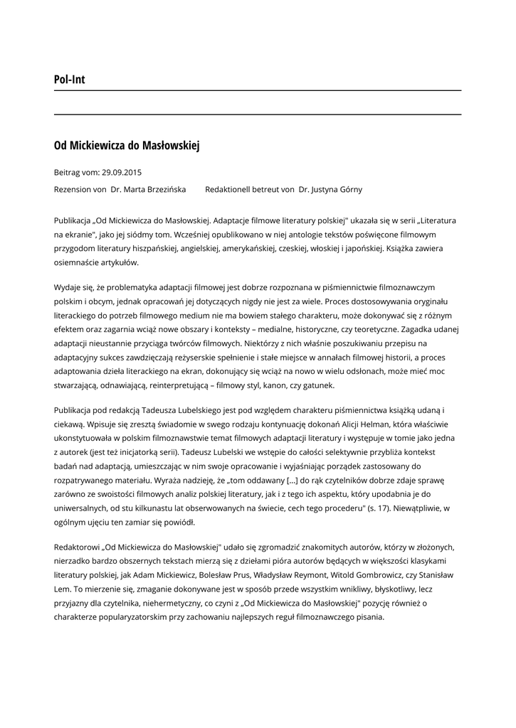 Pol-Int Od Mickiewicza do Masłowskiej Beitrag vom: 29.09.2015 Rezension von Dr. Marta Brzezińska Redaktionell betreut von Dr. Justyna Górny Publikacja „Od Mickiewicza do Masłowskiej. Adaptacje filmowe literatury polskiej" ukazała się w serii „Literatura na ekranie", jako jej siódmy tom. Wcześniej opublikowano w niej antologie tekstów poświęcone filmowym przygodom literatury hiszpańskiej, angielskiej, amerykańskiej, czeskiej, włoskiej i japońskiej. Książka zawiera osiemnaście artykułów. Wydaje się, że problematyka adaptacji filmowej jest dobrze rozpoznana w piśmiennictwie filmoznawczym polskim i obcym, jednak opracowań jej dotyczących nigdy nie jest za wiele. Proces dostosowywania oryginału literackiego do potrzeb filmowego medium nie ma bowiem stałego charakteru, może dokonywać się z różnym efektem oraz zagarnia wciąż nowe obszary i konteksty – medialne, historyczne, czy teoretyczne. Zagadka udanej adaptacji nieustannie przyciąga twórców filmowych. Niektórzy z nich właśnie poszukiwaniu przepisu na adaptacyjny sukces zawdzięczają reżyserskie spełnienie i stałe miejsce w annałach filmowej historii, a proces adaptowania dzieła literackiego na ekran, dokonujący się wciąż na nowo w wielu odsłonach, może mieć moc stwarzającą, odnawiającą, reinterpretującą – filmowy styl, kanon, czy gatunek. Publikacja pod redakcją Tadeusza Lubelskiego jest pod względem charakteru piśmiennictwa książką udaną i ciekawą. Wpisuje się zresztą świadomie w swego rodzaju kontynuację dokonań Alicji Helman, która właściwie ukonstytuowała w polskim filmoznawstwie temat filmowych adaptacji literatury i występuje w tomie jako jedna z autorek (jest też inicjatorką serii). Tadeusz Lubelski we wstępie do całości selektywnie przybliża kontekst badań nad adaptacją, umieszczając w nim swoje opracowanie i wyjaśniając porządek zastosowany do rozpatrywanego materiału. Wyraża nadzieję, że „tom oddawany […] do rąk czytelników dobrze zdaje sprawę zarówno ze swoistości filmowych analiz polskiej literatury, jak i z tego ich aspektu, który upodabnia je do uniwersalnych, od stu kilkunastu lat obserwowanych na świecie, cech tego procederu" (s. 17). Niewątpliwie, w ogólnym ujęciu ten zamiar się powiódł. Redaktorowi „Od Mickiewicza do Masłowskiej" udało się zgromadzić znakomitych autorów, którzy w złożonych, nierzadko bardzo obszernych tekstach mierzą się z dziełami pióra autorów będących w większości klasykami literatury polskiej, jak Adam Mickiewicz, Bolesław Prus, Władysław Reymont, Witold Gombrowicz, czy Stanisław Lem. To mierzenie się, zmaganie dokonywane jest w sposób przede wszystkim wnikliwy, błyskotliwy, lecz przyjazny dla czytelnika, niehermetyczny, co czyni z „Od Mickiewicza do Masłowskiej" pozycję również o charakterze popularyzatorskim przy zachowaniu najlepszych reguł filmoznawczego pisania. Przyglądając się zestawowi tekstów zgromadzonych w tomie można uznać, że udało się w nim zawrzeć coś w rodzaju kanonu – w zakresie zarówno dzieł literackich (rozpoznawalnych, ważnych, lubianych), jak i filmowych. Konstrukcja tomu zasugerowana już w tytule sprzyja takiemu odczytaniu – spina przeszłość filmową i literacką z utworami najnowszymi (choć trzeba przyznać, znacznie mniej licznie reprezentowanymi). Artykuły zgromadzone w tomie poruszają różne aspekty relacji między oryginałem, inspiracją literacką a filmem, omawiają filmowe konkretyzacje ze szczegółami, precyzyjnie odsłaniając ich warstwy, wydobywając najbardziej zajmujące aspekty utworów, a także metod adaptacyjnych. Warto zauważyć, że to opracowania obszerne, z mnogością odwołań, będące w wielu wypadkach zdaniem sprawy z naukowej recepcji danego dzieła jako filmowej adaptacji. Autorzy poruszają się w obrębie szeroko rozumianej klasyki, w zasadzie więc czytelnik nie znajdzie tu nic wyjątkowo zaskakującego. Badacze wyruszając na spotkanie znanych obszarów, próbują jednak niewątpliwie przyjąć nieco inną perspektywę, odświeżyć spojrzenie na każdą z adaptacji. I tak, na przykład Krzysztof Kornacki poświęcając swój artykuł powieści „Popiół i diament" oraz dziełu Wajdy, nie obserwuje podobieństw, wierności a zauważa znaczące różnice między utworami. Wskazując na modyfikacje reżysera, ich przyczyny i skutki dla utworu, zarysowuje szeroki kontekst, tak dla oryginału literackiego, jak i filmu. Dzięki tym rozbudowanym kontekstom można zaobserwować złożone napięcia między utworem literackim a jego finalną, filmową konstrukcją na różnych etapach – od powstawania po krytyczną recepcję. Formowanie się istoty dzieła, podobnie jak jego interpretacja – jak prezentuje badacz – dokonuje się właśnie w ramach tych napięć, a praca Wajdy jako realizatora ukazana zostaje jako dynamiczna gra z oryginałem literackim i scenariuszem. Kilkukrotnie też przedstawione analizy koncentrują się nie tylko na ważnych filmach, czy też arcydziełach filmu polskiego (przypadek międzynarodowych adaptacji prozy Stanisława Lema), ale też prezentują obrazy mniej znane, czy wręcz egzotyczne. W tym kontekście niezwykle ciekawy poznawczo i bardzo oryginalny na tle całości jest artykuł Grażyny Stachówny, traktujący o filmowej przygodzie poezji Wisławy Szymborskiej. Stachówna śledzi inspiracje wierszem „Miłość od pierwszego wejrzenia", jego pozaliterackie i filmowe konteksty, odkrywając przed czytelnikiem znaczenia hongkońskiego filmu „Skręć w lewo, skręć w prawo". Film jest adaptacją powieści graficznej Jimmy'ego Liao, dla którego inspirację stanowił utwór Szymborskiej i – jak podkreśla badaczka – stanowi on ważny składnik filmowego przedstawienia, determinując wiele jego znaczeń zgodnie z intencją poetki. Stachówna podsumowuje: „Wiersz Miłość od pierwszego wejrzenia, wyrosły z doświadczeń Wisławy Szy