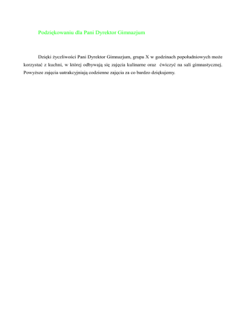 Podziękowaniu dla Pani Dyrektor Gimnazjum Dzięki życzliwości Pani Dyrektor Gimnazjum, grupa X w godzinach popołudniowych może korzystać z kuchni, w której odbywają się zajęcia kulinarne oraz ćwiczyć na sali gimnastycznej. Powyższe zajęcia uatrakcyjniają codzienne zajęcia za co bardzo dziękujemy.