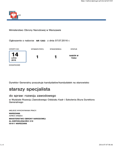 1z4 https://nabory.kprm.gov.pl/site/ad/id/1263 (/) Ministerstwo Obrony Narodowej w Warszawie Ogłoszenie o naborze NR 1263 z dnia 07.07.2016 r. OFERTY DO WYMIAR ETATU STANOWISKA STATUS LIPCA 1 1 NABÓR W TOKU 2016 DODATKOWE Dyrektor Generalny poszukuje kandydatów/kandydatek na stanowisko starszy specjalista do spraw: rozwoju zawodowego w Wydziale Rozwoju Zawodowego Oddziału Kadr i Szkolenia Biura Dyrektora Generalnego MIEJSCE WYKONYWANIA PRACY: WARSZAWA ADRES URZĘDU: MINISTERSTWO OBRONY NARODOWEJ AL.NIEPODLEGŁOŚCI 218 00-911 WARSZAWA 2016-07-07 08:46 2z4 https://nabory.kprm.gov.pl/site/ad/id/1263 WARUNKI PRACY Budynek z podjazdem dla wózków inwalidzkich. Wewnątrz budynku: winda towarowa, drzwi przeciwpożarowe, bardzo ograniczona możliwość poruszania się na wózkach inwalidzkich-konieczna asysta innego pracownika. Nie występują uciążliwe/ szkodliwe/ niebezpieczne warunki pracy. Zagrożenie korupcją oraz częste reprezentowanie urzędu na zewnątrz, wynikające z udziału w spotkaniach negocjacyjnych z przedstawicielami firm i instytucji szkoleniowych, spotkań bezpośrednich oraz kontaktów mailowych i telefonicznych z przedstawicielami firm i instytucji szkoleniowych. ZAKRES ZADAŃ Kierowanie członków korpusu służby cywilnej na otwarte formy doskonalenia zawodowego (m.in. szkolenia centralne, szkolenia zewnętrzne, szkolenia w Krajowej Szkole Administracji Publicznej, zagraniczne szkolenia, staże i programy stypendialne, studia wyższe, aplikacje, kursy językowe) oraz monitorowanie ich przebiegu. Organizowanie lub koordynowanie realizacji zamkniętych form doskonalenia zawodowego (szkoleń wewnętrznych i kaskadowych). Koordynowanie ustalania indywidualnych programów rozwoju zawodowego (IPRZ) członków korpusu służby cywilnej, w tym osób zajmujących wyższe stanowiska w służbie cywilnej. Współudział w analizowaniu potrzeb doskonalenia zawodowego oraz planowaniu projektów szkoleniowych członków korpusu służby cywilnej zatrudnionych w Ministerstwie Obrony Narodowej. Organizowanie i monitorowanie przebiegu służby przygotowawczej dla osób podejmujących po raz pierwszy pracę w służbie cywilnej oraz realizowanie procesu adaptacji nowozatrudnionych pracowników w MON. Zarządzanie szkoleniami realizowanymi w formie e-learningowej oraz aktualizowanie bazy materiałów szkoleniowych Ministerstwa. Udział w procedurze naboru na wolne stanowiska w strukturach Unii Europejskiej, delegowaniu ekspertów narodowych i krajowych ekspertów cywilnych do pracy w instytucjach unijnych oraz obserwatorów do misji obserwacyjnych. WYMAGANIA NIEZBĘDNE Wykształcenie: wyższe powyżej 1 roku doświadczenia w obszarze rozwoju zawodowego poświadczenie bezpieczeństwa o klauzuli „poufne” lub zgoda na przeprowadzenie postępowania sprawdzającego w celu uzyskania poświadczenia bezpieczeństwa do klauzuli „poufne” znajomość: ustawy o służbie cywilnej, rozporządzenia Prezesa Rady Ministrów w sprawie szkoleń w służbie cywilnej, rozporządzenia Ministra Nauki i Szkolnictwa Wyższego w sprawie warunków kierowania osób za granicę w celach naukowych, dydaktycznych i szkoleniowych oraz szczególnych uprawnień tych osób, Kodeksu pracy w zakresie podnoszenia kwalifikacji zawodowych, problematyki z zakresu zarządzania zasobami ludzkimi, w szczególności zarządzania szkoleniami, struktury organizacyjnej MON umiejętność: organizacji pracy własnej, współpracy z innymi, dążenia do rezultatu, poszukiwania rozwiązań, komunikacji, w tym komunikacji pisemnej. 2016-07-07 08:46 3z4 https://nabory.kprm.gov.pl/site/ad/id/1263 Posiadanie obywatelstwa polskiego Korzystanie z pełni praw publicznych Nieskazanie prawomocnym wyrokiem za umyślne przestępstwo lub umyślne przestępstwo skarbowe DOKUMENTY I OŚWIADCZENIA NIEZBĘDNE Życiorys/CV i list motywacyjny Kopie dokumentów potwierdzających spełnienie wymagania niezbędnego w zakresie wykształcenia kopie dokumentów potwierdzających powyżej 1 roku doświadczenia w obszarze rozwoju zawodowego (np. kopie świadectw pracy, zaświadczenie o zatrudnieniu) kopia poświadczenia bezpieczeństwa uprawniającego do dostępu do informacji niejawnych oznaczonych klauzulą "poufne" lub oświadczenie o wyrażeniu zgody na przeprowadzenie postępowania sprawdzającego zgodnie z ustawą z dnia 5 sierpnia 2010 r. o ochronie informacji niejawnych (Dz. U. Nr 182, poz. 1228 ze zm.), Oświadczenie o posiadaniu obywatelstwa polskiego albo kopia dokumentu potwierdzającego posiadanie polskiego obywatelstwa Oświadczenie o wyrażeniu zgody na przetwarzanie danych osobowych do celów naboru Oświadczenie o korzystaniu z pełni praw publicznych Oświadczenie o nieskazaniu prawomocnym wyrokiem za umyślne przestępstwo lub umyślne przestępstwo skarbowe DOKUMENTY I OŚWIADCZENIA DODATKOWE Kopia dokumentu potwierdzającego niepełnosprawność - w przypadku kandydatek/kandydatów, zamierzających skorzystać z pierwszeństwa w zatrudnieniu w przypadku, gdy znajdą się w gronie najlepszych kandydatek/kandydatów TERMINY I MIEJSCE SKŁADANIA DOKUMENTÓW Dokumenty należy złożyć do: 14.07.2016 Decyduje data: wpływu oferty do urzędu Miejsce składania dokumentów: Ministerstwo Obrony Narodowej Al. Niepodległości 218 00-911 Warszawa Dokumenty można składać osobiście - Punkt podawczy MON, Al. Niepodległości 218 - wejście od ul. Filtrowej (pn-pt, w godz.7.00-18.00.) Na kopercie należy zamieścić nr oferty z BIP KPRM. INNE INFORMACJE: W miesiącu poprzedzającym datę upublicznienia ogłoszenia wskaźnik zatrudnienia osób niepełnosprawnych w urzędzie, w rozumieniu przepisów o rehabilitacji zawodowej i społecznej oraz zatrudnianiu osób niepełnosprawnych, nie wynosi co najmniej 6%. Ogłoszenie o naborze w celu zastępstwa nieobecnego członka korpusu służby cywilnej. Wynagrodzenie na ww. stanowisku wynosi około 3300 zł brutto plus dodatek za wysługę lat. Weryfikacja spełnienia przez kandydatów wymagań f