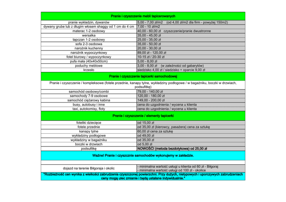 Pranie i czyszczenie mebli tapicerowanych pranie wykładzin, dywanów dywany grube lub z długim włosem shaggy od 1 cm do 4 cm materac 1-2 osobowy wersalka tapczan 1-2 osobowy sofa 2-3 osobowa narożnik kuchenny narożnik wypoczynkowy fotel biurowy / wypoczynkowy pufa mała (40x40x50cm) poduchy meblowe krzesło 5,00 - 7,00 zł/m2 (od 4,00 zł/m2 dla firm - powyżej 150m2) 7,00 - 10 zł/m2 40,00 - 60,00 zł czyszczenie/pranie dwustronne 35,00 - 45,00 zł 25,00 - 35,00 zł 35,00 - 50,00 zł 20,00 - 30,00 zł 89,00 zł - 120,00 zł 10-15 zł / 20-30 zł 5,00 - 8,00 zł 3,00 - 8,00 zł (w zależności od gabarytów) siedzisko 4,00 zł / siedzisko + oparcie 9,00 zł Pranie i czyszczenie tapicerki samochodowej Pranie i czyszczenie / kompleksowe (fotele przednie, kanapy tylne, wykładziny podłogowe / w bagażniku, boczki w drzwiach, podsufitkę) samochód osobowy/combi 79,00 - 140,00 zł samochody 7-9 osobowe 120,00 - 180,00 zł samochód ciężarowy kabina 149,00 - 200,00 zł busy, autobusy i inne cena do uzgodnienia / wycena u klienta taxi, autokomisy, floty cena do uzgodnienia / wycena u klienta Pranie i czyszczenie / elementy tapicerki foteliki dziecięce fotele przednie kanapy tylne wykładziny podłogowe wykładziny w bagażniku boczki w drzwiach podsufitkę od 15,00 zł od 35,00 zł (kierowcy, pasażera) cena za sztukę 60,00 zł cena za sztukę od 49,00 zł od 35,00 zł od 5,00 zł NOWOŚĆ! (metoda bezdotykowa) od 25,00 zł Ważne! Pranie i czyszcznie samochodów wykonujemy w zakładzie. - minimalna wartość usługi u klienta od 60 zł - Biłgoraj - minimalna wartość usługi od 100 zł - okolice "Rozbieżność cen wynika z wielkości zabrudzenia czyszczonej powierzchni. Przy dużych, nietypowych i uporczywych zabrudzeniach ceny mogą ulec zmianie i będą ustalane indywidualnie." dojazd na terenie Biłgoraja i okolic
