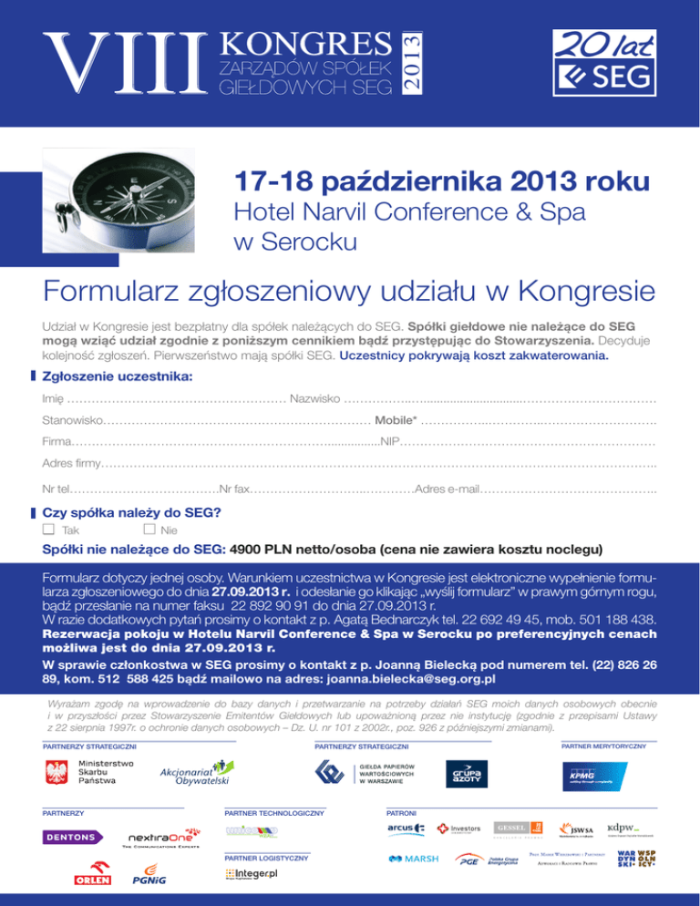 2013 17-18 października 2013 roku Hotel Narvil Conference & Spa w Serocku Formularz zgłoszeniowy udziału w Kongresie Udział w Kongresie jest bezpłatny dla spółek należących do SEG. Spółki giełdowe nie należące do SEG mogą wziąć udział zgodnie z poniższym cennikiem bądź przystępując do Stowarzyszenia. Decyduje kolejność zgłoszeń. Pierwszeństwo mają spółki SEG. Uczestnicy pokrywają koszt zakwaterowania. Zgłoszenie uczestnika: Imię ……………………………………………… Nazwisko ……………..…..............................…………………………… Stanowisko………………………………………………………… Mobile* ……………..…………..………………………. Firma………………………………………………………................NIP……………………………………………………… Adres firmy……………………………………………………………………………………………………………………….. Nr tel……………………………….Nr fax………………………..…………Adres e-mail…………………………………….. Czy spółka należy do SEG? Tak Nie Spółki nie należące do SEG: 4900 PLN netto/osoba (cena nie zawiera kosztu noclegu) Formularz dotyczy jednej osoby. Warunkiem uczestnictwa w Kongresie jest elektroniczne wypełnienie formularza zgłoszeniowego do dnia 27.09.2013 r. i odesłanie go klikając „wyślij formularz” w prawym górnym rogu, bądź przesłanie na numer faksu 22 892 90 91 do dnia 27.09.2013 r. W razie dodatkowych pytań prosimy o kontakt z p. Agatą Bednarczyk tel. 22 692 49 45, mob. 501 188 438. Rezerwacja pokoju w Hotelu Narvil Conference & Spa w Serocku po preferencyjnych cenach możliwa jest do dnia 27.09.2013 r. W sprawie członkostwa w SEG prosimy o kontakt z p. Joanną Bielecką pod numerem tel. (22) 826 26 89, kom. 512 588 425 bądź mailowo na adres: [email protected] Wyrażam zgodę na wprowadzenie do bazy danych i przetwarzanie na potrzeby działań SEG moich danych osobowych obecnie i w przyszłości przez Stowarzyszenie Emitentów Giełdowych lub upoważnioną przez nie instytucję (zgodnie z przepisami Ustawy z 22 sierpnia 1997r. o ochronie danych osobowych – Dz. U. nr 101 z 2002r., poz. 926 z późniejszymi zmianami). strona | 3 PARTNERZY STRATEGICZNI PARTNERZY PARTNERZY STRATEGICZNI PARTNER TECHNOLOGICZNY PARTNER LOGISTYCZNY PATRONI PARTNER MERYTORYCZNY 2013 Czy będzie Pani/Pan korzystać z noclegu w Hotelu Narvil? Tak Nie Proszę o rezerwację pokoju w terminie 17-18 października 2013 r. Tak Nie Czy będzie Pani/Pan uczestniczyć w biegu w dniu 17 października 2013 r.? Tak Nie Czy będzie Pani/Pan uczestniczyć w Uroczystej Kolacji w dniu 17 października 2013 r.? Tak Nie Cena pokoju jednoosobowego ze śniadaniem wynosi 320,00 PLN + 8% VAT, cena pokoju dwu345,00 PLN + 8% VAT osobowego ze śniadaniem wynosi Doba hotelowa rozpoczyna się o godz. 16.00 i trwa do godz. 12.00 dnia następnego. Wcześniejsza dostępność pokoi w miarę wolnych miejsc. Organizator oferuje również bezpieczne miejsce do przechowywania bagażu. Płatności: a. opłata za hotel: Karta płatnicza: Nr karty płatniczej…………………………………………………… Ważna do…………………………………………..…… Rodzaj karty płatniczej…………………………………………………………………………………….…………….……….. Przelew na rachunek hotelu 50 1240 1112 1111 0010 4025 3494 prosimy podać w tytule wpłaty: „Imię i Nazwisko oraz VIII Kongres Zarządów Spółek Giełdowych SEG 17-18.09.2013 r.” poważniam Hotel Narvil do pobrania z mojej karty płatniczej kwoty w wysokości U 320,00 PLN 345,00 PLN + 8% VAT na poczet pokrycia kosztów noclegu. Jednocześnie zostałem/łam poinformowany/a o braku możliwości zwrotu wpłaconych środków w przypadku rezygnacji z noclegu po dniu 27.09.2013 r. DOTYCZY TYLKO SPÓŁEK NIECZŁONKOWSKICH b. spółka giełdowa nie należąca do SEG: Przelew (4900 PLN netto/osoba) na rachunek Stowarzyszenia Emitentów Giełdowych 89 1500 1126 1211 2009 4600 0000 prosimy podać w tytule wpłaty: „Imię i Nazwisko oraz VIII Kongres Zarządów Spółek Giełdowych SEG 17-18.09.2013 r.” W której grupie będzie Pani/Pan uczestniczyć podczas warsztatów tematycznych?* Proszę zaznaczyć dwie grupy. Grupa I Prognozy finansowe jako wsparcie dla budowania długoterminowej strategii rozwoju. Wzrost przez akwizycje, wycena, szacowanie synergii i fairness opinion Tomasz Wiśniewski, Partner i Szef Zespołu Wycen i Modelowania, KPMG w Polsce Marcin Łągiewka, Dyrektor w Zespole Wycen i Modelowania, KPMG w Polsce Grupa II Ubezpieczenie D&O jako praktyczne narzędzie zarządzania ryzykiem odpowiedzialności kadry menedżerskiej w zakresie realizacji strategii firmy Włodzimierz Pyszczek, Kierownik Zespołu FINPRO (Ubezpieczenia finansowe i profesjonalne), Marsh Polska. Jakub Płócienniczak, Starszy Broker Specjalista, Zespół FINPRO (Ubezpieczenia finansowe i profesjonalne), Marsh Polska Grupa III Optymalizowanie procesu podejmowania decyzji Zarządu Justyna Kubicka-Daab, Partner, Amrop Grupa IV Jak poprawnie skonstruować kontrakt menedżerski Sebastian Rudnicki, Radca Prawny, Senior Associate, Prof. Marek Wierzbowski i Partnerzy Adwokaci i Radcowie Prawni Łukasz Adamczyk, Doradca Podatkowy, Prof. Marek Wierzbowski i Partnerzy Adwokaci i Radcowie Prawni Grupa V Relacje pomiędzy Zarządem i Radą Nadzorczą w praktyce i w przepisach prawa Leszek Koziorowski, Wspólnik, GESSEL Koziorowski Grupa VI Wrogie przejęcia spółek kapitałowych – czy i jak należy się przed nimi bronić? Kinga Ziemnicka, Radca Prawny, Wardyński i Wspólnicy Krzysztof Libiszewski, Wspólnik, Radca Prawny, Wardyński i Wspólnicy Danuta Pajewska, Starszy Wspólnik, Radca Prawny, Wardyński i Wspólnicy Grupa VII Warsz
