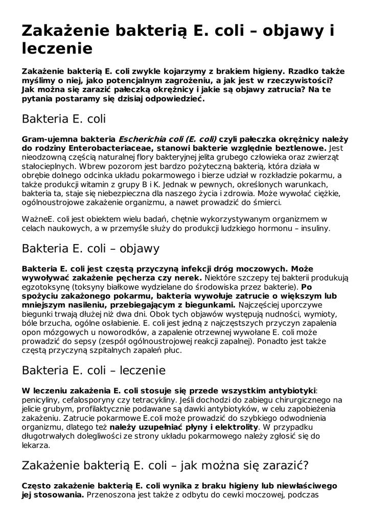 Zakażenie bakterią E. coli – objawy i leczenie Zakażenie bakterią E. coli zwykle kojarzymy z brakiem higieny. Rzadko także myślimy o niej, jako potencjalnym zagrożeniu, a jak jest w rzeczywistości? Jak można się zarazić pałeczką okrężnicy i jakie są objawy zatrucia? Na te pytania postaramy się dzisiaj odpowiedzieć. Bakteria E. coli Gram-ujemna bakteria Escherichia coli (E. coli) czyli pałeczka okrężnicy należy do rodziny Enterobacteriaceae, stanowi bakterie względnie beztlenowe. Jest nieodzowną częścią naturalnej flory bakteryjnej jelita grubego człowieka oraz zwierząt stałocieplnych. Wbrew pozorom jest bardzo pożyteczną bakterią, która działa w obrębie dolnego odcinka układu pokarmowego i bierze udział w rozkładzie pokarmu, a także produkcji witamin z grupy B i K. Jednak w pewnych, określonych warunkach, bakteria ta, staje się niebezpieczna dla naszego życia i zdrowia. Może wywołać ciężkie, ogólnoustrojowe zakażenie organizmu, a nawet prowadzić do śmierci. WażneE. coli jest obiektem wielu badań, chętnie wykorzystywanym organizmem w celach naukowych, a w przemyśle służy do produkcji ludzkiego hormonu – insuliny. Bakteria E. coli – objawy Bakteria E. coli jest częstą przyczyną infekcji dróg moczowych. Może wywoływać zakażenie pęcherza czy nerek. Niektóre szczepy tej bakterii produkują egzotoksynę (toksyny białkowe wydzielane do środowiska przez bakterie). Po spożyciu zakażonego pokarmu, bakteria wywołuje zatrucie o większym lub mniejszym nasileniu, przebiegającym z biegunkami. Najczęściej uporczywe biegunki trwają dłużej niż dwa dni. Obok tych objawów występują nudności, wymioty, bóle brzucha, ogólne osłabienie. E. coli jest jedną z najczęstszych przyczyn zapalenia opon mózgowych u noworodków, a zapalenie otrzewnej wywołane E. coli może prowadzić do sepsy (zespół ogólnoustrojowej reakcji zapalnej). Ponadto jest także częstą przyczyną szpitalnych zapaleń płuc. Bakteria E. coli – leczenie W leczeniu zakażenia E. coli stosuje się przede wszystkim antybiotyki: penicyliny, cefalosporyny czy tetracykliny. Jeśli dochodzi do zabiegu chirurgicznego na jelicie grubym, profilaktycznie podawane są dawki antybiotyków, w celu zapobieżenia zakażeniu. Zatrucie pokarmowe E.coli może prowadzić do szybkiego odwodnienia organizmu, dlatego też należy uzupełniać płyny i elektrolity. W przypadku długotrwałych dolegliwości ze strony układu pokarmowego należy zgłosić się do lekarza. Zakażenie bakterią E. coli – jak można się zarazić? Często zakażenie bakterią E. coli wynika z braku higieny lub niewłaściwego jej stosowania. Przenoszona jest także z odbytu do cewki moczowej, podczas niewłaściwego podcierania. Poza tym, bakteria ta jest szeroko rozprzestrzeniona w środowisku. W glebie, czasem w wodzie, poprzez zanieczyszczenie fekaliami. Poza tym E. coli w naszym organizmie może się pojawić za pośrednictwem niemytych rąk czy zakażonego pożywienia. Cewnikowanie pacjentów w szpitalach, również sprzyja zakażeniu. Należy także pamiętać, że bakteria E. coli często mutuje, dlatego też może stanowić poważne zagrożenie dla naszego organizmu. Bakteria E. coli jest bardzo dobrze rozprzestrzenionym mikroorganizmem w naszym środowisku. Zasiedla także nasze jelita i pełni rolę organizmu symbiotycznego. Jednak niekiedy stwarza bardzo poważne zagrożenie dla naszego zdrowia. Może prowadzić do poważnych zatruć, sepsy czy w konsekwencji śmierci. Dlatego też tak ważne jest przestrzeganie zasad higieny i unikanie zagrożenia, jakim może stać się E. coli. Author: Aleksandra Musiał Link do artykułu: http://bonavita.pl/zakazenie-bakteria-e-coli-objawy-i-leczenie