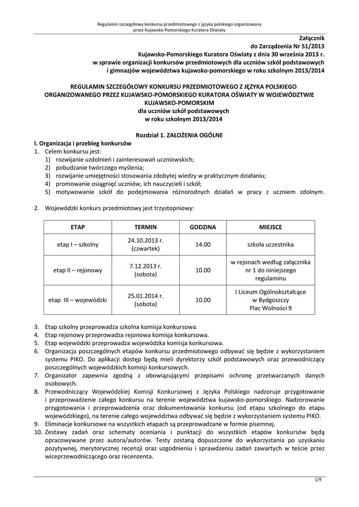 Regulamin szczegółowy konkursu przedmiotowego z języka polskiego organizowany przez Kujawsko-Pomorskiego Kuratora Oświaty Załącznik do Zarządzenia Nr 51/2013 Kujawsko-Pomorskiego Kuratora Oświaty z dnia 30 września 2013 r. w sprawie organizacji konkursów przedmiotowych dla uczniów szkół podstawowych i gimnazjów województwa kujawsko-pomorskiego w roku szkolnym 2013/2014 REGULAMIN SZCZEGÓŁOWY KONKURSU PRZEDMIOTOWEGO Z JĘZYKA POLSKIEGO ORGANIZOWANEGO PRZEZ KUJAWSKO-POMORSKIEGO KURATORA OŚWIATY W WOJEWÓDZTWIE KUJAWSKO-POMORSKIM dla uczniów szkół podstawowych w roku szkolnym 2013/2014 Rozdział 1. ZAŁOŻENIA OGÓLNE I. Organizacja i przebieg konkursów 1. Celem konkursu jest: 1) rozwijanie uzdolnień i zainteresowań uczniowskich; 2) pobudzanie twórczego myślenia; 3) rozwijanie umiejętności stosowania zdobytej wiedzy w praktycznym działaniu; 4) promowanie osiągnięć uczniów, ich nauczycieli i szkół; 5) motywowanie szkół do podejmowania różnorodnych działań w pracy z uczniem zdolnym. 2. Wojewódzki konkurs przedmiotowy jest trzystopniowy: 3. 4. 5. 6. 7. 8. 9. 10. ETAP TERMIN GODZINA MIEJSCE etap I – szkolny 24.10.2013 r. (czwartek) 14.00 szkoła uczestnika etap II – rejonowy 7.12.2013 r. (sobota) 10.00 w rejonach według załącznika nr 1 do niniejszego regulaminu etap III – wojewódzki 25.01.2014 r. (sobota) 10.00 I Liceum Ogólnokształcące w Bydgoszczy Plac Wolności 9 Etap szkolny przeprowadza szkolna komisja konkursowa. Etap rejonowy przeprowadza rejonowa komisja konkursowa. Etap wojewódzki przeprowadza wojewódzka komisja konkursowa. Organizacja poszczególnych etapów konkursu przedmiotowego odbywać się będzie z wykorzystaniem systemu PIKO. Do aplikacji dostęp będą mieli dyrektorzy szkół podstawowych oraz przewodniczący poszczególnych wojewódzkich komisji konkursowych. Organizator zapewnia zgodną z obowiązującymi przepisami ochronę przetwarzanych danych osobowych. Przewodniczący Wojewódzkiej Komisji Konkursowej z Języka Polskiego nadzoruje przygotowanie i przeprowadzenie całego konkursu na terenie województwa kujawsko-pomorskiego. Nadzorowanie przygotowania i przeprowadzenia oraz dokumentowania konkursu (od etapu szkolnego do etapu wojewódzkiego), na terenie całego województwa odbywać się będzie z wykorzystaniem systemu PIKO. Eliminacje konkursowe na wszystkich etapach są przeprowadzane w formie pisemnej. Zestawy zadań oraz schematy oceniania i punktacji do wszystkich etapów konkursów będą opracowywane przez autora/autorów. Testy zostaną dopuszczone do wykorzystania po uzyskaniu pozytywnej, merytorycznej recenzji oraz uzgodnieniu i sprawdzeniu zadań zawartych w teście przez wiceprzewodniczącego oraz recenzenta. 1/9 Regulamin szczegółowy konkursu przedmiotowego z języka polskiego organizowany przez Kujawsko-Pomorskiego Kuratora Oświaty 11. Konkurs przeprowadza się w wydzielonych salach z uwzględnieniem zasady samodzielności. Prace pisemne są anonimowe i kodowane. 12. Na wszystkich etapach konkursu w sali mogą przebywać wyłącznie uczestnicy konkursu, członkowie komisji konkursowej oraz obserwatorzy z ramienia kuratora oświaty. W składzie komisji nie może zasiadać nauczyciel, który jest rodzicem uczestnika danego etapu konkursu. 13. Niestawienie się ucznia, o godzinie wyznaczonej jako rozpoczęcie konkursu, oznacza rezygnację z udziału w konkursie. Każdy uczestnik jest zobowiązany mieć ze sobą ważną legitymację szkolną. 14. Sprawy nieuregulowane w niniejszym regulaminie, w tym uczestnika ze specjalnymi potrzebami, rozstrzyga przewodniczący właściwej komisji konkursowej, w porozumieniu z dyrektorem Wydziału Rozwoju Edukacji Kuratorium Oświaty w Bydgoszczy. 1. 2. 3. 4. 5. 6. Rozdział 2. ORGANIZACJA I ZADANIA SZKOLNEJ KOMISJI KONKURSU PRZEDMIOTOWEGO Etap szkolny organizuje i przeprowadza na własny koszt szkolna komisja konkursowa 24 października 2013 roku, o godz. 14.00. Czas pracy uczniów zaczyna liczyć się od chwili otrzymania przez nich arkusza z zadaniami i na etapie szkolnym trwa 60 minut. Arkusz z zadaniami będzie zawierał zadania gramatyczno-ortograficzne o charakterze sprawdzającym. W etapie rejonowym konkursu może wziąć udział uczeń, który uzyskał, co najmniej 65% punktów możliwych do uzyskania na etapie szkolnym. Do etapu rejonowego ostatecznej kwalifikacji dokonuje rejonowa komisja konkursowa. Zadania dyrektora szkoły: 1) przekazuje uczniom, nauczycielom i rodzicom (opiekunom prawnym) informacje o organizacji i regulaminie konkursu; 2) powołuje (w formie pisemnej) szkolną komisję konkursową, w skład której wchodzi co najmniej dwóch nauczycieli, z których co najmniej jeden reprezentuje przedmiot konkursu (załącznik nr 4 do Regulaminu ogólnego konkursów w r. szk. 2013/2014); 3) uzyskuje zgodę rodziców (opiekunów prawnych) uczniów biorących udział w konkursie na przetwarzanie do celów konkursu danych osobowych uczniów oraz uzyskuje ich potwierdzenie, że zapoznali się z regulaminem i akceptują jego postanowienia (załącznik nr 2 do Regulaminu ogólnego konkursów w r. szk. 2013/2014); 4) zapewnia opiekę uczniom swojej szkoły uczestniczącym w etapie szkolnym w innej szkole, jeżeli w szkole, którą kieruje nie jest organizowany etap szkolny konkursu; 5) zgłasza szkołę, za pomocą narzędzi udostępnionych w systemie PIKO, do konkursu przedmiotowego (przy czym, możliwość dokonania zgłoszenia szkoły w PIKO jest ograniczona wyłącznie do dyrektorów, którzy w systemie mają przypisane szkoły podstawowe); 6) dokonuje rejestracji w systemie PIKO wszystkich uczestników konkursu z danej szkoły we wskazanym przez organizatora terminie, o którym informacja zostanie opublikowana w serwisie PIKO, (podaje dokładne dane osobowe ucznia, w tym – jeżeli uczeń posiada – dwa imiona). Jest odpowiedzialny za poprawność wprowadzonych danych uczestnika konkursu. 7) przygotowuje materiały do przeprowadzenia szkolnego etapu