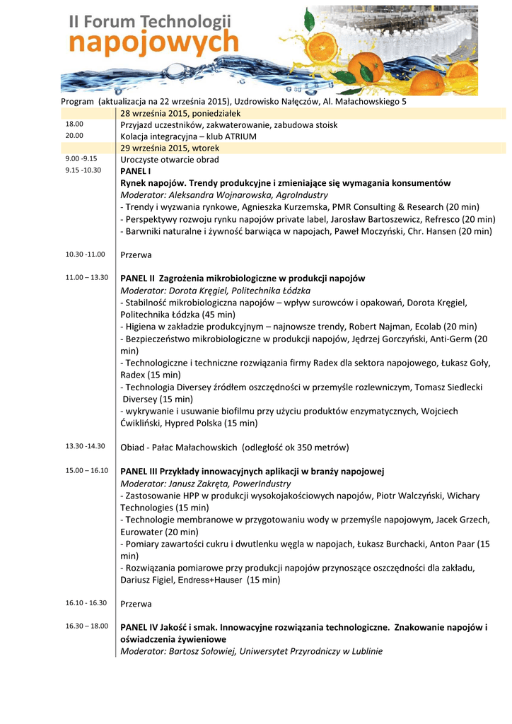 Program (aktualizacja na 22 września 2015), Uzdrowisko Nałęczów, Al. Małachowskiego 5 28 września 2015, poniedziałek 18.00 Przyjazd uczestników, zakwaterowanie, zabudowa stoisk 20.00 Kolacja integracyjna – klub ATRIUM 29 września 2015, wtorek 9.00 -9.15 Uroczyste otwarcie obrad 9.15 -10.30 PANEL I Rynek napojów. Trendy produkcyjne i zmieniające się wymagania konsumentów Moderator: Aleksandra Wojnarowska, AgroIndustry - Trendy i wyzwania rynkowe, Agnieszka Kurzemska, PMR Consulting & Research (20 min) - Perspektywy rozwoju rynku napojów private label, Jarosław Bartoszewicz, Refresco (20 min) - Barwniki naturalne i żywność barwiąca w napojach, Paweł Moczyński, Chr. Hansen (20 min) 10.30 -11.00 Przerwa 11.00 – 13.30 PANEL II Zagrożenia mikrobiologiczne w produkcji napojów Moderator: Dorota Kręgiel, Politechnika Łódzka - Stabilność mikrobiologiczna napojów – wpływ surowców i opakowań, Dorota Kręgiel, Politechnika Łódzka (45 min) - Higiena w zakładzie produkcyjnym – najnowsze trendy, Robert Najman, Ecolab (20 min) - Bezpieczeństwo mikrobiologiczne w produkcji napojów, Jędrzej Gorczyński, Anti-Germ (20 min) - Technologiczne i techniczne rozwiązania firmy Radex dla sektora napojowego, Łukasz Goły, Radex (15 min) - Technologia Diversey źródłem oszczędności w przemyśle rozlewniczym, Tomasz Siedlecki Diversey (15 min) - wykrywanie i usuwanie biofilmu przy użyciu produktów enzymatycznych, Wojciech Ćwikliński, Hypred Polska (15 min) 13.30 -14.30 Obiad - Pałac Małachowskich (odległość ok 350 metrów) 15.00 – 16.10 PANEL III Przykłady innowacyjnych aplikacji w branży napojowej Moderator: Janusz Zakręta, PowerIndustry - Zastosowanie HPP w produkcji wysokojakościowych napojów, Piotr Walczyński, Wichary Technologies (15 min) - Technologie membranowe w przygotowaniu wody w przemyśle napojowym, Jacek Grzech, Eurowater (20 min) - Pomiary zawartości cukru i dwutlenku węgla w napojach, Łukasz Burchacki, Anton Paar (15 min) - Rozwiązania pomiarowe przy produkcji napojów przynoszące oszczędności dla zakładu, Dariusz Figiel, Endress+Hauser (15 min) 16.10 - 16.30 Przerwa 16.30 – 18.00 PANEL IV Jakość i smak. Innowacyjne rozwiązania technologiczne. Znakowanie napojów i oświadczenia żywieniowe Moderator: Bartosz Sołowiej, Uniwersytet Przyrodniczy w Lublinie - Shalgam, Boza, Hardaliye - prozdrowotne napoje bezalkoholowe, Bartosz Sołowiej, Uniwersytet Przyrodniczy w Lublinie (20 min) - Probiotyczne napoje fermentowane, Waldemar Gustaw, Uniwersytet Przyrodniczy w Lublinie (20 min) - Polskie owoce – naturalność i zdrowe trendy, Dorota Łuszczek, Vimax (15 min) - Oświadczenia żywieniowe i znakowanie napojów, Regina Wierzejska, Instytut Żywności i Żywienia (35 min) 19.00 9.00 – 10.00 Uroczysta kolacja – Pałac Małachowskich 30 września 2015, środa PANEL V Zarządzanie produkcją, remontami i utrzymaniem ruchu w zakładzie produkcyjnym Moderator: Aleksandra Wojnarowska, AgroIndustry - Ochrona i rozprowadzanie przewodów wzdłuż linii montażowych i produkcyjnych, Elżbieta Dusowska, ASTE (15 min) - Kogeneracja jako ekologiczne i ekonomiczne rozwiązanie podnoszące bezpieczeństwo energetyczne całego zakładu, Łukasz Wilczyński, KWE (20 min) Po ostatnim wykładzie – losowanie nagród dla słuchaczy 10.15 11.30 Ok. 12.30 Wyjazd na wycieczkę techniczną (we własnym zakresie) Zbiórka przed zakładem. Zwiedzanie zakładu – Zbyszko Company w Radomiu, ul. Warszawska 239 Zakończenie Forum