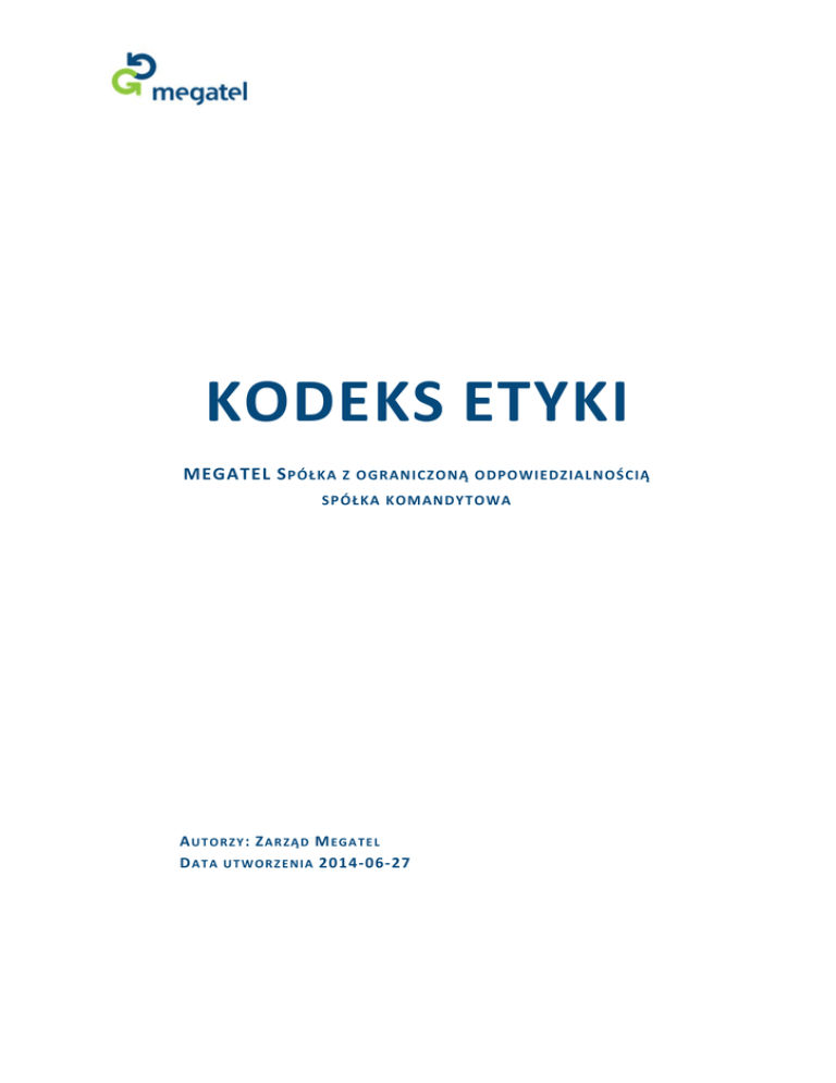 KODEKS ETYKI MEGATEL S PÓŁKA Z OGRANICZONĄ ODPOWIEDZIALNOŚCIĄ SPÓŁKA KOMANDYTOWA AUTORZY: ZARZĄD MEGATEL D A T A U T W O R Z E N I A 2014‐06‐27 I. N AJWYŻSZE STANDARDY ETYCZNE . Firma Megatel jest przekonana o wadze przestrzegania w ramach swoich praktyk obowiązujących uregulowań, przepisów prawnych i postępowania, zgodnie z wyznaczonymi sobie standardami etycznymi. Megatel wierzy, że stosowanie niniejszych standardów w relacjach z pracownikami, współpracownikami i kontrahentami będzie wyróżniało Megatel pod kątem przejrzystości, staranności i dyscypliny pracy, co wpłynie zarówno na postrzeganie Megatel jako firmy, jak również upowszechnianie standardów etycznych w biznesie. Firma Megatel jest zobowiązana do zachowania wysokich standardów etycznych we wszystkich swoich działaniach, przestrzegania praw pracownika, uczciwości wobec kontrahentów i dostawców oraz ochrony środowiska przez zrównoważony rozwój. Odpowiedzialność za osiągnięcie tego celu spoczywa na wszystkich pracownikach firmy Megatel. Firma Megatel stoi na stanowisku, że we wszystkich działaniach niezbędne jest zachowanie podstawowych wartości etycznych i uznanie zobowiązań wobec wszystkich zainteresowanych działalnością firmy. Uczciwość jest warunkiem koniecznym dla osiągnięcia stabilności i sukcesu. Dobra reputacja firmy i zaufanie do niej jest jedną z największych wartości Megatel, która zapewnia jej długoterminowy rozwój. Kodeks powinien być stosowany przez pracowników i współpracowników Megatel w stosunku do współpracowników, przełożonych oraz klientów, partnerów i społeczności lokalnych ‐ zarówno w relacjach biznesowych, jak i okołobiznesowych. Niniejszy kodeks jest rozpowszechniany przez Zarząd Megatel. II. W ARTOŚCI M EGATEL . Megatel jest przekonane o ogromnej wadze etyki we wszystkich działaniach biznesowych i okołobiznesowych. Megatel stanowczo potępia wszelkie nieetyczne działania, które prowadzą do krótkoterminowego zysku, jednak stoją w sprzeczności z przekonaniami założycieli Megatel. Niniejszy kodeks ma służyć przestrzeganiu podstawowych wartości, jakie przyjmuje Megatel, tj.: a) uczciwości w relacjach z pracownikami, współpracownikami, kontrahentami, przedstawicielami władz rządowych i samorządowych oraz środowiskami lokalnymi, b) budowaniu zaufania we wzajemnych relacjach z otoczeniem Megatel i dbałości o utrzymywanie tego zaufania, c) przejrzystości wszystkich działań, w tym zwłaszcza przejrzystości działań podejmowanych wobec podmiotów rządowych i samorządowych, d) sprawiedliwości i godnego traktowania pracowników oraz współpracowników Megatel. www.megatel.com.pl Strona 1 z 5 III. D BAŁOŚĆ O NAJWYŻSZE STANDARDY PRACY . Firma Megatel szanuje i przestrzega międzynarodowych standardów dotyczących praw człowieka oraz międzynarodowych standardów pracy, traktując je jako fundamentalne i powszechne. Respektuje i realizuje przepisy prawa pracy oraz bezpieczeństwa i higieny pracy, a także dba, by pracownicy zawsze byli traktowani zgodnie z mającymi zastosowanie wymogami. Megatel przestrzega zakazu dyskryminacji ze względu na: rasę, status społeczny, pochodzenie etniczne, religię, upośledzenie, inwalidztwo, płeć, orientację seksualną, związek lub przynależność polityczną, wiek czy stan cywilny. Gwarantuje wolność poglądów, sumienia i religii oraz swobodę przekonań i wypowiedzi. Firma Megatel chroni prawa autorskie, szanuje własność intelektualną jako dobro indywidualne, bezpieczne od nadużyć. IV. B RAK TOLERANCJI DLA KORUPCJI , UCZCIWA KONKURENCJA . Firma Megatel przestrzega zasad uczciwej konkurencji, zapobiegania przekupstwu, nielegalnym płatnościom i korupcji. Na każdym etapie swojej działalności Megatel dba o przejrzystość i transparentność swoich działań. Obowiązkiem pracowników Megatel jest unikanie działań korupcyjnych i takich, które mogłyby być uznane za korupcyjne, w tym w szczególności: a) przyjmowanie i oferowanie prezentów w ramach prowadzenia działalności biznesowo‐ handlowej, b) przyjmowanie albo proponowanie urzędnikom państwowym lub przedstawicielom partii politycznych świadczeń pieniężnych, które miałyby doprowadzić do zawarcia lub zachowania transakcji, c) Pracownicy Megatel nie mogą czerpać jakichkolwiek korzyści osobistych ani pomagać w osiąganiu korzyści osobom trzecim nadużywając informacji uzyskanych w związku z wykonywaniem pracy w Megatel lub stanowiska piastowanego w Megatel. V. S TOSUNKI Z PRACOWNIKAMI . Relacje Megatel z pracownikami i współpracownikami opierają się na następujących zasadach: a) b) c) d) wzajemnego szacunku i zaufania, współpracy w dążeniu do wspólnie ustalonych i uzgodnionych celów, efektywności wykonywanej pracy, ułatwiania pracownikom godzenia życia zawodowego z życiem prywatnym. www.megatel.com.pl Strona 2 z 5 Firma będzie przyjmować i awansować pracowników, biorąc pod uwagę kwalifikacje wymagane na danym stanowisku oraz motywację pracownika do rozwijania swoich kwalifikacji i podnoszenia swoich umiejętności. Megatel bezwzględnie przestrzega zakazu dyskryminowania pracowników. W miarę swoich możliwości Megatel podejmuje działania wspierające rozwój kariery zawodowej osób niepełnosprawnych. Firma będzie dążyć do zapewnienia stabilnych miejsc pracy oraz uczciwie informować pracowników o perspektywach zatrudnienia. Megatel przewiduje także – ze względu na dobro pracowników lub współpracowników, jak również – mając na uwadze długoterminowy rozwój Megatel – możliwość wspierania pracowników lub współpracowników w procesie podnoszenia kwalifikacji. Zasady powyższego wsparcia powinny być jasne i czytelne dla pracowników lub współpracowników. Firma informuje pracowników o celach swojej działalności i zadaniach na poszczególnych stanowiskach pracy. Firma dba o prawa grup pracowników będących w t