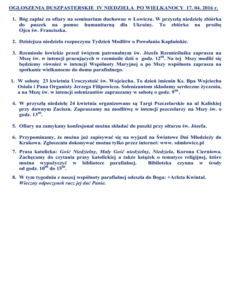 OGŁOSZENIA DUSZPASTERSKIE IV NIEDZIELA PO WIELKANOCY 17. 04. 2016 r. 1. Bóg zapłać za ofiary na seminarium duchowne w Łowiczu. W przyszłą niedzielę zbiórka do puszek na pomoc humanitarną dla Ukrainy. To zbiórka na prośbę Ojca św. Franciszka. 2. Dzisiejsza niedziela rozpoczyna Tydzień Modlitw o Powołania Kapłańskie. 3. Rzemiosło łowickie przed świętem patronalnym św. Józefa Rzemieślnika zaprasza na Mszę św. w intencji pracujących w rzemiośle dziś o godz. 1200. Na tej Mszy modlić się będziemy również w intencji Wspólnoty Maryjnej a po Mszy wspólnota zaprasza na spotkanie wielkanocne do domu parafialnego. 1. W sobotę 23 kwietnia Uroczystość św. Wojciecha. To dzień imienin Ks. Bpa Wojciecha Osiala i Pana Organisty Jerzego Filipowicza. Solenizantom składamy serdeczne życzenia, a na Mszę św. w intencji solenizantów zapraszamy w sobotę o godz. 900.. 4. W przyszłą niedzielę 24 kwietnia organizowane są Targi Pszczelarskie na ul Kaliskiej przy dawnym Zaciszu. Zapraszamy na modlitwę w intencji pszczelarzy na Mszy św. o godz. 1300. 5. Ofiary na zamykany konfesjonał można składać do puszki przy ołtarzu św. Józefa. 6. Przypominamy, że można już zapisywać się na wyjazd na Światowe Dni Młodzieży do Krakowa. Zgłoszenia dokonywać można tylko przez internet: www. sdmlowicz.pl 7. Prasa katolicka: Gość Niedzielny, Mały Gość niedzielny, Niedziela, Korona Cierniowa. Zachęcamy do czytania prasy katolickiej a także książek o tematyce religijnej, które można wypożyczyć w bibliotece parafialnej. Biblioteka czynna w środy 00 00 od godz. 10 do 15 . 8. W tym tygodniu z naszej wspólnoty parafialnej odeszła do Boga: +Arleta Kwintal. Wieczny odpoczynek racz jej dać Panie.