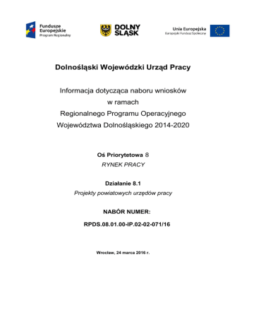 Dolnośląski Wojewódzki Urząd Pracy Informacja dotycząca naboru wniosków w ramach Regionalnego Programu Operacyjnego Województwa Dolnośląskiego 2014-2020 Oś Priorytetowa 8 RYNEK PRACY Działanie 8.1 Projekty powiatowych urzędów pracy NABÓR NUMER: RPDS.08.01.00-IP.02-02-071/16 Wrocław, 24 marca 2016 r. SPIS TREŚCI: .......................................................... BŁĄD! NIE ZDEFINIOWANO ZAKŁADKI. I. OGŁOSZENIE O NABORZE WNIOSKÓW O DOFINANSOWANIE: .............................. 3 II. WYKAZ SKRÓTÓW: ....................................................................................................... 5 III. PODSTAWA PRAWNA I DOKUMENTY PROGRAMOWE: ............................................ 6 IV. INFORMACJE OGÓLNE: .............................................................................................. 10 V. KWOTA ŚRODKÓW PRZEZNACZONA NA DOFINANSOWANIE PROJEKTÓW: ...................................................................................................................... 10 VI. WARUNKI REALIZACJI PROJEKTÓW AKTYWIZACJI ZAWODOWEJ WYNIKAJĄCE Z ZAPISÓW RPO WD 2014-2020: .............................................................. 10 VII. KRYTERIA DOSTĘPU DLA PROJEKTÓW POZAKONKURSOWYCH POWIATOWYCH URZĘDÓW PRACY: ................................................................................ 13 VIII. PROCEDURA SKŁADANIA WNIOSKU O DOFINANSOWANIE: ................................. 17 IX. PROCEDURA OCENY WNIOSKU O DOFINANSOWANIE: ......................................... 18 X. FORMA FINANSOWANIA PROJEKTU: ....................................................................... 21 XI. FORMA ROZLICZANIA PROJEKTU: ........................................................................... 22 XII. ZAŁĄCZNIKI: ................................................................................................................. 23 2 I. Ogłoszenie o naborze wniosków o dofinansowanie: Dolnośląski Wojewódzki Urząd Pracy ogłasza nabór wniosków o dofinansowanie w ramach Osi Priorytetowej 8 Rynek pracy Działanie 8.1 Projekty powiatowych urzędów pracy O dofinansowanie projektu mogą ubiegać się wyłącznie powiatowe urzędy pracy z terenu województwa dolnośląskiego. Miejsce i termin składania wniosków: Nabór wniosków będzie prowadzony w dniach: od 11 kwietnia 2016 r. do 22 kwietnia 2016 r. Wniosek o dofinansowanie projektu pozakonkursowego PUP składany jest: − w formie elektronicznej z wykorzystaniem formularza Excel stanowiącego załącznik nr 5 do niniejszego dokumentu oraz − w formie papierowej Wniosek w formie papierowej należy złożyć w jednym egzemplarzu osobiście: − w kancelarii Dolnośląskiego Wojewódzkiego Urzędu Pracy - Filia we Wrocławiu, przy Al. Armii Krajowej 54, od poniedziałku do piątku, w godzinach pracy urzędu, tj. 7.30 do 15.30. kurierem lub pocztą na adres: − Dolnośląski Wojewódzki Urząd Pracy - Filia we Wrocławiu, Al. Armii Krajowej 54, 50-541 Wrocław, w godzinach pracy urzędu, tj. od 7.30 do 15.30. Decyduje data wpływu wniosku do instytucji organizującej nabór. 3 Wersję elektroniczną wniosku należy zapisać na nośniku elektronicznym (wyłącznie na płycie CD lub DVD) w formacie PDF oraz Excel. Opis płyty CD/DVD powinien zawierać: - nazwę Wnioskodawcy (tj. Powiat X – Powiatowy Urząd Pracy w X) - tytuł projektu. WERSJA PAPIEROWA WNIOSKU MUSI BYĆ ZGODNA Z JEGO WERSJĄ ELEKTRONICZNĄ. Wniosek w formie papierowej należy złożyć w zamkniętej (zaklejonej) kopercie i opisać w sposób umożliwiający identyfikację projektu realizowanego w ramach Działania 8.1 RPO WD 2014 - 2020 wg poniższego wzoru: Nazwa i adres Wnioskodawcy Dolnośląski Wojewódzki Urząd Pracy Filia we Wrocławiu Al. Armii Krajowej 54 50-541 Wrocław Wniosek o dofinansowanie realizacji projektu: …wpisać tytuł projektu w ramach Działania 8.1 RPO WD 2014-2020 „Projekty powiatowych urzędów pracy”. Dodatkowe informacje dotyczące wypełniania wniosku o dofinansowanie realizacji projektu można uzyskać w DWUP – Filia we Wrocławiu Al. Armii Krajowej 54 , 50-541 Wrocław tel. 71 39 74 260 4 II. Wykaz skrótów: EFS – Europejski Fundusz Społeczny FP – Fundusz Pracy RPO WD – Regionalny Program Operacyjny Województwa Dolnośląskiego 2014-2020 IZ RPO WD – Instytucja Zarządzająca Regionalnym Programem Operacyjnym Województwa Dolnośląskiego 2014-2020, tj. Zarząd Województwa Dolnośląskiego IP – Instytucja Pośrednicząca Regionalnego Programu Operacyjnego Województwa Dolnośląskiego 2014-2020, której rolę pełni Dolnośląski Wojewódzki Urząd Pracy SZOOP – Szczegółowy Opis Osi Priorytetowych Regionalnego Programu Wojewódzkiego Województwa Dolnośląskiego 2014-2020 DWUP – Dolnośląski Wojewódzki Urząd Pracy PUP – powiatowy urząd pracy OBSZAR WIEJSKI – zgodnie z załącznikiem nr 1 do Rozporządzenia Wykonawczego Komisji (UE) NR 215/2014 z dnia 7 marca 2014 r. to obszar o małej gęstości zaludnienia (kod 03) – zgodnie ze stopniem urbanizacji ujętym w klasyfikacji DEGURBA obszary słabo zaludnione to obszary, na których więcej niż 50% populacji zamieszkuje tereny wiejskie (tj. gminy, które zostały przyporządkowane do kategorii 3 klasyfikacji DEGURBA). Zestawienie gmin zamieszczone jest na stronie internetowej EUROSTAT. W województwie dolnośląskim jako obszary wiejskie zostały wskazane gminy: Bolesławiec (gmina wiejska), Gromadka, Nowogrodziec, Osiecznica, Warta Bolesławiecka, Bolków, Męcinka, Mściwojów, Paszowice, Wądroże Wielkie, Janowice Wielkie, Jeżów Sudecki, Mysłakowice, Podgórzyn, Stara Kamienica, Kamienna Góra (gmina wiejska), Lubawka, Marciszów, Leśna, Lubań (gmina wiejska), Platerówka, Siekierczyn, Lubomierz, Lwówek Śląski, Mirsk, Wleń, Zawidów, Bogatynia, Sulików, Węgliniec, Zgorzelec (gmina wiejska), Wojcieszów, Pielgrzymka, Świerzawa, Zagrodno, Złotoryja (gmina wiejska), Jerzmanowa, Kotla, Pęcław, Żuko