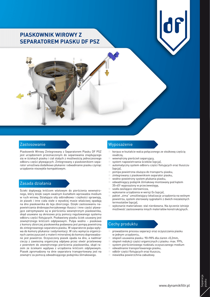 PIASKOWNIK WIROWY Z SEPARATOREM PIASKU DF PSZ Zastosowanie Wyposażenie Piaskownik Wirowy Zintegrowany z Separatorem Piasku DF PSZ jest urządzeniem przeznaczonym do separowania znajdującego się w ściekach piasku i ciał stałych z możliwością jednoczesnego odbioru części pływających. Zintegrowany z piaskownikiem separator umożliwia dodatkowo płukanie i odwadnianie piasku czyniąc urządzenie niezwykle kompaktowym. korpus w kształcie walca połączonego ze stożkową częścią osadczą, wewnętrzny pierścień separujący, system napowietrzania ścieków (opcja), automatyczny system odbioru części flotujących oraz tłuszczu (opcja), pompa powietrzna służąca do transportu piasku, zintegrowany z piaskownikiem separator piasku, wodno-powietrzny system płukania piasku, odwadniający podajnik ślimakowy montowany pod kątem 35÷45o wyposażony w przeciwwstęgę, szafa zasilająco-sterownicza, wykonanie urządzenia w wersji Ex (opcja), pakiet „zima” umożliwiający lokalizację urządzenia na wolnym powietrzu, system sterowany sygnałami z dwóch niezależnych termostatów (opcja), wykonanie materiałowe: stal nierdzewna. Na życzenie istnieje możliwość zastosowania innych materiałów konstrukcyjnych. Ścieki dopływają króćcem wlotowym do pierścienia wewnętrznego, który dzięki swym owalnym kształtom wprowadza medium w ruch wirowy. Działające siły odśrodkowa i ciężkości sprawiają, że piasek i inne ciała stałe o wysokiej masie właściwej opadają na dno piaskownika do leja zbiorczego. Dzięki zastosowaniu napowietrzania drobnopęcherzykowego tłuszcz i inne części pływające zatrzymywane są w pierścieniu wewnętrznym piaskownika, skąd usuwane są okresowo przy pomocy regulowanego systemu odbioru części flotujących. Pozbawiony piasku ściek usuwany jest zewnętrznego króćcem odpływowym. Pulpa wodno – piaskowa z komory zbiorczej piaskownika podawana jest pompą powietrzną do zintegrowanego separatora piasku. W separatorze pulpa wpływa do komory płukania i sedymentacji. W celu wymycia organicznych zanieczyszczeń z materii mineralnej do komory doprowadzone jest powietrze. Oczyszczony piasek opada na dno, a nadmiar cieczy z zawiesiną organiczną odpływa przez otwór przelewowy z powrotem do zewnętrznego pierścienia piaskownika, skąd razem ze ściekami wypływa z urządzenia króćcem odpływowym. Piasek zgromadzony na dnie separatora transportowany jest na zewnątrz za pomocą odwadniającego podajnika ślimakowego. Cechy produktu prowadzenie procesu separacji oraz oczyszczania piasku w jednym urządzeniu, stopień usuwania piasku: 90÷98% dla ziaren >0,2mm, stopień redukcji części organicznych z piasku: max. 99%, system pierścieniowego rozdziału oczyszczanego medium odwadnianie transportowanego piasku, odbiór części flotujących oraz tłuszczu, niewielka powierzchnia zabudowy. www.dynamikfiltr.pl Separacja piasku Zasada działania Rysunek techniczny Specyfikacja Typ Wydajność [m3/h] DF PSZ 60 DF PSZ 120 DF PSZ 160 DF PSZ 200 DF PSZ 300 DF PSZ 400 60 120 160 200 300 400 D H H1 H2 H3 L [mm] [mm] [mm] [mm] [mm] [mm] 1300 1800 2200 2500 3000 3500 2500 3000 3700 4100 4500 4900 1500 1950 2600 2850 3250 3750 1450 1900 2550 2800 3200 3700 950 1400 2050 2300 2700 3200 3300 3800 4300 4600 5100 5600 Dopływ DN 150 200 250 300 350 400 Króćce przyłączeniowe Spust Odbiór części Odpływ awaryjny pływających DN DN DN 200 40 50 250 40 65 300 40 350 50 400 50 80 450 50 Masa [kg] Moc napędu [kW] 350 600 900 1200 1500 1800 0,25 0,25 0,25 0,25 0,37 0,37 Zestawione w tabeli wymiary dotyczą urządzeń wyposażonych w podajnik ślimakowy montowanym pod kątem 35o, Istnieje możliwość indywidualnego dostosowania urządzeń do wymagań Inwestora, Na życzenie udostępniane są rysunki gabarytowe urządzeń wykonane w programie AutoCAD. Rysunki szczegółowe www.dynamikfiltr.pl