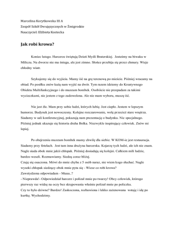 Marcelina Korytkowska III A Zespół Szkół Dwujęzycznych w Żmigrodzie Nauczyciel: Elżbieta Kostecka Jak robi krowa? Koniec lutego. Harcerze świętują Dzień Myśli Braterskiej. Jesteśmy na biwaku w Miliczu. Na dworze nie ma śniegu, ale jest zimno. Słońce przebija się przez chmury. Wieje chłodny wiatr. Szykujemy się do wyjścia. Mamy iść na grę terenową po mieście. Później wracamy na obiad. Po posiłku znów każą nam wyjść na dwór. Tym razem idziemy do Kreatywnego Obiektu Multifunkcyjnego i do muzeum bombek. Osobiście nie przepadam za takimi wycieczkami, nie jestem z tego zadowolona. Ale nie mam wyboru, muszę iść. Nie jest źle. Mam przy sobie ludzi, których lubię. Jest ciepło. Jestem w lepszym humorze. Budynek jest nowoczesny. Kolejne rozczarowanie, wolę przecież stare wnętrza. Siadamy w sali konferencyjnej, pokazują nam prezentację o budynku. Nic specjalnego. Później jednak ukazuje się historia druha Bolka. Niezwykle inspirujący człowiek. Znów mi lepiej. Po obejrzeniu muzeum bombek mamy chwilę dla siebie. W KOM-ie jest restauracja. Siadamy przy fotelach. Jest tam inna drużyna harcerska. Kojarzę tych ludzi, ale ich nie znam. Nagle siada obok mnie jakiś chłopak. Później dosiadają się kolejni. Całkiem mili ludzie, bardzo weseli. Rozmawiamy. Siedzą coraz bliżej. Czuję się osaczona. Mówi do mnie chyba z 5 osób naraz, nie wiem kogo słuchać. Nagle wysoki chłopak siedzący obok mnie pyta się - Wiesz co robi krowa? Zawstydzona odpowiadam - Muuu..? - Nieprawda!- Odpowiedział harcerz i polizał mnie po twarzy! Obcy człowiek, którego pierwszy raz widzę na oczy bez skrępowania właśnie polizał mnie po policzku. Czy to było dziwne? Bardzo! Zaskoczona, rozbawiona i lekko zażenowana wstaję i idę po kurtkę. Wychodzimy. Gdy tylko to sobie przypomnę, robi mi się weselej. Aczkolwiek nadal wydaje mi się to dziwne. Jednak to najbardziej lubię w harcerstwie. Harcerstwo jest inne od rzeczy, które znam. Będąc na biwaku zawsze może wydarzyć się coś niespodziewanego. Nigdzie indziej nie zbuduję sobie łóżka z drewna w lesie. Z nikim innym oprócz harcerzy nie zanurzę się w rzece w połowie października. Nic innego nie da mi możliwości ugotowania kisielu o północy w lesie z soku i mąki ziemniaczanej nad ogniskiem. I dlatego tak bardzo kocham harcerstwo i bardzo się cieszę, że dawno temu odważyłam się przyjść na zbiórkę.