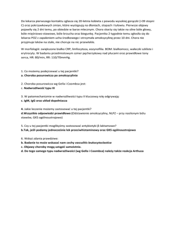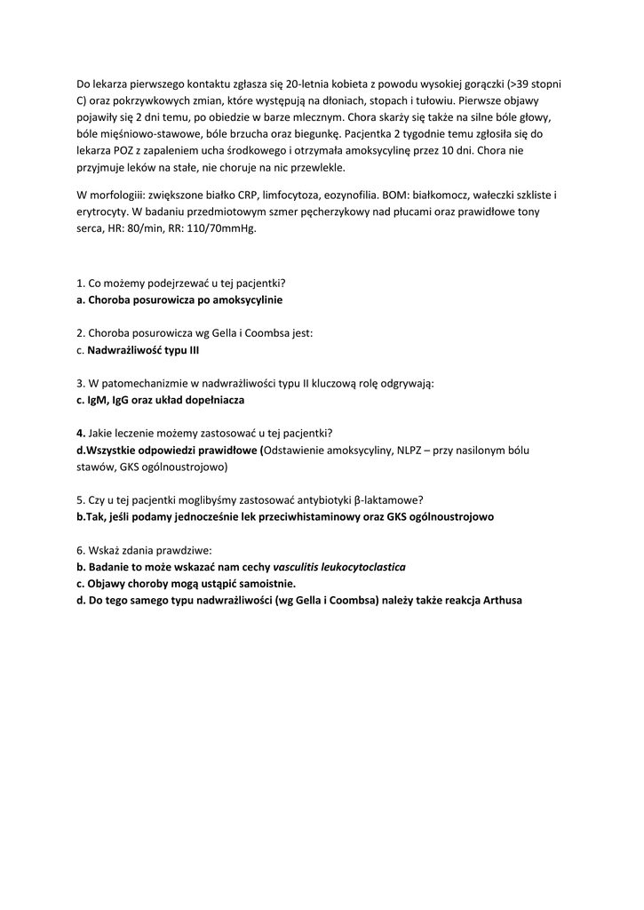 Do lekarza pierwszego kontaktu zgłasza się 20-letnia kobieta z powodu wysokiej gorączki (>39 stopni C) oraz pokrzywkowych zmian, które występują na dłoniach, stopach i tułowiu. Pierwsze objawy pojawiły się 2 dni temu, po obiedzie w barze mlecznym. Chora skarży się także na silne bóle głowy, bóle mięśniowo-stawowe, bóle brzucha oraz biegunkę. Pacjentka 2 tygodnie temu zgłosiła się do lekarza POZ z zapaleniem ucha środkowego i otrzymała amoksycylinę przez 10 dni. Chora nie przyjmuje leków na stałe, nie choruje na nic przewlekle. W morfologiii: zwiększone białko CRP, limfocytoza, eozynofilia. BOM: białkomocz, wałeczki szkliste i erytrocyty. W badaniu przedmiotowym szmer pęcherzykowy nad płucami oraz prawidłowe tony serca, HR: 80/min, RR: 110/70mmHg. 1. Co możemy podejrzewać u tej pacjentki? a. Choroba posurowicza po amoksycylinie 2. Choroba posurowicza wg Gella i Coombsa jest: c. Nadwrażliwość typu III 3. W patomechanizmie w nadwrażliwości typu II kluczową rolę odgrywają: c. IgM, IgG oraz układ dopełniacza 4. Jakie leczenie możemy zastosować u tej pacjentki? d.Wszystkie odpowiedzi prawidłowe (Odstawienie amoksycyliny, NLPZ – przy nasilonym bólu stawów, GKS ogólnoustrojowo) 5. Czy u tej pacjentki moglibyśmy zastosować antybiotyki β-laktamowe? b.Tak, jeśli podamy jednocześnie lek przeciwhistaminowy oraz GKS ogólnoustrojowo 6. Wskaż zdania prawdziwe: b. Badanie to może wskazać nam cechy vasculitis leukocytoclastica c. Objawy choroby mogą ustąpić samoistnie. d. Do tego samego typu nadwrażliwości (wg Gella i Coombsa) należy także reakcja Arthusa