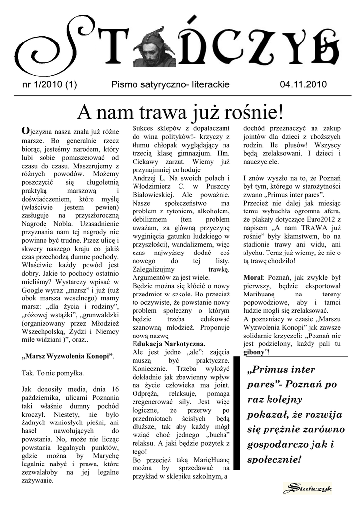 A nam trawa juŜ rośnie! Ojczyzna nasza znała juŜ róŜne marsze. Bo generalnie rzecz biorąc, jesteśmy narodem, który lubi sobie pomaszerować od czasu do czasu. Maszerujemy z róŜnych powodów. MoŜemy poszczycić się długoletnią praktyką marszową i doświadczeniem, które myślę (właściwie jestem pewien) zasługuje na przyszłoroczną Nagrodę Nobla. Uzasadnienie przyznania nam tej nagrody nie powinno być trudne. Przez ulicę i skwery naszego kraju co jakiś czas przechodzą dumne pochody. Właściwie kaŜdy powód jest dobry. Jakie to pochody ostatnio mieliśmy? Wystarczy wpisać w Google wyraz „marsz” i juŜ (tuŜ obok marsza weselnego) mamy marsz: „dla Ŝycia i rodziny”, „róŜowej wstąŜki”, „grunwaldzki (organizowany przez MłodzieŜ Wszechpolską, śydzi i Niemcy mile widziani )”, oraz... „Marsz Wyzwolenia Konopi”. Tak. To nie pomyłka. Jak donosiły media, dnia 16 października, ulicami Poznania taki właśnie dumny pochód kroczył. Niestety, nie było Ŝadnych wzniosłych pieśni, ani haseł nawołujących do powstania. No, moŜe nie licząc powstania legalnych punktów, gdzie moŜna by Marychę legalnie nabyć i prawa, które zezwalałoby na jej legalne zaŜywanie. Sukces sklepów z dopalaczami do wina polityków!- krzyczy z tłumu chłopak wyglądający na trzecią klasę gimnazjum. Hm. Ciekawy zarzut. Wiemy juŜ przynajmniej co hoduje Andrzej L. Na swoich polach i Włodzimierz C. w Puszczy Białowieskiej. Ale powaŜnie. ma Nasze społeczeństwo problem z tytoniem, alkoholem, debilizmem (ten problem uwaŜam, za główną przyczynę wyginięcia gatunku ludzkiego w przyszłości), wandalizmem, więc czas najwyŜszy dodać coś nowego do tej listy. Zalegalizujmy trawkę. Argumentów za jest wiele. Będzie moŜna się kłócić o nowy przedmiot w szkole. Bo przecieŜ to oczywiste, Ŝe powstanie nowy problem społeczny o którym będzie trzeba edukować szanowną młodzieŜ. Proponuje nową nazwę Edukacja Narkotyczna. Ale jest jedno „ale”: zajęcia muszą być praktyczne. Koniecznie. Trzeba wyłoŜyć dokładnie jak zbawienny wpływ na Ŝycie człowieka ma joint. OdpręŜa, relaksuje, pomaga zregenerować siły. Jest więc logiczne, Ŝe przerwy po przedmiotach ścisłych będą dłuŜsze, tak aby kaŜdy mógł wziąć choć jednego „bucha” relaksu. A jaki będzie poŜytek z tego! Bo przecieŜ taką MarięHuanę moŜna by sprzedawać na przykład w sklepiku szkolnym, a dochód przeznaczyć na zakup jointów dla dzieci z uboŜszych rodzin. Ile plusów! Wszyscy będą zrelaksowani. I dzieci i nauczyciele. I znów wyszło na to, Ŝe Poznań był tym, którego w staroŜytności zwano „Primus inter pares”. PrzecieŜ nie dalej jak miesiąc temu wybuchła ogromna afera, Ŝe plakaty dotyczące Euro2012 z napisem „A nam TRAWA juŜ rośnie” były kłamstwem, bo na stadionie trawy ani widu, ani słychu. Teraz juŜ wiemy, Ŝe nie o tą trawę chodziło! Morał: Poznań, jak zwykle był pierwszy, będzie eksportował Marihuanę na tereny popowodziowe, aby i tamci ludzie mogli się zrelaksować. A poznaniacy w czasie „Marszu Wyzwolenia Konopi” jak zawsze solidarnie krzyczeli: „Poznań nie jest podzielony, kaŜdy pali tu gibony”! „Primus inter pares”- Poznań po raz kolejny pokazał, Ŝe rozwija się pręŜnie zarówno gospodarczo jak i społecznie! Nr 1/2010 (1) 04.11.2010 GÓRAL śYWEMU NIE PRZEPUŚCI Łowiecki na halach becą, ze łoscypki bace za wincyj piniązków spsydajum. Powód jest ino jedyn: Colin Farell. Pipol Magazin donosi, ze pieron jeden nasom, polską Alicję Bachledę– Curuś zostowił. Tymu tyz łoscypki drozyją, bo bace cioupagi łostzą i bileta na samoloty kupują. Tsa psecie chopowi wyłoŜyć, Ŝe pierwszej lepszej dziouchy nie wziuł i ze z goralami się nie zadziero! CóŜ Colinowi pozostaje? Chyba tylko kupić sobie Farelkę, zaszyć się na Antarktydzie i prowadzić Ŝycie pustelnika, próbując się wstrzymać od gwałtów na pingwinach! No, ale... Albo się kalkuluje na zimno, albo się jest zimnym, jak mawiają stare bace. WĄś W KIESZENI Wszyscy, którzy 16 października udali się na koncert do klubu Eskulap pocałowali klamkę. Powód jest jeden i to bardzo prosty: najemca lokalu zbankrutował i mając drobny dług w postaci 1 miliona złotych postanowił ogłosić upadłość. Okazało się więc, Ŝe ma węŜa w kieszeni, być moŜe eskulapa właśnie. Wiele osób usłyszawszy tę tragiczną wiadomość wpadło stany depresyjne: emo postanowiły ubrać Ŝałobną czerń, słuchający metalu udali się do praktikera, aby nabyć tam zestaw gwoździ i narzędzia metalowe, a cała reszta po prostu poszła do domu. Ale co to za dom bez Eskulapa? „Ty sobie lepiej kup mózg!” Nadciąga czas prawdziwego równouprawnienia. Zaczynają się dziać rzeczy niemoŜliwe i niepojęte. To ogromny przełom dla blondynek, księgowych, ludzi ze skąpą wyobraźnią, czy teŜ głupków po prosu! I ty moŜesz mieć mózg! CzyŜ to nie brzmi wspaniale? Własny mózg. Mówi się, Ŝe Niemcy z natury rzeczy nie zrobią nic dobrego dla Polaków, a tu ogromne zaskoczenie! Znany niemiecki anatom doktor Gunther von Hagens daje nam, równieŜ Tobie (!) szanse kupienia sobie mózgu! Wyobraźmy sobie, jak ogromne i nieznane dotąd obszary świata moŜemy zdobywać mając własny mózg z fabryki doktora Hagensa. I to za jedyne 4 tysiące Euro. Ale to nie koniec naszej rewelacyjnej oferty! MoŜesz równieŜ kupić sobie tors (57 tysięcy euro), głowę (15 tysięcy Euro, do wyboru przekrojowe plastry lub w całości). Owszem moŜe i części te są uŜywane i poddane zabiegowi plastynacji, moŜe i są drogie, ale wyobraź sobie (zamknij oczy dla lepszego efektu) jak spacerujesz ulicami Poznania (zamknij oczy!) z WŁASNYM mózgiem pod pachą (tak, wiem, Ŝe nie widzisz, ale to dlatego, Ŝe nie zamknąłeś oczu)! A przecieŜ to dopiero kilka z niezliczonych zalet takiej transakcji! Teraz bez problemu udowodnisz koledze, r