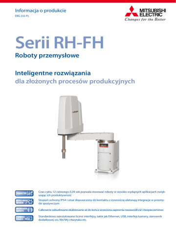 Informacja o produkcie EBG 232-PL Serii RH-FH Roboty przemysłowe Inteligentne rozwiązania dla złożonych procesów produkcyjnych Czas cyklu 12 calowego 0,29 sek pozwala stosować roboty w wysoko wydajnych aplikacjach zwiększając ich produktywność Stopień ochrony IP54 i smar dopuszczony do kontaktu z żywnością ułatwiają integracje w przemyśle spożywczym Całkowicie zabudowane okablowanie aż do końca wrzeciona zapewnia niezawodność i bezpieczeństwo Standardowo zainstalowane liczne interfejsy, takie jak Ethernet, USB, interfejs kamery, sterownik dodatkowej osi, We/Wy chwytaka etc. MELFA Serii RH-FH Większa wydajność i sprawność jej klasie. Pozwala to na skrócenie czasu trwania 12-calowego cyklu do jedynie 0,29 sek, a tym samym znaczne zwiększenie wydajności i poprawę charakterystyk pracy ciągłej. Radykalnie rozszerzony zakres ruchu zapew nia większą elastyczność i w ten sposób upraszcza projektowanie systemu. Efektywny dostęp do całego, niemal kolistego obszaru roboczego posiada wiele zalet: umożliwia redukcję czasów cyklu przez eliminację zbędnych ruchów i zwiększa liczbę zadań, jakie robot może wykonywać w obrębie przestrzeni roboczej. Łatwość integracji i stosowania Szybkość i łatwość integracji umożliwiają różnorodne zastosowania Przyszłościowy, fascynujący i elastyczny Roboty serii RH-F są obsługiwane przez kontrolery o dużej wydajności. W dziedzinie nowoczesnych systemów produkcyjnych firmy przywiązują coraz większe znaczenie do dużej szybkości produkcji i możliwości sprawnej integracji z istniejącymi systemami, a także do wyposażenia systemu w pełny zakres możliwych połączeń. Seria robotów Mitsubishi Electric RH-F spełnia te wymagania z łatwością, w sposób, który można określić jako skierowany ku przyszłości, elastyczny i fascynujący. Roboty SCARA Mitsubishi Electric są stosowane wszędzie tam, gdzie wymagana jest maksymalna precyzja. Innowacyjne roboty Mitsubishi Electric MELFA znane są z szerokiego zakresu możliwych zastosowań, od systemów szybkiej paletyzacji, poprzez dokładne sortowanie, aż po montaż elementów. Podejście to znajduje potwierdzenie również w serii RH-F. Roboty SCARA nadają się do wielu różnych zastosowań przemysłowych bezpośrednio po opuszczeniu fabryki i bez potrzeby zakupu dodatkowych modułów. Najszybsze w swojej klasie Dzięki nowym silnikom opracowanym przez Mitsubishi Electric, dużej sztywności ramienia i unikalnej technologii sterowania, roboty serii RH-F osiągają największą szybkość w swo- Nie ma znaczenia, czy Państwa system produkcyjny jest modernizowany, czy uruchamiany po raz pierwszy. Dostarczane wprost z fabryki roboty serii RH-F oferują wiele funkcji, które w porównywalnych produktach są dostępne jedynie jako opcjonalne dodatki. Przykładowo każdy model posiada złącza do chwytaków pneumatycznych, złącza sieci Ethernet, USB, funkcje śledzenia, interfejs kamery, We/Wy chwytaka, interfejs sterownika dodatkowej osi i interfejs terminali operatorskich HMI GOT, przy czym interfejsy mogą być dowolnie przez użytkownika programowane. Standardowo stosowanym smarem jest dopuszczony do kontaktu z żywnością smar klasy H1, doskonale nadający się dla zastosowań w przemyśle spożywczym i napojów. Dostępny jest także model przeznaczony do pracy w pomieszczeniach czystych poziomu III według ISO, do zastosowań w przemyśle farmaceutycznym i w mikroelektronice. Nawet podstawowy model RH-3FH jest równie dobrze wyposażony, a przy udźwigu 3 kg nadaje się do większości zastosowań. Jeżeli wymagane są większe obciążenia, można użyć najbardziej rozbudowanego modelu RH-6FH lub największego w tej rodzinie robotów RH-20FH, z maksymalnym udźwigiem 20 kg. Modele RH-6/12/20FH posiadają stopień ochrony IP54, wypróbowany w wielu zastosowaniach przemysłowych i chroniący robota przed pyłem i bryzgami cieczy. Do pracy w szczególnie zanieczyszczonym lub zapylonym środowisku można bez przeszkód rozbudować ten model i względnie niewielkim kosztem, zapewniając mu stopień ochrony IP65, co jest możliwe dzięki zastosowaniu koncepcji zamkniętej obudowy. MELFA Serii RH-FH Szeroki zakres zastosowań Sygnał wejściowy kodera GOT Komputer PC Enkoder inkrementalny Zwiększone bezpieczeństwo Jednostka cen tralna robota gdy stosowany jest system FQ Komunikacja przez port USB Ethernet System wizyjny Wersja podstawowa SSCNETIII (transmisja optyczna) Seria RH-F to wysokiej jakości roboty o solidnej konstrukcji i wyróżniającym się stosunku ceny do wydajności. Natychmiast po dostawie nadają się one do wielu różnych zastosowań przemysłowych i mogą być wykorzystywane w wielu gałęziach przemysłu. Przykłady obejmują takie branże, jak przemysł spożywczy i napojów, pakowanie, automatyzację laboratoriów, przemysł samochodowy i produkcję ogniw. Ponadto roboty serii MELFA RH-F mogą być z łatwością i niewielkim kosztem dostosowane do większości występujących w przemyśle wymagań i sytuacji. MR-J3-BSafety/ MR-J4-B Instalacja użytkownika Robot RH-3FH/ RH-6FH/ RH-12FH/ RH-20FH Wersja dotykowa Dodatkowy panel programujący i sterujący Standardowe interfejsy do sterowania robotami Gdy kilka robotów jest wykorzystywanych w tym samym gnieździe roboczym, połączenie pomiędzy jednostkami centralnymi ich sterowników zapewnia, że poszczególne roboty są sterowane w sposób wzajemnie skoordynowany. Zaawansowane programowanie Kolejną zaletą tych robotów jest szybkość i prostota uruchamiania za pomocą komputera PC. Modele serii RH-F mogą być szybko i w prosty sposób programowane przy użyciu dostarczanego wraz z nimi oprogramowanie RT ToolBox2. Mogą one pracować indywidualnie w taki sam prosty sposób, jak podczas normalnej pracy. W trybie bezpośrednim lub automatycznym funkcja unikania kolizji zapewnia zatrzymanie robotów zanim doszłoby do ich kolizji, co zapobiega ich uszkodzeniu. P