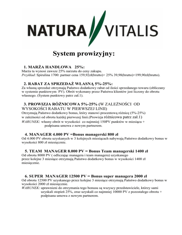 System prowizyjny: 1. MARśA HANDLOWA 25%: MarŜa ta wynosi zawsze 25% narzutu do ceny zakupu. Przykład: Spirulina 1700: partner cena 159,92zł(brutto)+ 25% 39,98(brutto)=199,90zl(brutto). 2. RABAT ZA SPRZEDAś WŁASNĄ 5%-25%: Za własną sprzedaŜ otrzymają Państwo dodatkowy rabat od ilości sprzedanego towaru (obliczany w systemie punktowym PV). Obrót wykonany przez Państwa klientów jest liczony do obrotu własnego. (System punktowy patrz zał.1). 3. PROWIZJA RÓśNICOWA 5%-25% (W ZALEśNOŚCI OD WYSOKOŚCI RABATU W PIERWSZEJ LINII) Otrzymują Państwo dodatkowy bonus, który stanowi procentową róŜnicę (5%-25%) w zaleŜności od obrotu kaŜdej pierwszej linii.(Prowizja róŜnicowa patrz zał.1) WARUNEK: własny obrót w wysokości co najmniej 150PV punktów w miesiącu + podpisana umowa z nowym partnerem. 4. MANAGER 4.000 PV =Bonus managerski 800 zł Od 4.000 PV obrotu uzyskanych w 3 kolejnych miesiącach nabywają Państwo dodatkowy bonus w wysokości 800 zł miesięcznie. 5. TEAM MANAGER 8.000 PV = Bonus Team managerski 1400 zł Od obrotu 8000 PV ( odliczając managera i team managera) uzyskanego przez kolejne 3 miesiące otrzymają Państwo dodatkowy bonus w wysokości 1400 zł miesięcznie. 6. SUPER MANAGER 12500 PV = Bonus super managera 2000 zł Od obrotu 12500 PV uzyskanego przez kolejne 3 miesiące otrzymają Państwo dodatkowy bonus w wysokości 2000 zł miesięcznie. WARUNEK: uprawnieni do otrzymania tego bonusu są wszyscy przedstawiciele, którzy sami uzyskali stopień 25%, oraz uzyskali co najmniej 10000 PV z pozostałego obrotu + podpisana umowa z nowym partnerem. 7. SPECJALNY BONUS 10%-12,5%: Liczba Państwa 25% -wych linii decyduje o wys. Bonusa specjalnego. Jest liczony od wszystkich linii, które nie są jeszcze objęte bonusem (patrz zał.2) WARUNEK: uprawnieni do otrzymania tego bonusu są wszyscy przedstawiciele, którzy obok swoich 25% linii sami uzyskali co najmniej 4000 PV z pozostałego obrotu + podpisana umowa z nowym partnerem. 8. VICE DYREKTOR BONUS 3200 zł: Mając 3 Super managerów (25%), zakwalifikowanych trzy miesiące z rzędu otrzymujecie Państwo dodatkowo bonus w wysokości 3200 zł miesięcznie. (patrz zał. 2) WARUNEK: uprawnieni do otrzymania tego bonusu są wszyscy przedstawiciele, którzy obok swoich 25% linii sami uzyskali co najmniej 10000 PV z pozostałego obrotu + podpisana umowa z nowym partnerem 9. BONUS DYREKTORA Mając 5 Super managerów (25%), zakwalifikowanych trzy miesiące z rzędu otrzymujecie Państwo dodatkowo 3200 zł miesięcznie. (patrz zał. 2) WARUNEK: uprawnieni do otrzymania tego bonusu są wszyscy przedstawiciele, którzy obok swoich 25% linii sami uzyskali co najmniej 10000 PV z pozostałego obrotu + podpisana umowa z nowym partnerem 10. BONUS ZA GŁEBOKOŚĆ STRUKTURY I 2% Od trzech 25% linii 2% obrotu licząc bezpośrednio w dół do kolejnego partnera. 11. BONUS ZA GŁĘBOKOŚĆ STRUKTURY II 1% Jest liczony dodatkowo od 5 bezpośrednich 25% linii przedstawiciela. Zakres jak w bonusie I. 12. BONUS ROCZNY 1%-2,5% od obrotu: 500.000 1000.000 1500.000 2000.000 PV PV PV PV 1% 1,5% 2% 2,5% WARUNEK: odnosi się do całorocznego obrotu. W zaleŜności od obrotu obliczany procentowo. ZAŁĄCZNIK 1) Obrót miesięczny od 250 PV 500 PV 750 PV 1000 PV 2000 PV 4000 PV 6000 PV 8000 PV 10000 PV 12500 PV Rabat / Prowizja róŜnicowa 5% 8% 10% 13% 16% 18% Manager 20% 22% Team manager 24% 25% Super manager Do ustalenia poziomu rabatu / prowizji róŜnicowej jest zliczany całkowity obrót kaŜdego przedstawiciela w kaŜdym miesiącu. KaŜdy przedstawiciel uzyskuje swój rabat / prowizje róŜnicową w zaleŜności od wypracowanego poziomu, po odliczeniu juŜ uzyskanej prowizji. PV punkty - do kaŜdego produktu Natura Vitalis są przyporządkowane tzw. PV punkty - na podstawie PV punktów otrzymują państwo odpowiednią wysokość rabatu - im więcej PV punktów uzyskają Państwo w ciągu miesiąca tym wyŜszy stopień prowizji róŜnicowej - punkty są sumowane zawsze w jednym miesiącu - punkty przeliczane są na podstawie ceny zakupu partnera (netto) - 1 PV punkt odpowiada ok. 4 zł UV punkty - kaŜdemu produktowi jest poza tym przyporządkowany (UV) obrotu - od wielkość obrotu wypłacany jest Państwa rabat / prowizja róŜnicowa - wielkość obrotu sumowana jest kaŜdego miesiąca - wielkość obrotu przelicza się na podst. ceny zakupu partnera (netto) rabatu / ZAŁĄCZNIK 2) 1. SPECJALNY BONUS Liczba Państwa 25% linii: 1 2 3 4 5 Wysokość bonusa: 10% 10% 11% 11% 12,5% Uwaga: Aby otrzymać bonus wymagany jest dodatkowy obrót min. 4000 PV punktów. 2. SUPER MANAGER, VICE DYREKTOR I DYREKTOR BONUS Liczba Państwa 25% linii: 0 1 2 3 4 5 Wysokość bonusa: 500E (wypracowany samemu) 500E 500E 800E 800E 1200€ Uwaga: Aby otrzymać Super Manager, Vice Dyrektor i Dyrektor Bonus wymagany jest dodatkowy obrót min. 10000 PV punktów.