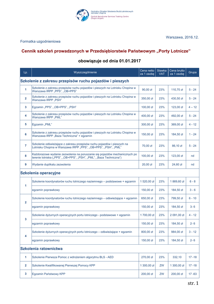 Warszawa, 2016.12. Formatka uzgodnieniowa Cennik szkoleń prowadzonych w Przedsiębiorstwie Państwowym „Porty Lotnicze” obowiązuje od dnia 01.01.2017 Lp. Wyszczególnienie Cena netto Stawka za 1 osobę VAT Cena brutto za 1 osobę Grupa Szkolenie z zakresu przepisów ruchu pojazdów i pieszych 1 Szkolenie z zakresu przepisów ruchu pojazdów i pieszych na Lotnisku Chopina w Warszawa IRPP „PPS”, „OB+PPS” 90,00 zł 23% 110,70 zł 5 - 24 2 Szkolenie z zakresu przepisów ruchu pojazdów i pieszych na Lotnisku Chopina w Warszawa IRPP „PSH” 350,00 zł 23% 430,50 zł 5 - 24 3 Egzamin „PPS”, „OB+PPS”, „PSH” 100,00 zł 23% 123,00 zł 4 – 12 4 Szkolenie z zakresu przepisów ruchu pojazdów i pieszych na Lotnisku Chopina w Warszawa IRPP „PML” 400,00 zł 23% 492,00 zł 5 - 24 5 Egzamin „PML” 300,00 zł 23% 369,00 zł 4 - 12 6 Szkolenie z zakresu przepisów ruchu pojazdów i pieszych na Lotnisku Chopina w Warszawa IRPP „Baza Techniczna” + egzamin 150,00 zł 23% 184,50 zł 1 - 24 7 Szkolenie odświeżające z zakresu przepisów ruchu pojazdów i pieszych na Lotnisku Chopina w Warszawa IRPP „PPS”, „OB+PPS”, „PSH”, „PML” 70,00 zł 23% 86,10 zł 5 - 24 8 Każdorazowe wydanie zezwolenia na poruszanie się pojazdów mechanicznych po terenie lotniska („PPS”, „OB+PPS”, „PSH”, „PML”, „Baza Techniczna”) 100,00 zł 23% 123,00 zł nd 9 Wydanie duplikatu zezwolenia 20,00 zł 23% 24,60 zł nd 1 520,00 zł 23% 1 869,60 zł 6-8 egzamin poprawkowy 150,00 zł 23% 184,50 zł 3-6 Szkolenie koordynatorów ruchu lotniczego naziemnego – odświeżające + egzamin 650,00 zł 23% 799,50 zł 6 - 10 egzamin poprawkowy 150,00 zł 23% 184,50 zł 3- 6 1 700,00 zł 23% 2 091,00 zł 4 - 12 egzamin poprawkowy 150,00 zł 23% 184,50 zł 2- 6 Szkolenie dyżurnych operacyjnych portu lotniczego – odświeżające + egzamin 800,00 zł 23% 984,00 zł 3 - 12 egzamin poprawkowy 150,00 zł 23% 184,50 zł 2- 6 270,00 zł 23% 332,10 17 -18 1 300,00 zł ZW 1 300,00 zł 17 -18 200,00 zł ZW 200,00 zł 17 -63 Szkolenia operacyjne Szkolenie koordynatorów ruchu lotniczego naziemnego – podstawowe + egzamin 1 2 Szkolenie dyżurnych operacyjnych portu lotniczego - podstawowe + egzamin 3 4 Szkolenia ratownictwa 1 Szkolenie Pierwsza Pomoc z wdrożeniem algorytmu BLS - AED 2 Szkolenie Kwalifikowanej Pierwszej Pomocy KPP 3 Egzamin Państwowy KPP str. 1 4 Szkolenie z zakresie posługiwania się podręcznym sprzętem gaśniczym na pokładzie statku powietrznego 120,00 zł 23% 147,60 zł 6-18 Szkolenia lotniskowe 1 Szkolenie w zakresie walidacji danych 650,00 zł 23% 799,50 zł 4-6 2 Szkolenie w zakresie utrzymania zimowego nawierzchni lotniskowych 700,00 zł 23% 861,00 zł 6-8 3 Szkolenie w zakresie elektroenergetyki portu lotniczego 300,00 zł 23% 369,00 zł 6-8 4 Szkolenie w zakresie konstrukcji, obsługi warsztatowej sprzętu mechanicznego do utrzymania nawierzchni lotniskowych 1 700,00 zł 23% 2 091,00 zł 6-8 5 Szkolenie w zakresie eksploatacji i konserwacji wzrokowych pomocy nawigacyjnych dla służb oświetlenia lotniczego 1 200,00 zł 23% 1 476,00 zł 6-8 6 Szkolenie z obsługi urządzeń do zasilania statków powietrznych w energię elektryczną 115 V/200 V 400 Hz lub 28 V DC 100,00 zł 23% 123,00 zł 4 - 10 7 Szkolenie Instruktorów GPU (cena obejmuje udział do 5 osób w grupie) 3 500,00 zł 23% 4 305,00 zł do 5 8 Szkolenie Instruktorów GPU (za każdą osobę w grupie powyżej 5 osób) 700,00 zł 23% 861,00 zł 6-10 9 Wystawienie certyfikatu dla osoby przeszkolonej przez Instruktora GPU (potwierdzenie ukończenia szkolenia i nabycia uprawnień do obsługi urządzeń GPU) 25,00 zł 23% 30,75 zł nd 1 500,00 zł 23% 1 845,00 zł 6-15 800,00 zł 23% 984,00 zł 6-15 1 200,00 zł 23% 1 476,00 zł 6-15 Szkolenia psychologiczne 1 Psychologiczne aspekty sytuacji kryzysowych 2 Radzenie sobie ze stresem chronicznym i ekstremalnym przez pracowników służb lotniskowych Szkolenia z profesjonalnej obsługi klienta i pasażera 1 Profesjonalna obsługa klienta, pasażera Szkolenia z technik interwencji 1 Szkolenie strzeleckie 1 100,00 zł 23% 1 353,00 zł 6 - 12 2 Techniki interwencji i samoobrony 1 200,00 zł 23% 1 476,00 zł 6 - 12 Szkolenia BHP 1 Szkolenie w dziedzinie BHP pracowników administracyjno-biurowych 110,00 zł ZW 110,00 zł 8-16 2 Szkolenie w dziedzinie BHP pracowników na stanowiskach robotniczych 110,00 zł ZW 110,00 zł 8-16 3 Szkolenie w dziedzinie BHP osób kierujących pracownikami 210,00 zł ZW 210,00 zł 8-16 Szkolenia Ochrony Lotnictwa Cywilnego 1 Szkolenie osób innych niż pasażerowie wymagających dostępu bez eskorty do stref zastrzeżonych lotniska (11.2.6)1 100,00 zł ZW 100,00 zł 8 - 30 2 Szkolenie osób wymagających ogólnej świadomości w zakresie ochrony lotnictwa cywilnego (11.2.7)1 60,00 zł ZW 60,00 zł 8 - 30 3 Szkolenie w zakresie Instrukcji przepustkowej i procedur zgłaszania na Lotnisku Chopina 70,00 zł ZW 70,00 zł 6 - 24 4 Świadomość ochrony Lotniska Chopina 70,00 zł 23% 86,10 zł 6 - 30 5 Specjalistyczne szkolenie zawodowe osób przeprowadzających kontrolę bezpieczeństwa osób, bagażu kabinowego, przewożonych przedmiotów i bagażu rejestrowanego (11.2.3.1)1 1 050,00 zł ZW 1 050,00 zł 12 - 24 str. 2 6 Specjalistyczne szkolenie osób przeprowadzających kontrolę dostępu w porcie lotniczym oraz nadzór i patrole (11.2.3.5)1 130,00 zł ZW 130,00 zł 6 - 12 7 Specjalistyczne szkolenia osób bezpośrednio nadzorujących osoby stosujące środki kontroli w zakresie ochrony (przełożonych) (11.2.4)1 150,00 zł ZW 150,00 zł 6 - 12 8 Specjalistyczne szkolenia osób ponoszących na szczeblu krajowym lub lokalnym ogólną odpowiedzialność za zapewnienie, by program ochrony i jego wdrożenie były zgodne ze wszystkimi przepisami prawa (kierowników ds. ochrony) (11.2.5)1 200,00 zł ZW 200,00 zł 8 - 30 9 Szkolenie osób stosujących środki kontroli w zakresie ochrony ładunku i poczty inne niż kontrola bezpieczeństwa lu