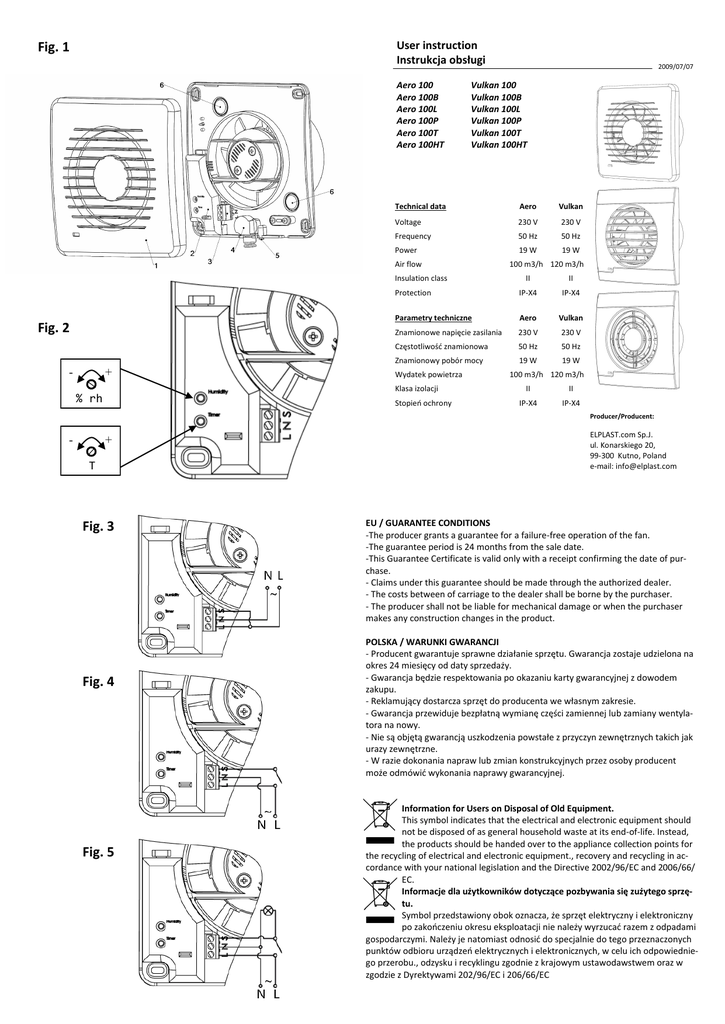 User instruction Instrukcja obsługi Fig. 1 Aero 100 Aero 100B Aero 100L Aero 100P Aero 100T Aero 100HT Vulkan 100 Vulkan 100B Vulkan 100L Vulkan 100P Vulkan 100T Vulkan 100HT Technical data Aero Vulkan Voltage 230 V 230 V Frequency 50 Hz 50 Hz Power 19 W 19 W Air flow Insulation class - + II II IP-X4 Parametry techniczne Aero Vulkan Znamionowe napięcie zasilania 230 V 230 V Częstotliwośd znamionowa 50 Hz 50 Hz Znamionowy pobór mocy 19 W 19 W Wydatek powietrza Klasa izolacji % rh 100 m3/h 120 m3/h IP-X4 Protection Fig. 2 2009/07/07 Stopieo ochrony 100 m3/h 120 m3/h II II IP-X4 IP-X4 Producer/Producent: - + T Fig. 3 Fig. 4 Fig. 5 ELPLAST.com Sp.J. ul. Konarskiego 20, 99-300 Kutno, Poland e-mail: [email protected] EU / GUARANTEE CONDITIONS -The producer grants a guarantee for a failure-free operation of the fan. -The guarantee period is 24 months from the sale date. -This Guarantee Certificate is valid only with a receipt confirming the date of purchase. - Claims under this guarantee should be made through the authorized dealer. - The costs between of carriage to the dealer shall be borne by the purchaser. - The producer shall not be liable for mechanical damage or when the purchaser makes any construction changes in the product. POLSKA / WARUNKI GWARANCJI - Producent gwarantuje sprawne działanie sprzętu. Gwarancja zostaje udzielona na okres 24 miesięcy od daty sprzedaży. - Gwarancja będzie respektowania po okazaniu karty gwarancyjnej z dowodem zakupu. - Reklamujący dostarcza sprzęt do producenta we własnym zakresie. - Gwarancja przewiduje bezpłatną wymianę części zamiennej lub zamiany wentylatora na nowy. - Nie są objętą gwarancją uszkodzenia powstałe z przyczyn zewnętrznych takich jak urazy zewnętrzne. - W razie dokonania napraw lub zmian konstrukcyjnych przez osoby producent może odmówid wykonania naprawy gwarancyjnej. Information for Users on Disposal of Old Equipment. This symbol indicates that the electrical and electronic equipment should not be disposed of as general household waste at its end-of-life. Instead, the products should be handed over to the appliance collection points for the recycling of electrical and electronic equipment., recovery and recycling in accordance with your national legislation and the Directive 2002/96/EC and 2006/66/ EC. Informacje dla użytkowników dotyczące pozbywania się zużytego sprzętu. Symbol przedstawiony obok oznacza, że sprzęt elektryczny i elektroniczny po zakooczeniu okresu eksploatacji nie należy wyrzucad razem z odpadami gospodarczymi. Należy je natomiast odnosid do specjalnie do tego przeznaczonych punktów odbioru urządzeo elektrycznych i elektronicznych, w celu ich odpowiedniego przerobu., odzysku i recyklingu zgodnie z krajowym ustawodawstwem oraz w zgodzie z Dyrektywami 202/96/EC i 206/66/EC APPLICATION The exhaust duct fans are ideal for bathrooms and toilet applications. They are used for supporting natural ventilation and can be installed the areas with their own ventilation duct lines with the exception of areas prone to corrosion and explosion. - The equipment is not intended for use by persons (including children) with reduced physical, sensory or mental ability. - The equipment is not designed to be fun for children INSTALLATION AND USAGE - Please take off the front cover (1/Fig.1) using a small cross screw driver (Screw—5/Fig.1). - The fan should be fitted instead of the ventilation grill or in the place prepared exactly for his kind of fans. For installation please use the holes situated in a fan body. - The fans with a pull switch and cable with a plug should be plugged into the electric socket ~220-230V. In order to use the fan please pull the cord to switch it on and off. -The fans in basic version (B) with terminal block only or with the electronic control systems (T, HT) should be connected with the wiring system directly (Electric schema of fan installation: Fig.3,Fig.4,Fig.5). Please note that all wiring must comply with current I.E.E. Wiring Regulations, if in any doubt consult a qualified electrician. -The fan with a pull switcher (4/Fig.1) enables temporary starting and stopping of the fan by pulling the cord coming out of the fan. -The fixed cover should evenly adhere to the wall panel to avoid distortion - Every precaution should be taken to avoid reverse gas flow to the open ventilation trunk or other open fire areas. For the fans with the permanent electrical connection, the electrical installation must have a switch with the distance between the contacts of all poles of not less than 3 mm. The (T) and (HT) fan versions have an embedded timer, which needs to be set with an adjustable knob (T/Fig.2). The range of the delay is 0,5-30 min. The activation is done by the switch or in the (HT) fan version automatically when a certain humidity level is reached. When the LED light is pulsing the fan works in a timer mode. The fan with a humidity sensor (HT) requires the setting of the room humidity level. It is done by turning the adjustable knob (% rh/Fig.2) to the extreme (-) position. The fan starts working and the LED light sends continuous light. If the knob is turned very slowly to the (+) position, the LED light begins pulsing. It is the indication the required humidity level is reached. The adjustments should be made in the dry room before bathing or other water operations. PRZEZNACZENIE Wentylator kanałowy to idealne rozwiązanie dla łazienek i toalet. Służy do wspomagania wentylacji grawitacyjnej i może byd instalowany w pomieszczeniach, które posiadają indywidualne przewody wentylacyjne, w budynkach mieszkalnych zamieszkania zbiorowego i użytku publicznego, z wyjątkiem pomieszczeo, w których może występowad atmosfera wywołująca korozję lub wybuch. -Sprzęt nie jest przeznaczony do użytkowania przez osoby (w tym dzieci) o ograniczonej zdolności fizycznej, czuciowej lub psychicznej. -Sprzęt nie jest przeznaczony do zabawy dla dzieci. SPOSÓB MONTAŻU I OBS