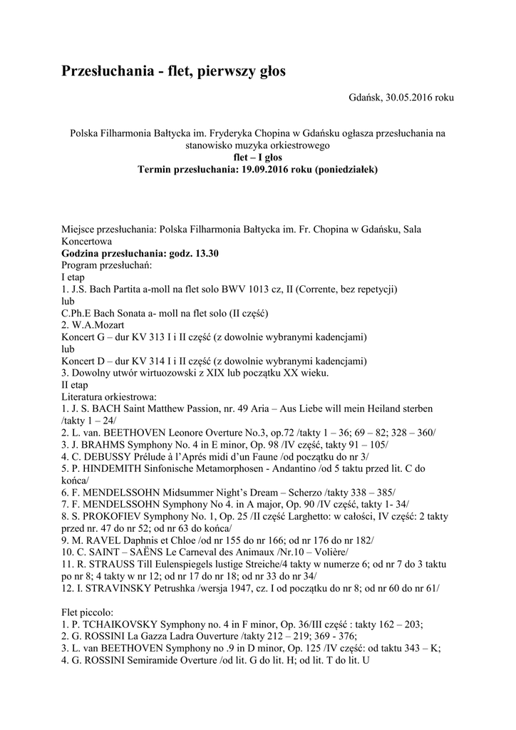 Przesłuchania - flet, pierwszy głos Gdańsk, 30.05.2016 roku Polska Filharmonia Bałtycka im. Fryderyka Chopina w Gdańsku ogłasza przesłuchania na stanowisko muzyka orkiestrowego flet – I głos Termin przesłuchania: 19.09.2016 roku (poniedziałek) Miejsce przesłuchania: Polska Filharmonia Bałtycka im. Fr. Chopina w Gdańsku, Sala Koncertowa Godzina przesłuchania: godz. 13.30 Program przesłuchań: I etap 1. J.S. Bach Partita a-moll na flet solo BWV 1013 cz, II (Corrente, bez repetycji) lub C.Ph.E Bach Sonata a- moll na flet solo (II część) 2. W.A.Mozart Koncert G – dur KV 313 I i II część (z dowolnie wybranymi kadencjami) lub Koncert D – dur KV 314 I i II część (z dowolnie wybranymi kadencjami) 3. Dowolny utwór wirtuozowski z XIX lub początku XX wieku. II etap Literatura orkiestrowa: 1. J. S. BACH Saint Matthew Passion, nr. 49 Aria – Aus Liebe will mein Heiland sterben /takty 1 – 24/ 2. L. van. BEETHOVEN Leonore Overture No.3, op.72 /takty 1 – 36; 69 – 82; 328 – 360/ 3. J. BRAHMS Symphony No. 4 in E minor, Op. 98 /IV część, takty 91 – 105/ 4. C. DEBUSSY Prélude à l’Aprés midi d’un Faune /od początku do nr 3/ 5. P. HINDEMITH Sinfonische Metamorphosen - Andantino /od 5 taktu przed lit. C do końca/ 6. F. MENDELSSOHN Midsummer Night’s Dream – Scherzo /takty 338 – 385/ 7. F. MENDELSSOHN Symphony No 4. in A major, Op. 90 /IV część, takty 1- 34/ 8. S. PROKOFIEV Symphony No. 1, Op. 25 /II część Larghetto: w całości, IV część: 2 takty przed nr. 47 do nr 52; od nr 63 do końca/ 9. M. RAVEL Daphnis et Chloe /od nr 155 do nr 166; od nr 176 do nr 182/ 10. C. SAINT – SAËNS Le Carneval des Animaux /Nr.10 – Volière/ 11. R. STRAUSS Till Eulenspiegels lustige Streiche/4 takty w numerze 6; od nr 7 do 3 taktu po nr 8; 4 takty w nr 12; od nr 17 do nr 18; od nr 33 do nr 34/ 12. I. STRAVINSKY Petrushka /wersja 1947, cz. I od początku do nr 8; od nr 60 do nr 61/ Flet piccolo: 1. P. TCHAIKOVSKY Symphony no. 4 in F minor, Op. 36/III część : takty 162 – 203; 2. G. ROSSINI La Gazza Ladra Ouverture /takty 212 – 219; 369 - 376; 3. L. van BEETHOVEN Symphony no .9 in D minor, Op. 125 /IV część: od taktu 343 – K; 4. G. ROSSINI Semiramide Overture /od lit. G do lit. H; od lit. T do lit. U czytanie nut a vista Pisemne zgłoszenia wraz z życiorysem artystycznym (również w wersji anglojęzycznej) należy kierować bezpośrednio do Biura Koncertowego PFB lub na adres: [email protected] Termin składania zgłoszeń: 16.09.2016 r. (piątek), do godz. 12:00 Filharmonia zastrzega sobie prawo zaproszenia na przesłuchanie wybranych kandydatów. Przesłuchanie (w obu etapach) ma charakter anonimowy (za kotarą). Regulamin przesłuchania dostępny na stronie www.filharmonia.gda.pl w zakładce aktualności Filharmonia nie zapewnia akompaniatora. Materiały nutowe: materiały nutowe można pobrać on-line (www.filharmonia.gda.pl w zakładce aktualności, linki: materiały cz. I i materiały cz. II ) dostępne również w Biurze Koncertowym PFB 80-751 Gdańsk, ul. Ołowianka 1; e-mail: [email protected] telefon: (58) 320 62 63/(58) 323 83 54