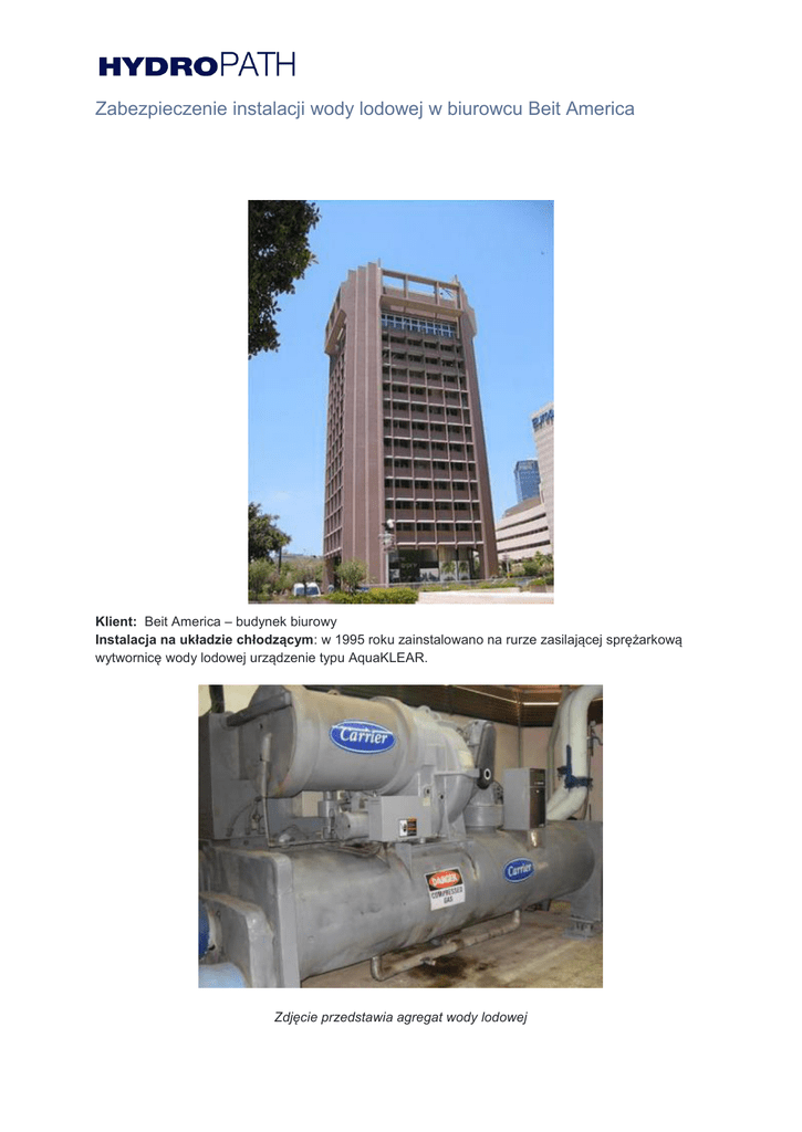 Zabezpieczenie instalacji wody lodowej w biurowcu Beit America Klient: Beit America – budynek biurowy Instalacja na układzie chłodzącym: w 1995 roku zainstalowano na rurze zasilającej sprężarkową wytwornicę wody lodowej urządzenie typu AquaKLEAR. Zdjęcie przedstawia agregat wody lodowej Zdjęcie przedstawia zamontowane urządzenie AquaKLEAR Opis systemu : Cztery wierze chłodnicze dostarczają schłodzoną wodę do agregatu Carrier z wewnętrznym wymiennikiem ciepła. Z agregatu za pomocą pompy woda lodowa rozprowadzana jest do odbiorników. Wyniki. Technologia Hydropath pozwala na zachowanie zarówno instalacji dystrybucji jak i powierzchni wymiany ciepła w stanie czystym, gwarantującym wysoką sprawność wymiany ciepła ( chłodu). Wierze chłodnicze pozbawione są osadów mineralnych i osadów biologicznych. Brak stosowania środków chemicznych wpływa na zmniejszenie korozji instalacji i efekty ekonomiczne eksploatacji. Eliminacja bakterii powoduje, że korozja związana z tymi organizmami została powstrzymana. Eksploatacja instalacji wody lodowej możliwa jest nie tylko bez użycia środków chemicznych ale również bez potrzeby wykonywania uciążliwych prac konserwacyjnych. W 2008 roku ( po 13 latach od instalacji AquaKLEAR) przegląd techniczny instalacji potwierdziła że układ wymiany ciepła nadal jest czysty. Po sukcesach w tej pierwszej testowej instalacji, technologia Hydropath stosowana jest w podobnych instalacjach w różnych krajach. Na podstawie materiałów firmy: PALBAR