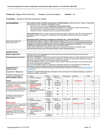 Instrukcja przygotowania sprzętu medycznego wielokrotnego użytku zgodnie z normą EN ISO 17664:2004 _________________________________________________________________________________ Producent: Wagner GmbH München Proces: Czynności wstępne Symbol: b.d. Produkt(y): Kontenery SteriSet (wszystkie rodzaje) OSTRZEŻENIA: Przy wyborze metod i środków czyszczących i dezynfekujących należy wziąć pod uwagę ich tolerancję przez aluminium oraz uwzględnić następujące punkty: − Wybierać środki czyszczące w zależności od parametrów wody − Nie używać środków rysujących powierzchnię (proszki) ani metalowych szczotek lub podobnych, − Usuwać dokładnie wszystkie pozostałości po środkach czyszczących − Dokładnie osuszyć wszystkie części po czyszczeniu/dezynfekcji Dla gorącej wody (>60 oC np. przy dezynfekcji termicznej) używać wyłącznie wody VE (w pełni odsolonej), ponieważ przy temp. powyżej 60 oC zmiękczona lub wodociągowa woda może wchodzić w reakcję z aluminium. Ograniczenia dotyczące ponownego użycia: Sterylizować tylko metodą pary wodnej pod ciśnieniem (np. norma PN EN 285) Przy pierwszym użyciu („mycie”) należy zwrócić uwagę: Szybkie powtórzenia procesów czyszczenia i dezynfekcji lub sterylizacji urządzeń może uszkodzić powierzchnię aluminium. Dla pierwszych trzech cykli przygotowania zaleca się jednodniowe przerwy pomiędzy poszczególnymi etapami. Po tym okresie, prawidłowe przygotowanie może odbywać się w normalnych cyklach. Koniec okresu użytkowania urządzenia określa się w normalnych warunkach na podstawie jego mechanicznego zużycia oraz kontroli jego działania ( patrz instrukcja obsługi). SPOSÓB UŻYCIA Miejsce użytkowania: Przechowywanie i transport Przygotowanie do dekontaminacji: Czyszczenie : Maszynowe Urządzenie zastosowane do czyszczenia i dezynfekcji: Belimed WD290 i WD 3xx Uwaga: Resztki alkaliczne mogą podczas dezynfekcji termicznej wchodzić w reakcję z aluminium. Opcjonalne PODWÓJNE płukanie końcowe daje większą pewność usunięcia resztek przez to poprawę tolerancji procesu! Urządzenie zastosowane do czyszczenia i dezynfekcji: Miele G 7824 Ważna uwaga: Resztki alkaliczne mogą podczas dezynfekcji termicznej wchodzić w reakcję z aluminium. Dopiero PODWÓJNE płukanie końcowe umożliwia tak jak w przykładzie obok (A0 wartość 3000!) tolerancję procesu przez aluminium! Otworzyć kontener po odbezpieczeniu obydwu zamknięć i podnieść pionowo pokrywę (nie otwierać jednostronnie, nie przewracać!) Wg.normy DIN58953-8: Czas przechowywania nie ma tak dużego wpływu na utratę sterylności jak warunki i ingerencja środowiska zewnętrznego podczas składowania, transportu i użytkowania urządzenia. Dlatego wykazany czas przechowywania nie zawsze może być wiarygodny. Norma DIN 58953-8 Tabela 1 (patrz następna strona) zawiera zalecenia dotyczące czasu przechowywania dla sterylnych produktów medycznych. Wg. normy DIN 58953-9 akapit 10: Pojemniki do sterylizacji powinny być transportowane możliwie bez wstrząsów i w pionie (odmienne warunki należy sprawdzić pod kątem przydatności). Przy otwartej pokrywie: Zewnętrzną pokrywę i pokrywę bariery rozdzielić i czyścić osobno (patrz instrukcja użytkowania) Produkty Dr. Weigert (Neodisher) przy zachowaniu niżej wymienionych warunków pozwalają na uzyskanie walidacji rezultatów czyszczenia: # 1 Krok Płukanie wstępne 2 3 4 Czyszczenie Płukanie Płukanie końcowe Opcja 2 płukanie końcowe Dez. termiczna (przy wartości A0 600) Suszenie 5 6 # 1 Krok Płukanie wstępne 2 3 4 5 6 Czyszczenie Płukanie 1 płukanie końcowe 2 płukanie końcowe Dezynfekcja termiczna (przy wartości A0 3000) Suszenie 7 Ausstellungsdatum: 27.07.2010 Woda wodociągowa VE VE VE VE Temp oC 25 do 33 Czas w min. 2 Chemia ml/litr -.- -.- 55 25 do 33 25 do 33 25 do 33 10 2 2 2 SeptoClean -.-.-.- 2,0 -.-.-.- VE 93 1 -.- -.- Gorące powietrze Gorące powietrze 130 4 -.- -.- 100 6 -.- -.- Woda wodociągowa VE VE VE VE VE Gorące powietrze Temp oC 25 do 33 Czas w min. 2 Chemia ml/litr -.- -.- 45 25 do 33 25 do 33 25 do 33 93 5 2 2 2 5 MediClean Forte -.-.-.-.- 3,0 -.-.-.-.- 110 5 -.- -.- Seite 1/2 Instrukcja przygotowania sprzętu medycznego wielokrotnego użytku zgodnie z normą EN ISO 17664:2004 _________________________________________________________________________________ Czyszczenie : Manualne Ogólnie: Zabrudzone powierzchnie czyścić środkami czyszczącymi PH neutralnymi, tolerującymi aluminium i miękkimi szczotkami lub ręcznikami. Na koniec usunąć całkowicie środek czyszczący! Przykład: Shining NE (poch. Wagner GmbH): Uwaga: 1. Resztki środków czyszczących mogą przy następnej dezynfekcji termicznej lub 2. sterylizacji wchodzić w reakcję z aluminium. 3. Całkowite usuniecie resztek zastosowanej 4. chemii czyszczącej jest niezbędne do zachowania tolerancji materiałowej procesu przygotowania. Dezynfekcja: Uwaga: Resztki środków do dezynfekcji mogą przy następującej sterylizacji wchodzić w reakcję z aluminium. Całkowite usunięcie resztek zastosowanego środka dezynfekującego jest niezbędne do zachowania tolerancji materiałowej procesu przygotowania! Środek Shining NE rozprowadzić i wetrzeć mokrą ściereczka na powierzchni (maks. 3ml na 50 cm²). Przy lekko zabrudzonych powierzchniach zostawić środek na 3 do 5 minut, przy mocno zabrudzonych na 15 minut. Czyszczone powierzchnie dokładnie spłukać wodą wodociągową lub wodą destylowaną. Wyczyszczone powierzchnie wytrzeć do sucha ścierką nie pozostawiającą resztek materiału. Środki dezynfekujące należy dobierać pod kątem ich oddziaływania (sprawdzone środki patrz np.: lista sporządzona przez RKI lub DGHM) oraz ich tolerancji materiałowej. Ponieważ nie istnieje „ogólna” tolerancja materiałowa (zależna jest ona od parametrów zastosowanej wody, stężenia, czasu działania i temperatury jak i ewentualnie efektów wywołanych popr