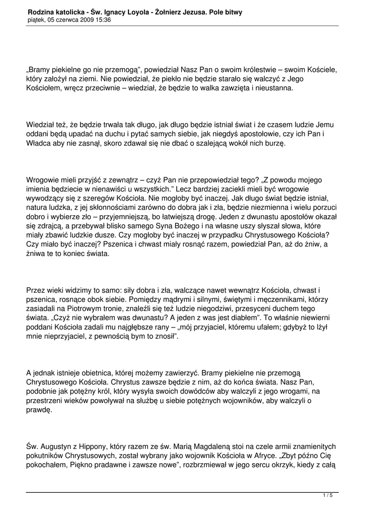 Rodzina katolicka - Św. Ignacy Loyola - Żołnierz Jezusa. Pole bitwy piątek, 05 czerwca 2009 15:36 „Bramy piekielne go nie przemogą”, powiedział Nasz Pan o swoim królestwie – swoim Kościele, który założył na ziemi. Nie powiedział, że piekło nie będzie starało się walczyć z Jego Kościołem, wręcz przeciwnie – wiedział, że będzie to walka zawzięta i nieustanna. Wiedział też, że będzie trwała tak długo, jak długo będzie istniał świat i że czasem ludzie Jemu oddani będą upadać na duchu i pytać samych siebie, jak niegdyś apostołowie, czy ich Pan i Władca aby nie zasnął, skoro zdawał się nie dbać o szalejącą wokół nich burzę. Wrogowie mieli przyjść z zewnątrz – czyż Pan nie przepowiedział tego? „Z powodu mojego imienia będziecie w nienawiści u wszystkich.” Lecz bardziej zaciekli mieli być wrogowie wywodzący się z szeregów Kościoła. Nie mogłoby być inaczej. Jak długo świat będzie istniał, natura ludzka, z jej skłonnościami zarówno do dobra jak i zła, będzie niezmienna i wielu porzuci dobro i wybierze zło – przyjemniejszą, bo łatwiejszą drogę. Jeden z dwunastu apostołów okazał się zdrajcą, a przebywał blisko samego Syna Bożego i na własne uszy słyszał słowa, które miały zbawić ludzkie dusze. Czy mogłoby być inaczej w przypadku Chrystusowego Kościoła? Czy miało być inaczej? Pszenica i chwast miały rosnąć razem, powiedział Pan, aż do żniw, a żniwa te to koniec świata. Przez wieki widzimy to samo: siły dobra i zła, walczące nawet wewnątrz Kościoła, chwast i pszenica, rosnące obok siebie. Pomiędzy mądrymi i silnymi, świętymi i męczennikami, którzy zasiadali na Piotrowym tronie, znaleźli się też ludzie niegodziwi, przesyceni duchem tego świata. „Czyż nie wybrałem was dwunastu? A jeden z was jest diabłem”. To właśnie niewierni poddani Kościoła zadali mu najgłębsze rany – „mój przyjaciel, któremu ufałem; gdybyż to lżył mnie nieprzyjaciel, z pewnością bym to znosił”. A jednak istnieje obietnica, której możemy zawierzyć. Bramy piekielne nie przemogą Chrystusowego Kościoła. Chrystus zawsze będzie z nim, aż do końca świata. Nasz Pan, podobnie jak potężny król, który wysyła swoich dowódców aby walczyli z jego wrogami, na przestrzeni wieków powoływał na służbę u siebie potężnych wojowników, aby walczyli o prawdę. Św. Augustyn z Hippony, który razem ze św. Marią Magdaleną stoi na czele armii znamienitych pokutników Chrystusowych, został wybrany jako wojownik Kościoła w Afryce. „Zbyt późno Cię pokochałem, Piękno pradawne i zawsze nowe”, rozbrzmiewał w jego sercu okrzyk, kiedy z całą 1/5 Rodzina katolicka - Św. Ignacy Loyola - Żołnierz Jezusa. Pole bitwy piątek, 05 czerwca 2009 15:36 mocą walczył z wrogami Pana. Gdy zepsucie Rzymu czasów cezarów rozprzestrzeniło się po cywilizowanych krajach Europy i nawet duchowieństwo nie było wolne od grzechów, którym nie było w stanie się oprzeć, młody rzymski patrycjusz – Benedykt – uciekł od tego świata, gdzie brak umiaru był wartością nadrzędną i znalazł w modlitwie, pracy i wyrzeczeniach ład, który miał się stać siłą regenerującą dla przyszłych stuleci. Później, gdy świat znowu osłabł pod wpływem namiętności do przepychu i splendoru, które były tak charakterystyczne dla średniowiecza, Franciszek, biedaczyna z Asyżu, odszedł z domu swego ojca, by nauczać miłowania ubóstwa i namówił tłumy do porzucenia grzesznego życia i podążenia za Panem, którego był wysłannikiem. Podczas gdy św. Franciszek głosił swoje nauki w górach Umbrii, św. Dominik zakładał swój Zakon Kaznodziejski – Psy Pańskie* – który miał niezłomnie stać przy Kościele Chrystusa, broniąc prawdy i nauczając doktryny Kościoła. Wraz z renesansem pojawiło się nowe niebezpieczeństwo. Odrodzenie się nauki było, samo w sobie, rzeczą znakomitą, lecz, jak wiele innych znakomitych rzeczy, miało też swoje wady. Najpierw musimy sobie uzmysłowić, że słowo „nauka” w odniesieniu do renesansu oznaczało tylko jedną jej gałąź: studiowanie klasycznej sztuki i pisarstwa. Autorzy antycznej Grecji i Rzymu byli poganami i żyli, po większej części, w czasach kiedy zepsucie cywilizowanego świata było wręcz przysłowiowe. Pisali dla zdemoralizowanego wieku i obok myśli wzniosłych i szlachetnych, pojawiało się również wiele takich, które odwoływały się tylko do tego, co w człowieku nikczemne i podłe. Pęd do wszystkiego co klasyczne był szczególnie silny w południowej Europie, lecz dotarł nawet do krajów północnych. Nikt, kto nie był dobrze obeznany z greką lub łaciną, nie zasługiwał na miano wartościowego człowieka, ale jeśli był „humanistą” nie miało znaczenia jak złe prowadził życie, czy jak haniebne były jego pisma – wszędzie mu nadskakiwano i podziwiano go. W taki sposób pogańscy autorzy wprowadzili pogańskiego ducha. Opowieści o barbarzyńskich bogach i boginiach były czytane chętniej niż żywo ty świętych czy ich dzieła; ludzie woleli 2/5 Rodzina katolicka - Św. Ignacy Loyola - Żołnierz Jezusa. Pole bitwy piątek, 05 czerwca 2009 15:36 Owidiusza i Horacego od Biblii. Trucizna rozeszła się po wszystkich warstwach społeczeństwa, również wśród duchowieństwa. Wiara i zapał osłabły, podczas gdy przepych i zbytek panowały niepodzielnie. Świat znowu, jak już wiele razy w przeszłości, pogrążał się coraz bardziej pod wpływem zgubnego umiłowania przyjemności i niepohamowanego folgowania sobie. Wenus Tycjana zajęła miejsce Madonny Fra Angelico. Konieczne były zmiany. Nikt nie rozumiał tego lepiej niż sam Kościół, o czym mogą świadczyć pisma i żywoty ówczesnych świętych mężów. Obszarami, które zmian potrzebowały najbardziej, były życie i moralność zarówno duchowieństwa, jak i społeczeństwa świeckiego. Reforma