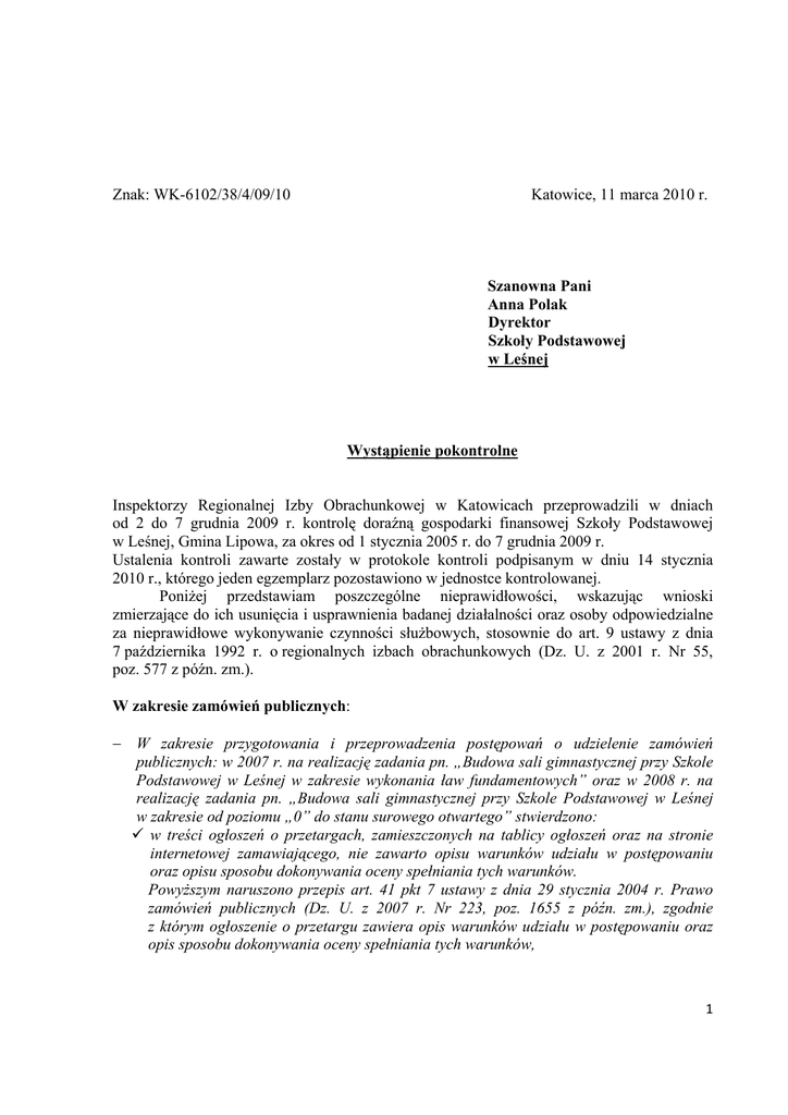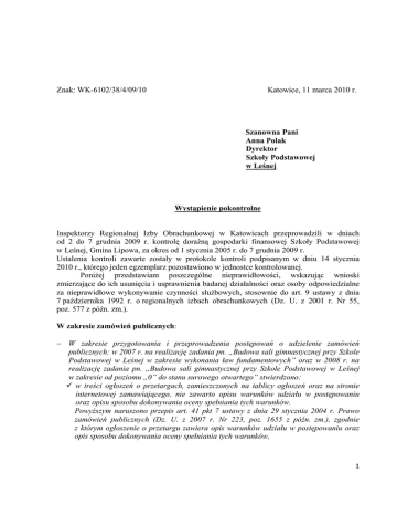 Znak: WK-6102/38/4/09/10 Katowice, 11 marca 2010 r. Szanowna Pani Anna Polak Dyrektor Szkoły Podstawowej w Leśnej Wystąpienie pokontrolne Inspektorzy Regionalnej Izby Obrachunkowej w Katowicach przeprowadzili w dniach od 2 do 7 grudnia 2009 r. kontrolę doraźną gospodarki finansowej Szkoły Podstawowej w Leśnej, Gmina Lipowa, za okres od 1 stycznia 2005 r. do 7 grudnia 2009 r. Ustalenia kontroli zawarte zostały w protokole kontroli podpisanym w dniu 14 stycznia 2010 r., którego jeden egzemplarz pozostawiono w jednostce kontrolowanej. PoniŜej przedstawiam poszczególne nieprawidłowości, wskazując wnioski zmierzające do ich usunięcia i usprawnienia badanej działalności oraz osoby odpowiedzialne za nieprawidłowe wykonywanie czynności słuŜbowych, stosownie do art. 9 ustawy z dnia 7 października 1992 r. o regionalnych izbach obrachunkowych (Dz. U. z 2001 r. Nr 55, poz. 577 z późn. zm.). W zakresie zamówień publicznych: − W zakresie przygotowania i przeprowadzenia postępowań o udzielenie zamówień publicznych: w 2007 r. na realizację zadania pn. „Budowa sali gimnastycznej przy Szkole Podstawowej w Leśnej w zakresie wykonania ław fundamentowych” oraz w 2008 r. na realizację zadania pn. „Budowa sali gimnastycznej przy Szkole Podstawowej w Leśnej w zakresie od poziomu „0” do stanu surowego otwartego” stwierdzono: w treści ogłoszeń o przetargach, zamieszczonych na tablicy ogłoszeń oraz na stronie internetowej zamawiającego, nie zawarto opisu warunków udziału w postępowaniu oraz opisu sposobu dokonywania oceny spełniania tych warunków. PowyŜszym naruszono przepis art. 41 pkt 7 ustawy z dnia 29 stycznia 2004 r. Prawo zamówień publicznych (Dz. U. z 2007 r. Nr 223, poz. 1655 z późn. zm.), zgodnie z którym ogłoszenie o przetargu zawiera opis warunków udziału w postępowaniu oraz opis sposobu dokonywania oceny spełniania tych warunków, 1 zaniechanie wezwania wykonawcy, w postępowaniu o udzielenie w 2007 r. zamówienia na wykonanie zadania pn. „Budowa sali gimnastycznej przy Szkole Podstawowej w Leśnej w zakresie wykonania ław fundamentowych”, do uzupełnienia oferty. PowyŜszym naruszono przepis art. 26 ust. 3 ustawy z dnia 29 stycznia 2004 r. Prawo zamówień publicznych (Dz. U. z 2007 r. Nr 223, poz. 1655 z późn. zm.). W specyfikacji istotnych warunków zamówienia w celu potwierdzenia spełnienia warunków udziału w przetargu, zamawiający zaŜądał dokumentów potwierdzających, Ŝe osoby, które będą wykonywać zamówienie, posiadają stosowne uprawnienia, jeŜeli ustawy nakładają obowiązek posiadania takich uprawnień. Przedmiot zamówienia obejmował, oprócz robót budowlanych konstrukcyjnych, wykonanie elementów instalacji c. o. oraz instalacji kanalizacyjnej. W ofercie złoŜonej przez jednego z wykonawców zawarto wyłącznie uprawnienia dwóch osób w zakresie specjalności konstrukcyjno – inŜynierskiej. − W postępowaniu o udzielenie w 2009 r. zamówienia na realizację zadania pn. „Budowa sali gimnastycznej przy Szkole Podstawowej w Leśnej w zakresie prac wykończeniowych wraz z instalacjami i zagospodarowaniem terenu wokół sali ” stwierdzono, Ŝe: Zamawiający zaŜądał w ogłoszeniu o zmianie ogłoszenia o przetargu z dnia 4 czerwca 2009 r. oraz w specyfikacji istotnych warunków zamówienia, w wykazie oświadczeń i dokumentów jakie mają dostarczyć oferenci w celu potwierdzenia spełnienia warunków udziału w postępowaniu, wykazu informacji stanowiących tajemnicę przedsiębiorstwa w rozumieniu ustawy z dnia 16 kwietnia 1993 r. o zwalczaniu nieuczciwej konkurencji (Dz. U. z 2003 r. Nr 153, poz. 1503 z późn. zm.), które wykonawca pragnie zastrzec przed dostępem dla innych uczestników z podaniem podstawy prawnej. PowyŜsze było niezgodne z postanowieniami rozporządzenia Prezesa Rady Ministrów z dnia 19 maja 2006 r. w sprawie rodzajów dokumentów, jakich moŜe Ŝądać zamawiający od wykonawcy, oraz form, w jakich te dokumenty mogą być składane (Dz. U. Nr 87, poz. 605). W rozporządzeniu tym, nie wymieniono ww. informacji stanowiących tajemnicę przedsiębiorstwa jako dokumentów, których zamawiający mógł Ŝądać na potwierdzenie spełnienia warunków udziału w postępowaniu. Ponadto stwierdzono, Ŝe wybrany wykonawca nie złoŜył wymaganego przez zamawiającego ww. wykazu informacji. Zamawiający zaniechał wezwania wykonawcę do złoŜenia powyŜszego dokumentu w trybie art. 26 ust. 3 ustawy z dnia 29 stycznia 2004 r. Prawo zamówień publicznych (Dz. U. z 2007 r. Nr 223, poz. 1655 z późn. zm.). Przygotowanie i przeprowadzenie ww. postępowań naleŜało do obowiązków stałej komisji przetargowej powołanej na podstawie Zarządzenia Dyrektora Szkoły Podstawowej w Leśnej Nr 15/2007 z dnia 9 marca 2007 r. Umowy w sprawie udzielenia ww. zamówień publicznych podpisała w imieniu zamawiającego p. Anna Polak – Dyrektor Szkoły Podstawowej w Leśnej. Wniosek nr 1 Wzmocnić nadzór nad pracownikami Szkoły Podstawowej w Leśnej odpowiedzialnymi za przygotowanie i przeprowadzenie postępowań o udzielenie zamówień publicznych, mając na uwadze przepisy art. 68 oraz art. 69 ust. 1 pkt 3 ustawy z dnia 27 sierpnia 2009 r. o finansach publicznych (Dz. U. Nr 157, poz. 1240). 2 W zakresie księgowości: - W Szkole Podstawowej w Leśnej nie został zatrudniony Główny Księgowy. Obsługę finansowo-księgową Szkoły Podstawowej w Leśnej prowadzili pracownicy Urzędu Gminy w Lipowej. Takie zorganizowanie obsługi finansowo-księgowej jednostki było niezgodne z przepisami art. 28 a ust. 2 oraz art. 35 ust. 1 ustawy z dnia 26 listopada 1998 r. o finansach publicznych (Dz. U. z 2003 r. Nr 15, poz. 148 z późn. zm.), a następnie art. 44 ust.2 oraz art. 45 ust. 1 ustawy z dnia 30 czerwca 2005 r. o finansach publicznych (Dz. U. Nr 249, poz. 2104 z późn. zm.). Odpowiedzialność za całość gospodarki finansowej jednostki ponosi p. Anna Polak – Dyrektor Szkoły Po