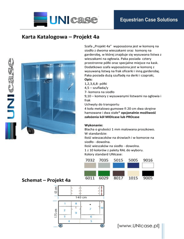 Equestrian Case Solutions Karta Katalogowa – Projekt 4a Szafa „Projekt 4a” wyposażona jest w komorę na siodło z dwoma wieszakami oraz komorę na garderobę, w której znajduje się wysuwana listwa z wieszakami na ogłowia. Paka posiada cztery przestronne półki oraz specjalne miejsce na kask. Dodatkowo szafa wyposażona jest w komorę z wysuwaną listwą na frak oficerki i inną garderobę. Paka posiada dużą szufladę na derki i czapraki, Opis: 1,2,3,6,8- półki 4,5 – szuflada/y 7- komora na siodło 9,10 – komory z wysuwanymi listwami na ogłowia i frak Uchwyty do transportu 4 koła metalowo gumowe fi 20 cm dwa skrętne hamowane i dwa stałe* opcjonalnie możliwość założenia kół MIDIcase lub PROcase Wykonanie: Blacha o grubości 1 mm malowana proszkowo. W standardzie: Ilość wieszaczków na drzwiach i w komorze na siodło - dowolna. Ilość wieszaków na siodło - dowolna. 1 z 10 kolorów z palety RAL do wyboru. Kolory standard UNIcase: Schemat – Projekt 4a [www.UNIcase.pl] Equestrian Case Solutions Karta Katalogowa – Projekt 4b Szafa „Projekt 4b” wyposażona jest w komorę na siodło z dwoma wieszakami oraz komorę na garderobę, w której znajduje się wysuwana listwa z wieszakami na ogłowia. Paka posiada półkę na kask ponadto wyposażona jest w komorę z wysuwaną listwą na frak oficerki i inną garderobę. Paka posiada sześć szuflad na akcesoria jeździeckie. Opis: 1,2,3,4,5 – szuflada/y 6,8- półki 7- komora na siodło 9,10 – komory z wysuwanymi listwami na ogłowia i frak uchwyty do transportu 4 koła metalowo gumowe fi 20 cm dwa skrętne hamowane i dwa stałe* opcjonalnie możliwość założenia kół MIDIcase lub PROcase Wykonanie: Blacha o grubości 1 mm malowana proszkowo. W standardzie: Ilość wieszaczków na drzwiach i w komorze na siodło - dowolna. Ilość wieszaków na siodło - dowolna. 1 z 10 kolorów z palety RAL do wyboru. Kolory standard UNIcase: Schemat – Projekt 4b [www.UNIcase.pl]