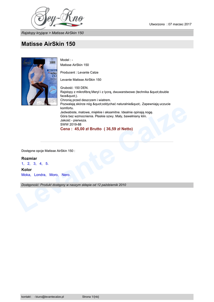 Utworzono : 07 marzec 2017 Rajstopy kryjące > Matisse AirSkin 150 Matisse AirSkin 150 Model : Matisse AirSkin 150 Producent : Levante Calze Levante Matisse AirSkin 150 Grubość: 150 DEN. Rajstopy z mikrofibrą Meryl i z lycrą, dwuwarstwowe (technika "double face"). Chronią przed deszczem i wiatrem. Pozwalają skórze nóg "oddychać naturalnie". Zapewniają uczucie komfortu. Jedwabiste, matowe, miękkie i aksamitne. Idealnie opinają nogę. Góra bez wzmocnienia. Płaskie szwy. Mały, bawełniany klin. Jakość - pierwsza. SWW 2019-88 e t n Dostępne opcje Matisse AirSkin 150 : Rozmiar 1, 2, 3, 4, 5. a v Kolor Moka, Londra, Moro, Nero. e L Dostępność: Produkt dostępny w naszym sklepie od 12 październik 2010 kontakt : - [email protected] Strona 1/{nb} e lz a C Cena : 45,00 zł Brutto ( 36,59 zł Netto)