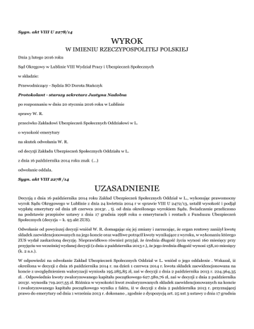 Sygn. akt VIII U 2278/14 WYROK W IMIENIU RZECZYPOSPOLITEJ POLSKIEJ Dnia 3 lutego 2016 roku Sąd Okręgowy w Lublinie VIII Wydział Pracy i Ubezpieczeń Społecznych w składzie: Przewodniczący - Sędzia SO Dorota Stańczyk Protokolant - starszy sekretarz Justyna Nadolna po rozpoznaniu w dniu 20 stycznia 2016 roku w Lublinie sprawy W. R. przeciwko Zakładowi Ubezpieczeń Społecznych Oddziałowi w L. o wysokość emerytury na skutek odwołania W. R. od decyzji Zakładu Ubezpieczeń Społecznych Oddziału w L. z dnia 16 października 2014 roku znak (...) odwołanie oddala. Sygn. akt VIII 2278 /14 UZASADNIENIE Decyzją z dnia 16 października 2014 roku Zakład Ubezpieczeń Społecznych Oddział w L., wykonując prawomocny wyrok Sądu Okręgowego w Lublinie z dnia 24 kwietnia 2014 r w sprawie VIII U 2472/13, ustalił wysokość i podjął wypłatę emerytury od dnia 28 czerwca 2013r. , tj. od dnia określonego wyrokiem Sądu. Świadczenie przeliczono na podstawie przepisów ustawy z dnia 17 grudnia 1998 roku o emeryturach i rentach z Funduszu Ubezpieczeń Społecznych (decyzja – k. 93 akt ZUS). Odwołanie od powyższej decyzji wniósł W. R. domagając się jej zmiany i zarzucając, że organ rentowy zaniżył kwotę składek zaewidencjonowanych na jego koncie oraz wadliwe potrącił kwoty wynikające z wyroku, w wykonaniu którego ZUS wydał zaskarżoną decyzję. Nieprawidłowo również przyjął, że średnia długość życia wynosi 160 miesięcy przy przyjęciu we wcześniej wydanej decyzji (z dnia 2 października 2013 r.), że jego średnia długość wynosi 158,10 miesięcy (k. 2 a.s.). W odpowiedzi na odwołanie Zakład Ubezpieczeń Społecznych Oddział w L. wniósł o jego oddalenie . Wskazał, iż określona w decyzji z dnia 16 października 2014 r. na dzień 1 czerwca 2014 r. kwota składek zaewidencjonowana na koncie z uwzględnieniem waloryzacji wyniosła 195.285,85 zł, zaś w decyzji z dnia 2 października 2013 r. 224.364,35 zł. . Odpowiednio kwoty zwaloryzowanego kapitału początkowego 627.580,76 zł, zaś w decyzji z dnia 2 października 2013r. wynosiła 719.207,55 zł. Różnica w wysokości kwot zwaloryzowanych składek zaewidencjonowanych na koncie i zwaloryzowanego kapitału początkowego wynika z faktu, iż w decyzji z dnia 2 października 2013 r. przyznającej prawo do emerytury od dnia 1 września 2013 r. dokonano , zgodnie z dyspozycją art. 25 ust 3 ustawy z dnia 17 grudnia 1998 roku o emeryturach i rentach z Funduszu Ubezpieczeń Społecznych, waloryzacji kwartalnej za II kwartał 2013 r, natomiast ustalając emeryturę zaskarżoną decyzją zastosowano jako ostatnią waloryzację roczną z 2013 r., która miała niższy współczynnik niż waloryzacja kwartalna. Średnie trwanie życia w wymiarze 160 miesięcy wynika z przyjęcia współczynnika świadczenia obowiązującego na dzień podjęcia wypłaty świadczenia w dniu 28 czerwca 2013 r. W decyzji z dnia 2 października 2013 r. zastosowano inny współczynnik, obowiązujący w dacie 1 września 2013 r. (k. 3-4 a.s.). Sąd Okręgowy ustalił i zważył, co następuje: J. R. urodził się w dniu (...), w dniu 13 czerwca 2013r. złożył wniosek o emeryturę. Decyzją z dnia 28 czerwca 2013 r. organ rentowy przyznał uprawnionemu świadczenie emerytalne od dnia 1 czerwca 2013r. Wypłata emerytury podlegała zawieszeniu, z uwagi nie rozwiązanie stosunku pracy i kontynuowanie przez wnioskodawcę zatrudnienia (k. 42 a.e.). We wniosku o świadczenie J. R. zaznaczył, że rozwiązanie stosunku pracy nastąpi z dniem 27 czerwca 2013r. Świadectwo pracy potwierdzające rozwiązanie stosunku pracy złożył dopiero w dniu 13 września 2013r. (k. 47-48 a.e.). Decyzją z dnia 2 października 2013r. organ rentowy podjął wypłatę świadczenia od dnia 1 września 2013r (k.50 a.s.). Po rozpoznaniu odwołania ubezpieczonego od powyższej decyzji Sąd Okręgowy w wyroku z dnia 24 kwietnia 2014 r. wydanym w sprawie VIII U 2472/13 ustalił, iż ubezpieczony nabył prawo do wypłaty emerytury od dnia 28 czerwca 2013r., tj. od dnia następnego po rozwiązaniu stosunku pracy. W dniu 10 września 2014 r. apelację ZUS od tego wyroku Sąd Apelacyjny w Lublinie oddalił (k. 85-87, 88-91 a.e. ). Zaskarżoną w niniejszym postępowaniu decyzją z dnia 16 października 2014 roku Zakład Ubezpieczeń Społecznych Oddział w L., wykonując prawomocny wyrok Sądu Okręgowego w Lublinie z dnia 24 kwietnia 2014 r. ustalił wysokość i podjął wypłatę emerytury od dnia 28 czerwca 2013r. , tj. od dnia określonego w prawomocnym wyroku Sądu Okręgowego. Podstawę obliczenia świadczenia stanowiła kwota składek na ubezpieczenie emerytalne oraz kapitału początkowego z uwzględnieniem waloryzacji składek i kapitału początkowego zewidencjonowanych na koncie do końca miesiąca poprzedzającego miesiąc, od którego przysługuje wypłata emerytury. Emerytura stanowi równowartość kwoty będącej wynikiem podzielenia podstawy obliczenia emerytury przez dalsze średnie trwanie życia ustalone na dzień podjęcia wypłaty emerytury tj. 28 czerwca 2013 r. Kwota składek zaewidencjonowanych na koncie z uwzględnieniem waloryzacji wyniosła 195285,85 zł., kwota zwaloryzowanego kapitału początkowego wyniosła 627580,76 zł , średnie dalsze trwanie życia 160 miesięcy. Wyliczone w ten sposób świadczenie wyniosło 5142,92 złotych brutto miesięcznie (k.93-94 a.s.). Z uwagi na stanowisko wnioskodawcy, który kwestionował prawidłowość obliczenia emerytury, zgodnie z jego wnioskiem postanowieniem z dnia 29 maja 2015r. Sądu zlecił biegłemu z zakresu rachunkowości, finansów i operacji gospodarczych Z. K. zapoznanie się z aktami sprawy oraz z zastrzeżeniami złożonymi przez wnioskodawcę w odwołaniu i w protokole rozprawy sądowej oraz zbadanie prawidłowości i sposobu wyliczenia wysokości emerytury w decyzji z dnia 16 października 2014 r. (postanowienie k. 12 a.s). W opinii wydanej dnia 4 lipca 2015 r. biegły podnió