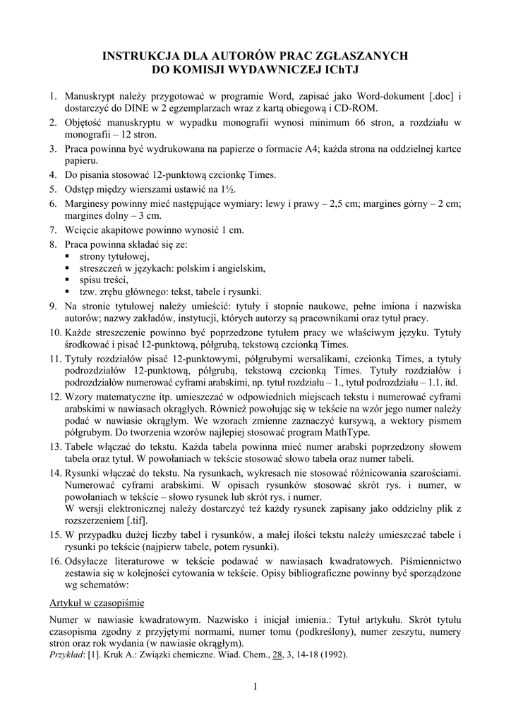 INSTRUKCJA DLA AUTORÓW PRAC ZGŁASZANYCH DO KOMISJI WYDAWNICZEJ IChTJ 1. Manuskrypt należy przygotować w programie Word, zapisać jako Word-dokument [.doc] i dostarczyć do DINE w 2 egzemplarzach wraz z kartą obiegową i CD-ROM. 2. Objętość manuskryptu w wypadku monografii wynosi minimum 66 stron, a rozdziału w monografii – 12 stron. 3. Praca powinna być wydrukowana na papierze o formacie A4; każda strona na oddzielnej kartce papieru. 4. Do pisania stosować 12-punktową czcionkę Times. 5. Odstęp między wierszami ustawić na 1½. 6. Marginesy powinny mieć następujące wymiary: lewy i prawy – 2,5 cm; margines górny – 2 cm; margines dolny – 3 cm. 7. Wcięcie akapitowe powinno wynosić 1 cm. 8. Praca powinna składać się ze: strony tytułowej, streszczeń w językach: polskim i angielskim, spisu treści, tzw. zrębu głównego: tekst, tabele i rysunki. 9. Na stronie tytułowej należy umieścić: tytuły i stopnie naukowe, pełne imiona i nazwiska autorów; nazwy zakładów, instytucji, których autorzy są pracownikami oraz tytuł pracy. 10. Każde streszczenie powinno być poprzedzone tytułem pracy we właściwym języku. Tytuły środkować i pisać 12-punktową, półgrubą, tekstową czcionką Times. 11. Tytuły rozdziałów pisać 12-punktowymi, półgrubymi wersalikami, czcionką Times, a tytuły podrozdziałów 12-punktową, półgrubą, tekstową czcionką Times. Tytuły rozdziałów i podrozdziałów numerować cyframi arabskimi, np. tytuł rozdziału – 1., tytuł podrozdziału – 1.1. itd. 12. Wzory matematyczne itp. umieszczać w odpowiednich miejscach tekstu i numerować cyframi arabskimi w nawiasach okrągłych. Również powołując się w tekście na wzór jego numer należy podać w nawiasie okrągłym. We wzorach zmienne zaznaczyć kursywą, a wektory pismem półgrubym. Do tworzenia wzorów najlepiej stosować program MathType. 13. Tabele włączać do tekstu. Każda tabela powinna mieć numer arabski poprzedzony słowem tabela oraz tytuł. W powołaniach w tekście stosować słowo tabela oraz numer tabeli. 14. Rysunki włączać do tekstu. Na rysunkach, wykresach nie stosować różnicowania szarościami. Numerować cyframi arabskimi. W opisach rysunków stosować skrót rys. i numer, w powołaniach w tekście – słowo rysunek lub skrót rys. i numer. W wersji elektronicznej należy dostarczyć też każdy rysunek zapisany jako oddzielny plik z rozszerzeniem [.tif]. 15. W przypadku dużej liczby tabel i rysunków, a małej ilości tekstu należy umieszczać tabele i rysunki po tekście (najpierw tabele, potem rysunki). 16. Odsyłacze literaturowe w tekście podawać w nawiasach kwadratowych. Piśmiennictwo zestawia się w kolejności cytowania w tekście. Opisy bibliograficzne powinny być sporządzone wg schematów: Artykuł w czasopiśmie Numer w nawiasie kwadratowym. Nazwisko i inicjał imienia.: Tytuł artykułu. Skrót tytułu czasopisma zgodny z przyjętymi normami, numer tomu (podkreślony), numer zeszytu, numery stron oraz rok wydania (w nawiasie okrągłym). Przykład: [1]. Kruk A.: Związki chemiczne. Wiad. Chem., 28, 3, 14-18 (1992). 1 Artykuł w pracy zbiorowej Numer w nawiasie kwadratowym. Nazwisko i inicjał imienia.: Tytuł artykułu. W: Tytuł pracy zbiorowej. Wydawnictwo, miejsce wydania rok wydania, strony. Przykład: [2]. Kruk A.: Opracowania dokumentacyjne. W: Poradnik pracownika informacji. PWN, Warszawa 1991, s. 20-25. Książka Numer w nawiasie kwadratowym. Nazwisko i inicjał imienia.: Tytuł. Numer tomu. Tytuł tomu. Wydawnictwo, miejsce wydania rok wydania, ilość stron. Przykład: [3]. Piróg W.: Gospodarka materiałowa. T.2. PWN, Warszawa 1993, 120 s. Referat opublikowany w materiałach konferencyjnych Numer w nawiasie kwadratowym. Nazwisko i inicjał imienia.: Tytuł. Nazwa konferencji, miejsce konferencji, data konferencji. Wydawnictwo, miejsce rok wydania, strony. Przykład: [4]. Zagórski Z.: Solid state pulse radiolysis. Fifth Working Meeting on Radiation Interaction, Leipzig, 24-27 September 1991, pp. 136-142. 2