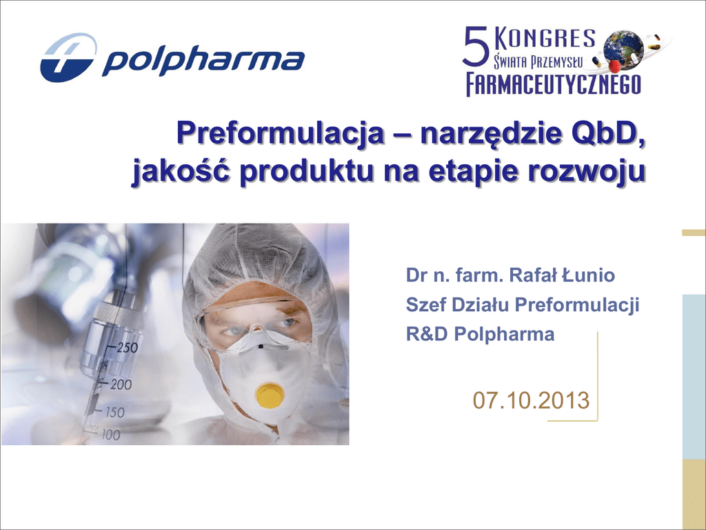 Preformulacja – narzędzie QbD, jakość produktu na etapie rozwoju Dr n. farm. Rafał Łunio Szef Działu Preformulacji R&D Polpharma 07.10.2013 Preformulacjia – etap rozwoju Jeden z pierwszych etapów rozwoju Etap rozwoju technologii (formulacji) obejmujący charakterystykę właściwości chemicznych, fizycznych i mechanicznych w celu zoptymalizowania procesu rozwoju stabilnego, bezpiecznego i efektywnego produktu leczniczego. Charakterystyka substancji czynnej (API) Charakterystyka produktu referencyjnego Polpharma R&D Rozwój produktu farmaceutycznego R&D Formulacja IP BIO Pref Analityka RA Rozwój produktu generycznego Substancja czynna Produkt oryginalny Produkt referencyjny Produkt generyczny Substancje pomocnicze Badania Preformulacyjne Charakterystyka API • • • • • • • • Rozpuszczalność/ kinetyka rozpuszczania Charakterystyka sorpcji par Badania rentgenograficzne - morfizm/forma polimorficzna; amfory Wielkość cząstek Badania termiczne Niezgodności z substancjami pomocniczymi Stabilność (…) pozostałe Badania Preformulacyjne Charakterystyka produktu referencyjnego • Skład (jakościowy i ilościowy) • Wielkość cząstek w produkcie • Charakterystyka procesu technologicznego Badania Preformulacyjne Charakterystyka produktu referencyjnego c.d. • Forma polimorficzna API w produkcie referencyjnym • Mechanizm uwalniania API z formy leku Quality by Design Quality by Design – „jakość przez projekt” • Koncepcja rozwoju produktu farmaceutycznego - zoptymalizowaniu kroków rozwojowych, w których każda podjęta decyzja jest trafna i racjonalnie uzasadniona • Design of Experiments (DoE) - projektowanie doświadczeń, w celu optymalnego doboru składników produktu oraz parametrów procesu • Parametry objęte badaniem określają tzw. przestrzeń projektową (Design Space) o granicach wytyczonych przez ekstrema zmiennych niezależnych Quality by Design Quality by Design – „jakość przez projekt” • Ocena ryzyka – identyfikacja elementów krytycznych procesu, które mogą mieć wpływ na jakość produktu lub/i proces wytwarzania • Technologia Analizy Procesu (PAT) – zrozumienie procesu wytwarzania. Jakość „wbudowana w produkt” lub zagwarantowana przez projekt. Do oceny jakości nie wystarczy tylko ocena/badanie produktu • Zdefiniowanie docelowej jakości produktu TPQP • Identyfikacja cech postaci leku krytycznych dla jakości produktu (krytyczne atrybuty jakości - Critical Quality Attributes (CQA)); • Wytypowanie krytycznych parametrów wytwarzania postaci leku (CriticalProcess Parameters (CPP)); Quality by Design Quality by Design – podstawy, wytyczne FDA (U.S. Food and Drug Administration) – cGMPs (Pharmaceutical Current Good Manufacturing Practices for the 21st century) - bieżące zasady dobrej praktyki wytwórczej dla 21 wieku. Nowa interpretacja GMP – zapewnienie jakości produktów w oparciu o szeroko pojętą analizę ryzyka, której celem jest identyfikacja tych elementów systemów wytwarzania, które mogą istotnie wpływać na jakość produkowanego leku. Jakość nie może być oceniana przez badanie produktu, a powinna być „wbudowana w produkt” lub zagwarantowana przez projekt procesu (quality cannot be tested into products; it should be built-in or should be by design). Quality by Design Quality by Design – podstawy, wytyczne (c.d.) FDA zaleca się przeprowadzenie usystematyzowanych, prospektywnych badań w oparciu o naukowo uzasadnioną metodologię, uwzględniających holistyczną naturę przedmiotu i zorientowanych na ocenę ryzyka. Z uwagi na olbrzymią ilość cech produktu, parametrów oraz zmiennych procesu niezbędna jest metoda (statystyczna) umożliwiająca dokonanie wiarygodnej oceny. Quality by Design Quality by Design – „jakość przez projekt” Quality by Design Wspólne prace FDA i EMA • Marzec 2011 - program FDA-EMA Parallel Assessment of Quality-By-Design Elements of Marketing Applications • QbD jest naukowym i opartym na ocenie ryzyka podejściem do rozwoju i wytwarzanie produktów farmaceutycznych 20 sierpnia 2013 - pytania i odpowiedzi… • What are the Agencies’ expectations in a regulatory submission for Quality Target Product Profile (QTPP)? • What are the Agencies’ expectations in a regulatory submission for Critical Quality Attributes (CQAs)? • Would the Agencies accept a three-tier classification of criticality for process parameters? Źródło - www.ema.europa.eu/docs/en_GB/document_library/Other/2013/08/WC500148215.pdf Badania Preformulacyjne - QbD Produkt referencyjny • • • • • • • • • Charakterystyka produktu Masa Wygląd (otoczka, kreska dzieląca itp.) Wymiary Objętość Twardość Czas rozpadu Charakterystyka rozpadu * Dane analityczne (zawartość, czystość) Preformulacja - QbD Produkt referencyjny - CQAs – krytyczne atrybuty jakości Atrybut jakości produktu cel Atrybut krytyczny? Uzasadnienie Kolor i kształt akceptowalny przez pacjęta. Brak przebarwień i uszkodzeń N (…) Zapach NA N (…) Rozmiar Podobny do RLD N (…) Kreska dzieląca Brak N (…) ścieralność NMT 1,0% N (…) Tożsamość Potwierdzenie T (…) Zawartość 100 % deklarowanej (95-105%) T (…) Jednolitość zawartości Wg norm farmakopealnych T (…) Dostępność farmaceutyczna NLT 80% w 30’ w 900ml 0.1 M HCl; ap. 2, 75 rpm T (…) Degradanty ACE12345: NMT 0.5%, Any unknown impurity: NMT 0.2%, Total impurities: NMT 1.0% T Pozostałości rozpuszczalników Wg USP ,476. op 1 T (…) Zwartość wody (KF) NMT 4% T (…) Czystość mikrobiologiczna Wg farmakopei T (…) Parametry fizyczne Wygląd (…) Preformulacja - QbD Produkt referencyjny - QTPP – profil jakościowy produktu Parametr Opis Uzasadnienie Postać leku Tabletka Wymagana równoważność farmaceutyczna Opis postaci leku O natychmiastowym uwalnianiu, bez kreski dzielącej Wymagana równoważność farmaceutyczna Droga podania Doustna Wymagana równoważność farmaceu