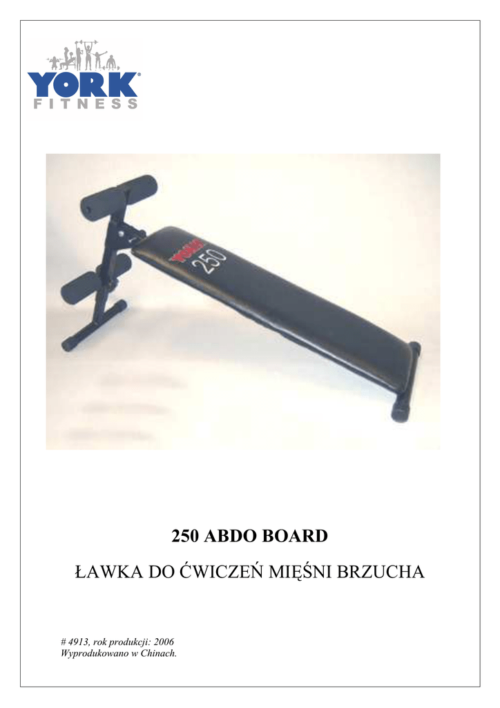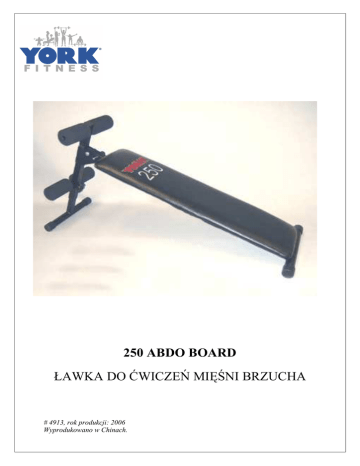 250 ABDO BOARD ŁAWKA DO ĆWICZEŃ MIĘŚNI BRZUCHA # 4913, rok produkcji: 2006 Wyprodukowano w Chinach. UWAGA: ŁAWKA 250 ABDO BOARD PRZEZNACZONA JEST WYŁĄCZNIE DO UśYTKU DOMOWEGO KLASA H. PRZED MONTAśEM ŁAWKI I ROZPOCZĘCIEM ĆWICZEŃ NALEśY ZAPOZNAĆ SIĘ Z NINIEJSZĄ INSTRUKCJĄ ORAZ PRZESTRZEGAĆ ZAWARTYCH W NIEJ WSKAZÓWEK. OSTRZEśENIE: 1. Rodzice oraz inne osoby opiekujące się dziećmi muszą być świadome odpowiedzialności, poniewaŜ naturalny instynkt zabawy wśród dzieci oraz ich zamiłowanie do eksperymentowania moŜe doprowadzić do sytuacji i zachowań, do których sprzęt treningowy nie jest przeznaczony! 2. NaleŜy uwzględnić poziom rozwoju fizycznego i psychicznego dzieci, a przede wszystkim ich temperament, jeśli pozwala się im na korzystanie ze sprzętu. Dzieci muszą być bezpośrednio nadzorowane i pouczane o prawidłowym uŜytkowaniu sprzętu. W Ŝadnym wypadku sprzęt nie jest zabawką dla dzieci! UWAGA: - MAKSYMALNE OBCIĄśENIE ŁAWKI TO 110 kg! Przed złoŜeniem ławki 250 ABDO BOARD zapoznaj się dokładnie z niniejszą instrukcją obsługi. Składaj ławkę na poziomej, równej powierzchni. Wymagane narzędzia to 2 płaskie klucze 14 mm oraz 2 klucze wielofunkcyjne. -2- Ławka 250 MONTAś ŁAWKI: 1. Wsuń przedni wspornik do „tuby regulacyjnej” i zamocuj drąŜek („dolny”), na który wkłada się gąbki (rolki). Dokręć śrubę regulacyjną. Wsuń na drąŜek gąbkowe rolki. Wsuń górny drąŜek w otwór „tuby regulacyjnej”, załóŜ gąbkowe rolki i zabezpiecz ich końce zaślepkami. -3- -3- Ławka 250 2. Zamocuj kompletny przedni wspornik do szyny głównej z oparciem. Do zamocowania uŜyj: śrubę z łbem sześciokątnym, 2 podkładki oraz nakrętkę samoblokującą. Po skręceniu nakrętkę „maskuje” się zakładając plastikową nasadkę. Dodatkowo połączenie to zabezpiecza się (jeśli ławka ma być rozłoŜona) przetyczką (metalowy bolec), którą umieszcza się w drugim otworze (obok śruby mocującej). KONSERWACJA: Do czyszczenia tapicerki ławki uŜywaj wilgotnej bawełnianej szmatki. -4- Ławka 250 ZALECENIA: Przed rozpoczęciem treningu naleŜy udać się na wizytę do lekarza specjalisty celem uzyskania zgody na wykonywanie tego rodzaju ćwiczeń! Zawsze przed rozpoczęciem ćwiczeń sprawdź stabilność ławki oraz dokręcenie wszystkich śrub (takŜe, czy jest ona kompletna!). W celu zminimalizowania ryzyka zranienia UŜytkownika naleŜy wymienić wszystkie części, co do których istnieje podejrzenie uszkodzenia, na nowe oryginalne! Nie zaleca się ćwiczyć z obciąŜeniem samemu! Zawsze powinien znajdować się ktoś w pobliŜu, by pomóc w przypadku trudności. Ćwiczyć naleŜy w odpowiednim, sportowym stroju. Dzieci nie powinny przebywać w pobliŜu ławki, zarówno podczas jak i po zakończeniu ćwiczeń. Nie naleŜy jeść bezpośrednio przed ćwiczeniami (szczególnie duŜych posiłków). Zawsze rozgrzewaj się przed rozpoczęciem ćwiczeń, minimalizuje to ryzyko naderwania mięśni. Ćwiczenia naleŜy wykonywać bez biŜuterii, łańcuszków, itp. Zawsze ustawiaj ławkę na płaskiej równej powierzchni. Wokół ławki powinno być wystarczająco duŜo miejsca – minimum 60 cm z kaŜdej strony. NaleŜy szczególnie dokładnie sprawdzać elementy regulacyjne i podzespoły umoŜliwiające złoŜenie ławki – na bieŜąco kontrolować ich zuŜycie! NaleŜy ćwiczyć w sposób prawidłowy (zgodnie z zaleceniami lekarza specjalisty oraz trenera), zwracając uwagę na właściwą pozycję treningową. Urazy sportowe są między innymi wynikiem niewłaściwej pozycji ćwiczebnej oraz zbyt duŜej intensywności treningu. Przed rozpoczęciem ćwiczeń upewnij się, Ŝe selektor blokujący ustawienie ławki w pozycji rozłoŜonej jest prawidłowo ustawiony (nie jest wysunięty!). -5 - Ławka 250 KORZYSTANIE Z ŁAWKI „250 ABDO BOARD” - Wykonuj ruchy płynnie, bez nagłych szarpnięć ani skrętów. Przez cały czas wykonywania ćwiczeń kontroluj oddychanie, nie wstrzymuj powietrza! Skłon rozpoczynaj od ruchu barków, zaraz potem unoś plecy. Podnoś tułów maksymalnie do kąta 30º (kąt pomiędzy plecami a oparciem), zatrzymaj na moment ruch, a potem powoli opuszczaj tułów. Jeśli chcesz, moŜesz ćwiczyć trzymając ręce na karku, podtrzymując głowę, jednak nie naciskaj rękoma na kark (nie zginaj go!). Podczas ćwiczeń utrzymuj podbródek z dala od klatki piersiowej (głowa i szyja w przedłuŜeniu tułowia). Nie odchylaj głowy do tyłu. Podczas ćwiczeń staraj się utrzymywać kręgosłup w pozycji neutralnej („plecy prosto”). Trening kończ rozciągając mięśnie brzucha. MoŜesz w tym celu wykorzystać ćwiczenie wzmacniające mięśnie pleców – wznosy tułowia w pozycji leŜenia na brzuchu (skonsultuj z lekarzem, trenerem). Na poniŜszych zdjęciach zaproponowano wykonywanie ćwiczeń wzmacniających mięśnie brzucha z róŜnym ułoŜeniem ramion, dla osoby: początkującej, średnio zaawansowanej i zaawansowanej. -6 - Ławka 250 1. SKŁONY PołóŜ się na ławce, opierając stopy płasko na podłoŜu, plecy powinny pewnie spoczywać na oparciu (patrz rycina). Ręce ułóŜ w pozycji, która zapewni prawidłowe wykonanie ćwiczenia (patrz wskazówki ze strony 3). Utrzymując głowę w przedłuŜeniu tułowia, unoś tułów w górę (rozpoczynając ruch od barków) maksymalnie do kąta 30º (między oparciem a tułowiem), a następnie powoli opuszczaj tułów do pozycji początkowej. Podczas wykonywania ćwiczeń nie wstrzymuj oddechu! 2. SKŁONY – ĆWICZENIE DLA OSÓB ZAAWANSOWANYCH PołóŜ się na ławce, tak by dolna część pleców dobrze przylegała do oparcia (patrz rycina). MoŜesz regulować wysokość ławki poprzez zmianę ustawienia przedniego wspornika (po odkręceniu blokady). To pomoŜe w ustawieniu komfortowej pozycji, „bezpiecznej” dla Twojego kręgosłupa. Ręce ułóŜ w pozycji, która zapewni prawidłowe wykonanie ćwiczenia (wskazówki ze stron