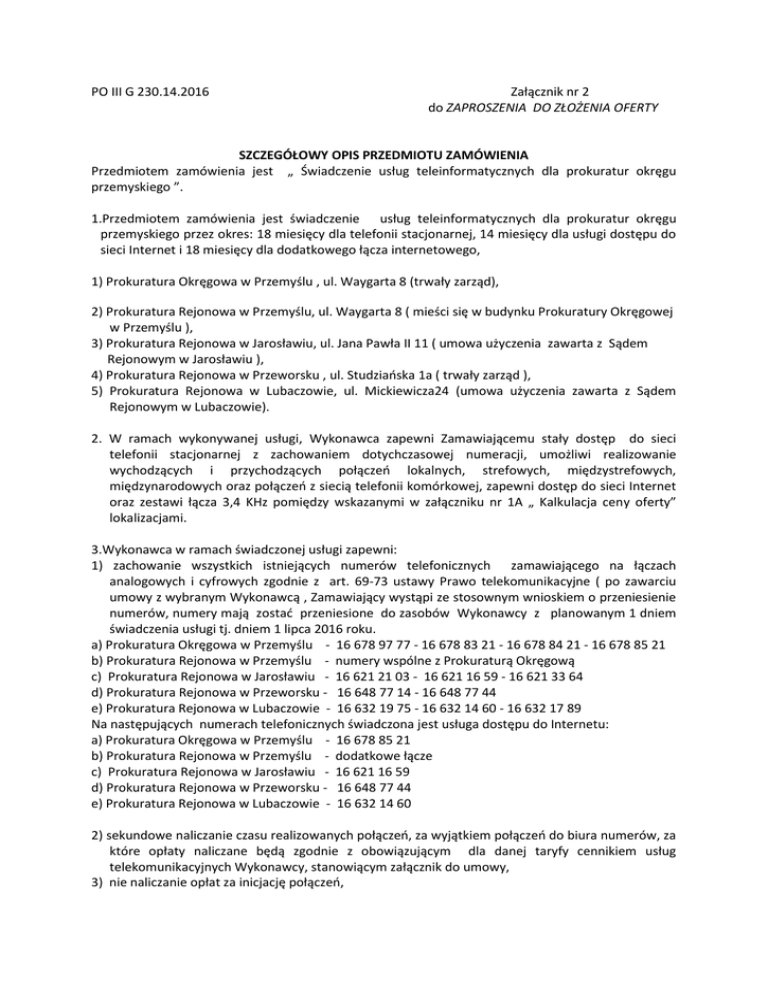 PO III G 230.14.2016 Załącznik nr 2 do ZAPROSZENIA DO ZŁOŻENIA OFERTY SZCZEGÓŁOWY OPIS PRZEDMIOTU ZAMÓWIENIA Przedmiotem zamówienia jest „ Świadczenie usług teleinformatycznych dla prokuratur okręgu przemyskiego ”. 1.Przedmiotem zamówienia jest świadczenie usług teleinformatycznych dla prokuratur okręgu przemyskiego przez okres: 18 miesięcy dla telefonii stacjonarnej, 14 miesięcy dla usługi dostępu do sieci Internet i 18 miesięcy dla dodatkowego łącza internetowego, 1) Prokuratura Okręgowa w Przemyślu , ul. Waygarta 8 (trwały zarząd), 2) Prokuratura Rejonowa w Przemyślu, ul. Waygarta 8 ( mieści się w budynku Prokuratury Okręgowej w Przemyślu ), 3) Prokuratura Rejonowa w Jarosławiu, ul. Jana Pawła II 11 ( umowa użyczenia zawarta z Sądem Rejonowym w Jarosławiu ), 4) Prokuratura Rejonowa w Przeworsku , ul. Studziańska 1a ( trwały zarząd ), 5) Prokuratura Rejonowa w Lubaczowie, ul. Mickiewicza24 (umowa użyczenia zawarta z Sądem Rejonowym w Lubaczowie). 2. W ramach wykonywanej usługi, Wykonawca zapewni Zamawiającemu stały dostęp do sieci telefonii stacjonarnej z zachowaniem dotychczasowej numeracji, umożliwi realizowanie wychodzących i przychodzących połączeń lokalnych, strefowych, międzystrefowych, międzynarodowych oraz połączeń z siecią telefonii komórkowej, zapewni dostęp do sieci Internet oraz zestawi łącza 3,4 KHz pomiędzy wskazanymi w załączniku nr 1A „ Kalkulacja ceny oferty” lokalizacjami. 3.Wykonawca w ramach świadczonej usługi zapewni: 1) zachowanie wszystkich istniejących numerów telefonicznych zamawiającego na łączach analogowych i cyfrowych zgodnie z art. 69-73 ustawy Prawo telekomunikacyjne ( po zawarciu umowy z wybranym Wykonawcą , Zamawiający wystąpi ze stosownym wnioskiem o przeniesienie numerów, numery mają zostać przeniesione do zasobów Wykonawcy z planowanym 1 dniem świadczenia usługi tj. dniem 1 lipca 2016 roku. a) Prokuratura Okręgowa w Przemyślu - 16 678 97 77 - 16 678 83 21 - 16 678 84 21 - 16 678 85 21 b) Prokuratura Rejonowa w Przemyślu - numery wspólne z Prokuraturą Okręgową c) Prokuratura Rejonowa w Jarosławiu - 16 621 21 03 - 16 621 16 59 - 16 621 33 64 d) Prokuratura Rejonowa w Przeworsku - 16 648 77 14 - 16 648 77 44 e) Prokuratura Rejonowa w Lubaczowie - 16 632 19 75 - 16 632 14 60 - 16 632 17 89 Na następujących numerach telefonicznych świadczona jest usługa dostępu do Internetu: a) Prokuratura Okręgowa w Przemyślu - 16 678 85 21 b) Prokuratura Rejonowa w Przemyślu - dodatkowe łącze c) Prokuratura Rejonowa w Jarosławiu - 16 621 16 59 d) Prokuratura Rejonowa w Przeworsku - 16 648 77 44 e) Prokuratura Rejonowa w Lubaczowie - 16 632 14 60 2) sekundowe naliczanie czasu realizowanych połączeń, za wyjątkiem połączeń do biura numerów, za które opłaty naliczane będą zgodnie z obowiązującym dla danej taryfy cennikiem usług telekomunikacyjnych Wykonawcy, stanowiącym załącznik do umowy, 3) nie naliczanie opłat za inicjację połączeń, 4) bezpłatne ograniczenie ruchu wyjściowego polegające na blokowaniu wybranych przez Zamawiającego połączeń wychodzących zaczynających się np. na 700 przy zachowaniu możliwości bezpłatnego odblokowania w/w usługi. 5) comiesięczne dostarczanie nieodpłatnie z każdą fakturą bilingu ( w formie elektronicznej ) tj. wykazu wykonanych połączeń telefonicznych z podaniem dla każdego typu połączenia, numeru wywołanego, daty, godziny rozpoczęcia połączenia oraz czasu jego trwania i wysokość opłat, 6) comiesięczne przesyłanie wraz z fakturą raportu o stanie realizacji umowy, poprzez podanie procentowego i wartościowego wykorzystania kwoty związanej z maksymalną wartością umowy, 7) bezpłatne połączenia do biura napraw i na numery alarmowe, 8) nieodpłatne usługi dodatkowe, przewidziane dla usług będących przedmiotem niniejszego zamówienia pozostające w ofercie Wykonawcy, 9) zapewnienie możliwości wykonywania połączeń międzynarodowych zgodnie z cennikiem usług telekomunikacyjnych Wykonawcy, który będzie stanowił załącznik do umowy, 10) nieodpłatne usuwanie awarii w ciągu 1-go dnia roboczego od zgłoszenia. 11) świadczenie usługi dostępowej do sieci Internet o prędkości transmisji min. upload 1Mbit/s 12) min. 4 adresy IP do sieci Internet 13) zestawienie łączy 3,4 KHz w lokalizacjach wymienionych w załączniku nr 1A „ kalkulacja ceny oferty” 4. Oferowane usługi winny spełniać wymagania określone w ustawie Prawo Telekomunikacyjne, w szczególności świadectwo homologacji, certyfikat zgodności, znak zgodności lub deklarację zgodności z zasadniczymi wymaganiami lub świadectwo homologacji wydane przez uprawniony organ lub jego producenta. 5. Okresem rozliczeniowym dla świadczonych usług ustala się okres jednego miesiąca kalendarzowego, w przypadku świadczenia usługi przez niepełny miesiąc kalendarzowy , opłata abonamentowa będzie naliczana za każdy dzień w wysokości odpowiadającej 1/30 opłaty abonamentowej. 6. Obecnie usługi teleinformatyczne świadczone są przez wykonawcę ; Orange S.A. z siedzibą w Warszawie, (02-326), Al. Jerozolimskie 10. 7. Nomenklatura według CPV: 64200000-8 ( usługi telekomunikacyjne ) CPV:72400000-4 ( usługi internetowe ) 8.Termin wykonania zamówienia: 1) Zamówienie realizowane będzie przez okres 18 miesięcy dla telefonii stacjonarnej, 14 miesięcy dla usługi dostępu do sieci Internet i 18 miesięcy dla dodatkowego łącza internetowego - od dnia uruchomienia usługi, lub do wyczerpania wartości umownej z następującymi zastrzeżeniami: a) rozpoczęcie świadczenia usługi telefonii stacjonarnej nastąpi od dnia 01 lipca 2016 roku, dostępu do sieci Internet od dnia 1 listopada 2016 roku, dodatkowego łącza internetowego od dnia 1 lipca 2016r. z upływem skutecznego rozwiązania dotychczasowych umów, b) data rozpoczęcia będzie liczona od godziny 0:00 danego dnia ustalonego przez Strony, c) zak